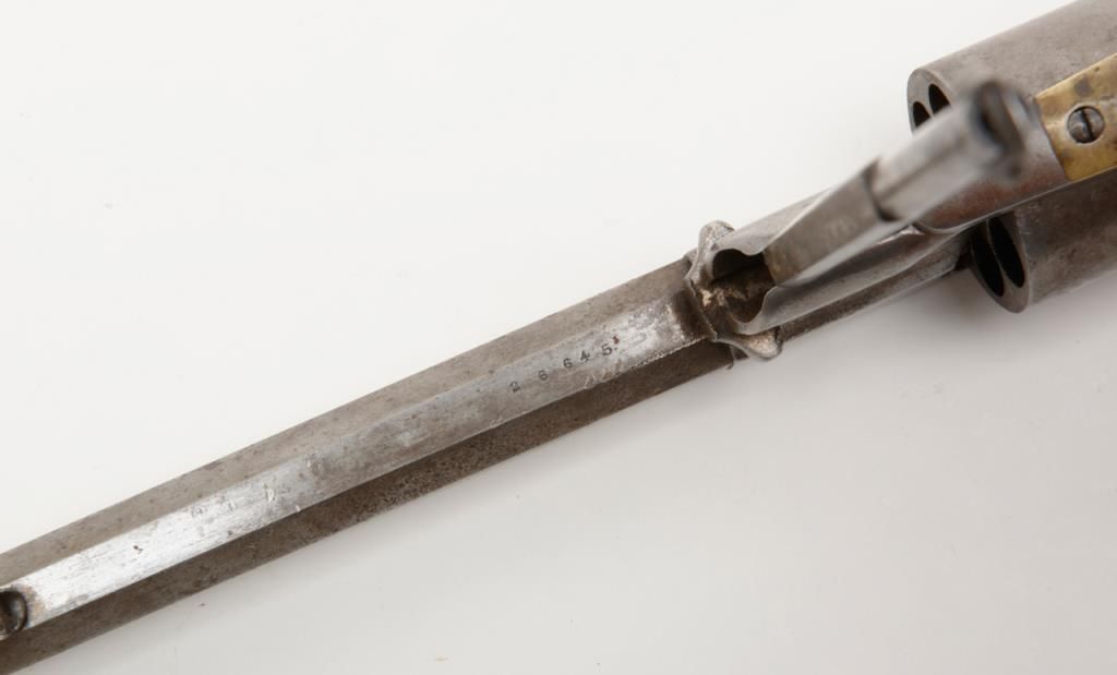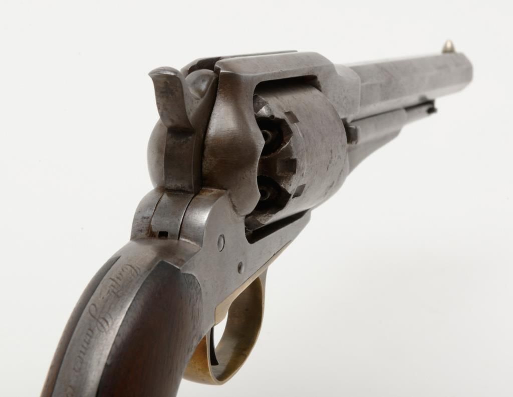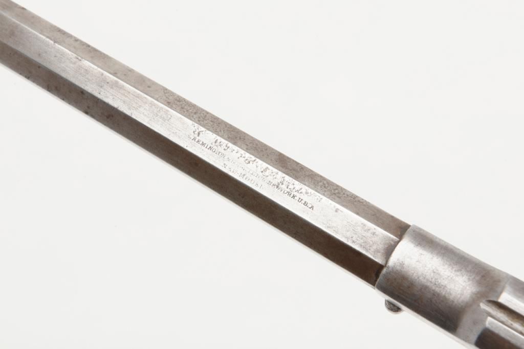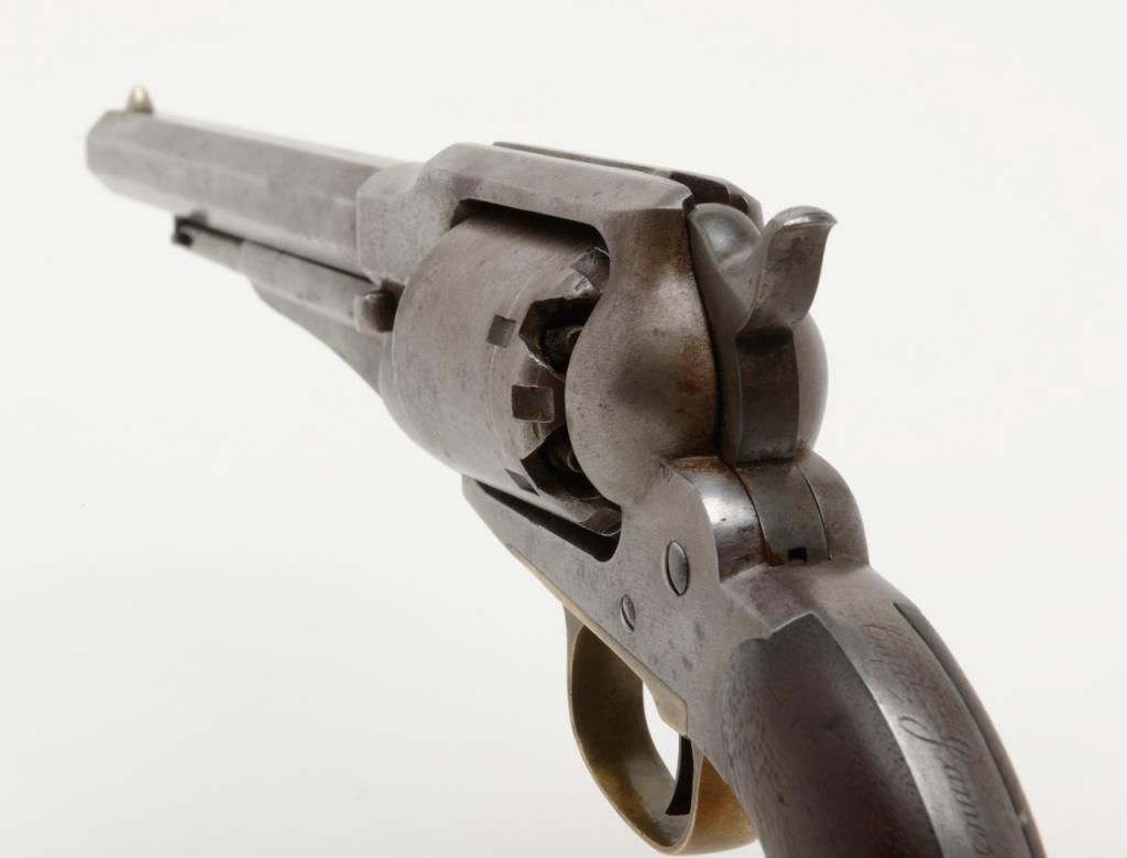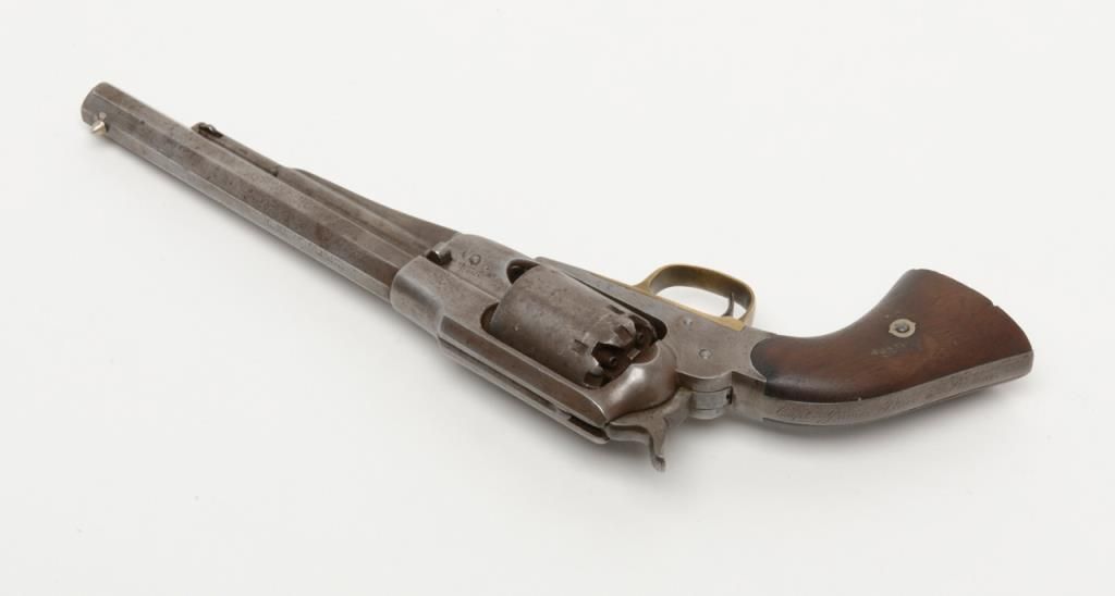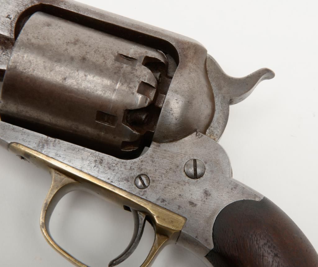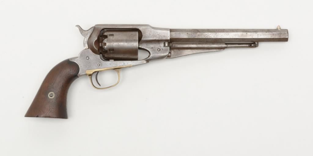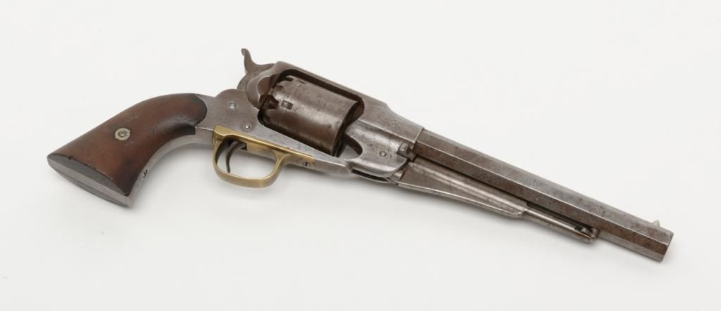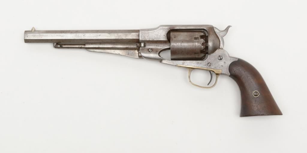 Remington Model 1858 New Model .44 caliber percussion revolver period script inscribed “Capt. James Starr, 6th Pennsylvania Cavalry” on the back strap, serial number 26645. The metal surfaces show a gray to brown patina finish withscattered light to moderate erosion and pinprick pitting. The grips show a faint trace of the outline of a cartouche with some small losses at the edges and even wear. The revolver shows P and W inspections. The action is good. The bore isfair to good with wear to the rifling but still clean. The 6th Pennsylvania cavalry was also known as Rush’s lancers. A large binder of information on this officer and unit is included. Capt. Starr rose in the ranks to brevet Colonel and servedwith distinction at the battle of the Wilderness, Virginia along with many other engagements. This Remington is consigned from a well-known southern California historical arms collector and the inscription is absolutely genuine to the 19thcentury. Est.: $3,000-$6,000