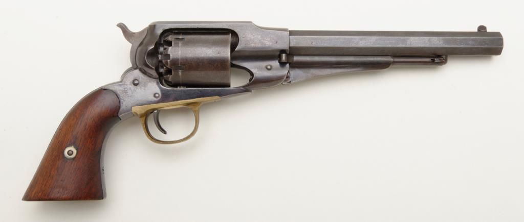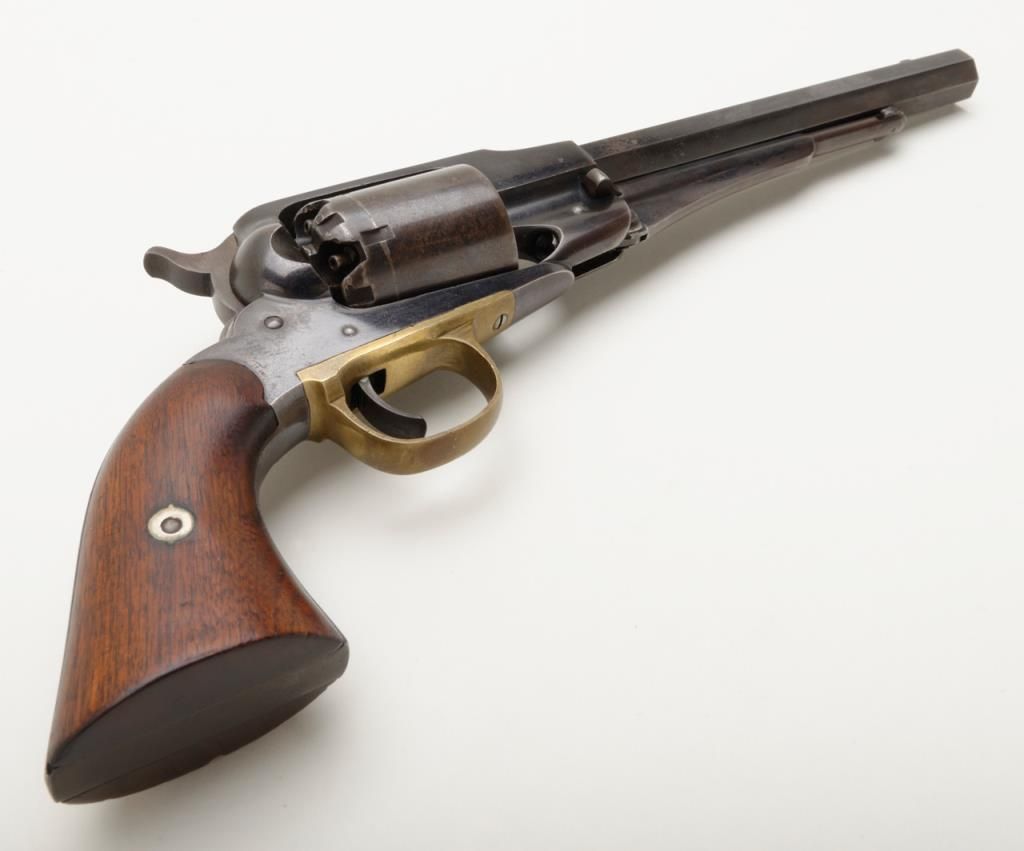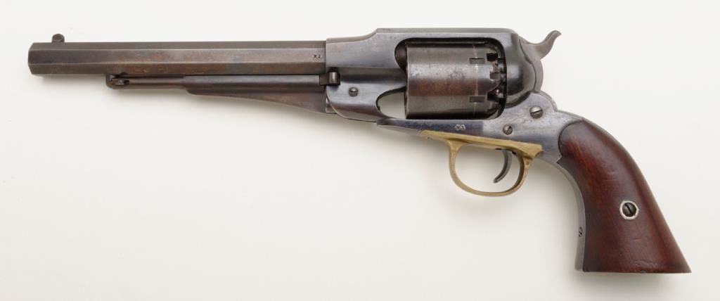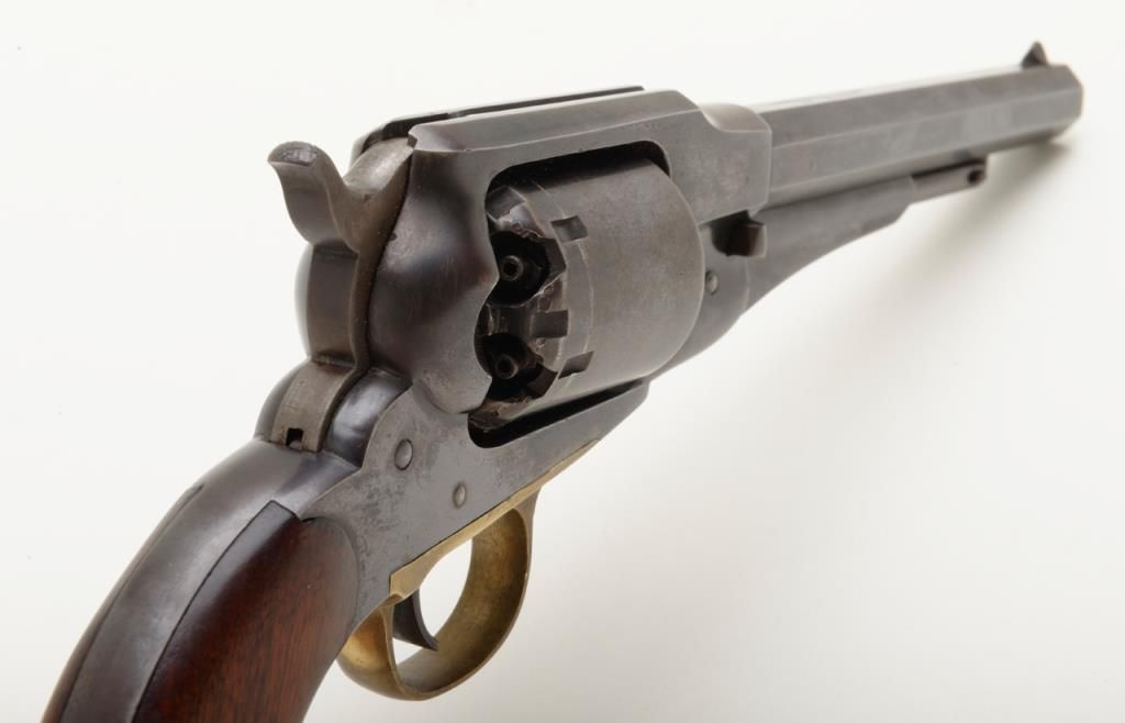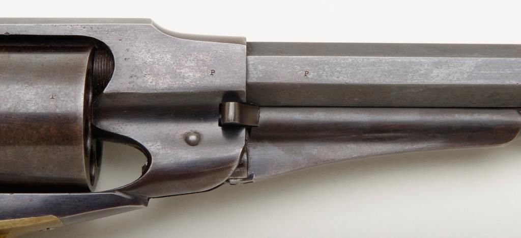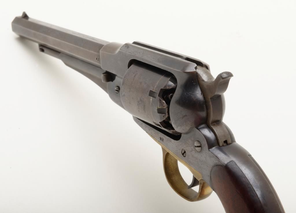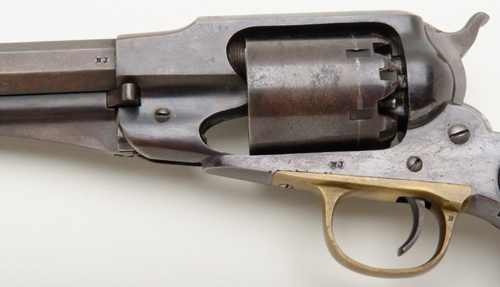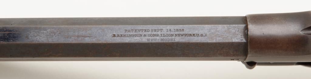 Remington Model 1858 New Model percussion revolver with New Jersey state markings remaining in near fine original condition, serial number 71148. The Remington shows 60% to 80% original blue with some drifting and toning to a light brown patina where the bright blue is lost. The barrel address is sharp and clear. The grips are very good plus with a few bumps at the edges and minor evidence of use. The hammer shows 50% to 70% dulling original case hardening. The bore is excellent and bright, this revolver has seen very little to almost no use. A strong 8.5 on a 1 to 10 scale. New Jersey state purchased the model 1858 for issue to their militia and state units during the Civil War. Est.: $1750-$3500.