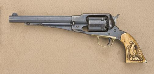 Remington Model 1858 Single Action revolver, .44 cal., 8” octagon barrel, blue finish, original period raised carved Mexican snake and eagle ivory grips, #30434. This gun is in overall fine to excellent condition showingapprox. 85% original blue finish, fine bore, crisp action, sharp markings, old replaced front sight; beautiful raised carved Mexican snake and eagle ivory grips with classic graining and old age cracklature; one smallrepair on the back toe of the left grip; a great looking Remington. Est.: $3,000-$6,000.
