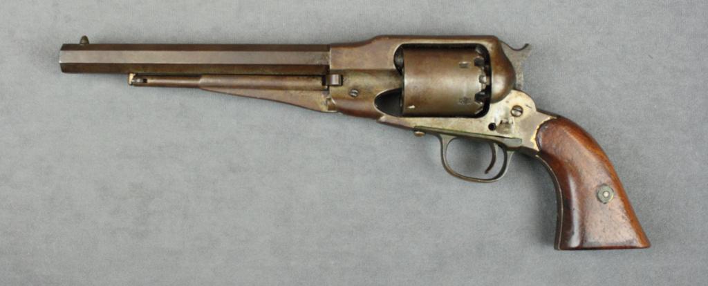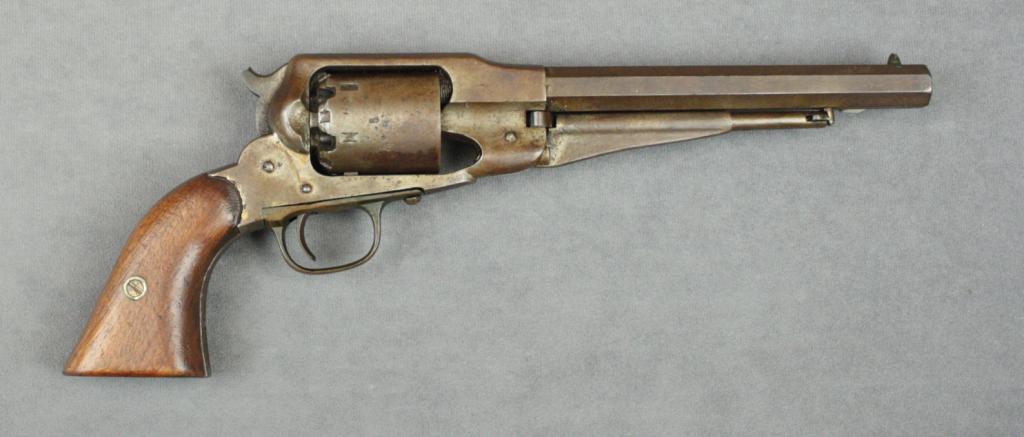 Remington Model 1858 single action percussion  revolver, .44 cal., 8” octagon barrel, wood  grips, #NVSN.  This gun is in overall fair  condition showing a brown patina on metal  surfaces and what appears to be an old bullet strike on the left side of the frame above  the trigger guard; action is good, bore is  dark, wood grips are an older replacement;  brass trigger guard screw is an old  replacement; hammer spur has been broken off.  Est.:  $125-$250.