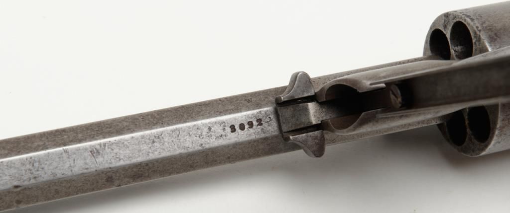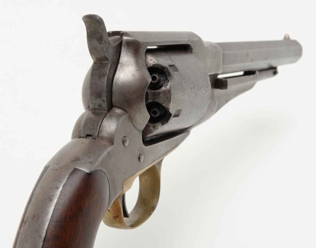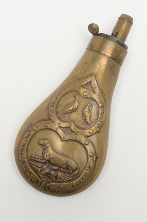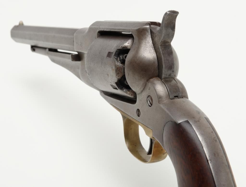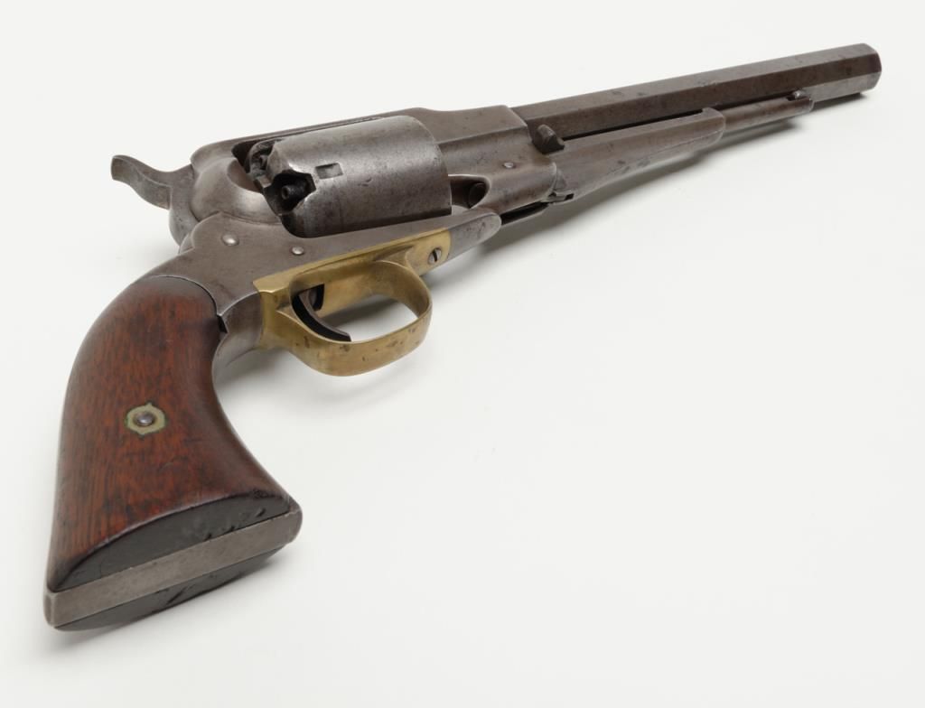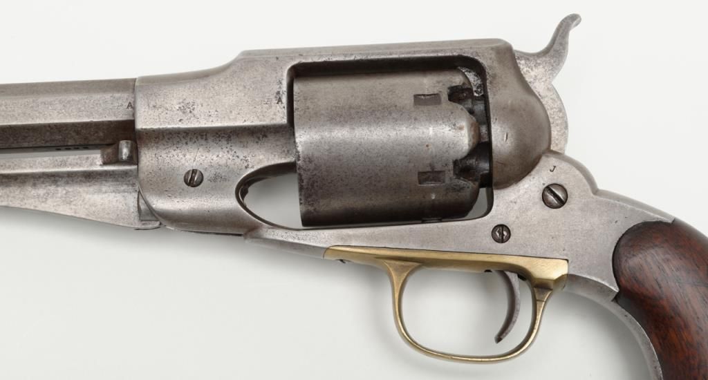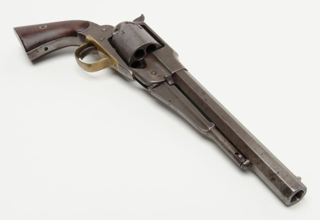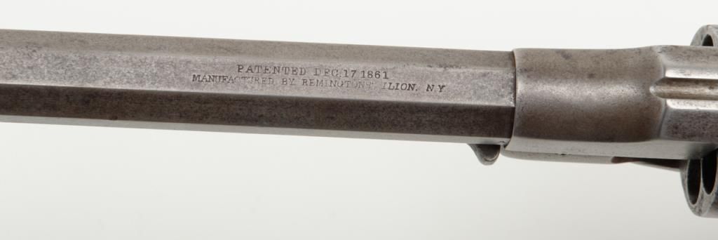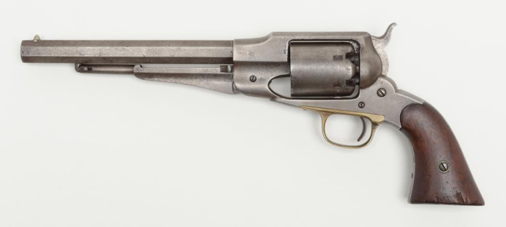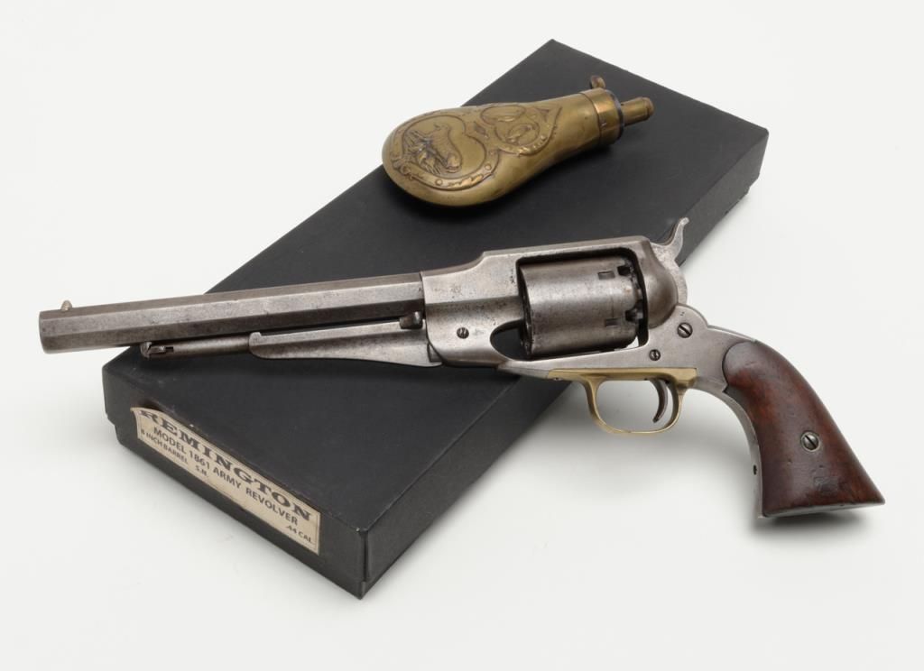 Remington Model 1861 Army percussion revolver, .44 cal., 8” octagon barrel, wood grips, #3092 in overall very good condition showing an even grey patina on metal surfaces, good action, and markings, fair to good bore, good grips withvisible inspector’s cartouche on left grip and some old chips to that grip and old knackering to the bottom of the grips; inspector initials as follows: J on left side of frame above hammer screw, SA on cylinder between two nipple wells, PA on left side of frame at cylinder well and on left barrel flat at breech and an S on the brass trigger guard behind the securing screw; accompanied by a two piece cardboard box with end label reading “REMINGTON MODEL 1861 ARMY REVOLVER” and containing a brass powder flask with dog and game bird scenes. (Antique). Est.: $1,500-$3,000.