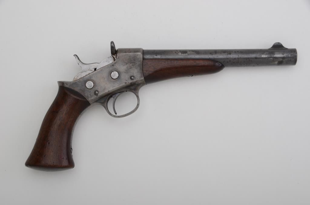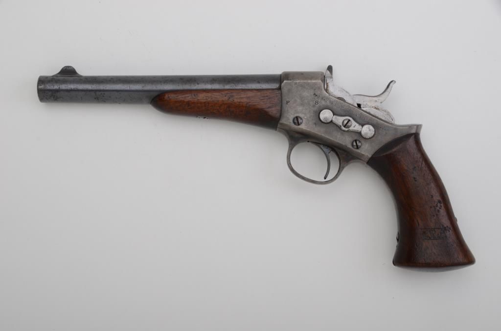 Remington Model 1871 Army Rolling Block single shot pistol, .50 cal., 8” barrel, blue and case hardened finish, wood grip and fore end, CRS inspector’s cartouche on left side of grip, #NVSN. This gun is in overall verygood condition showing approx. 30% muted original blue on barrel and considerable muted original case colors on the frame, good bore, crisp action and good markings; grips show some scattered old mars on the left side of the grip, a couple on the right side and a chip to the front of the butt of the grip; inspector’s cartouche is crisp. Est.: $1,250-$2,500.