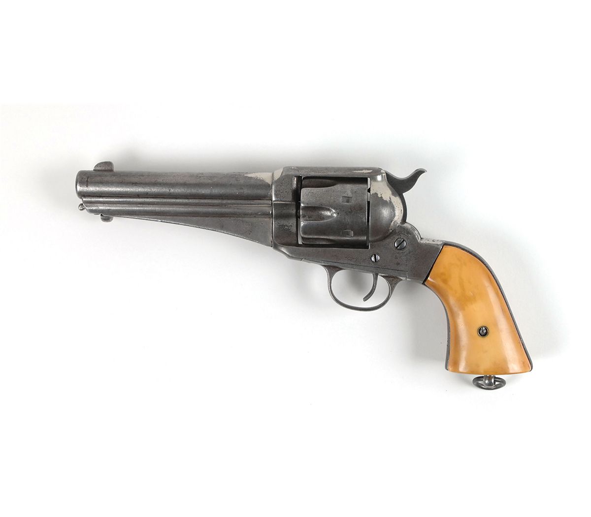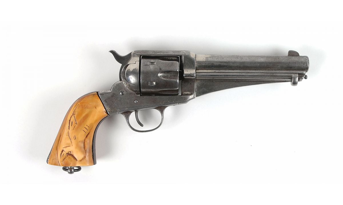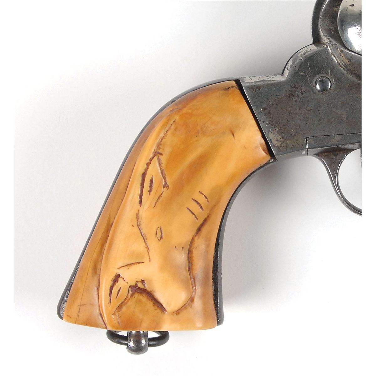 #9019, the caliber is not marked but is believed to be .44-40 W.C.F. (have your gunsmith verify), 5.5? barrel, fair bore. The metal retains about 10% original nickel-plating with the balance having a smooth dark gray patina, the barrel address is clear except that a tarnished sterling lozenge is inlaid at the front of the address. This inlay has a monogram that has not been deciphered, possibly a cattle brand, and has the stamped numerals “83” in front of it. The ivory grips have a carved steer head on the right side, are pencil numbered to the gun, have slightly shrunk and have a burnt umber patina. The butt has a lanyard swivel. The first two hammer notches are worn and the cylinder doesn’t fully index with the hammer.