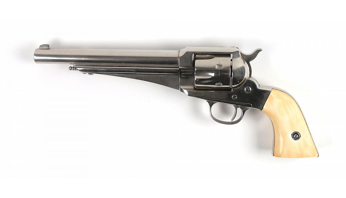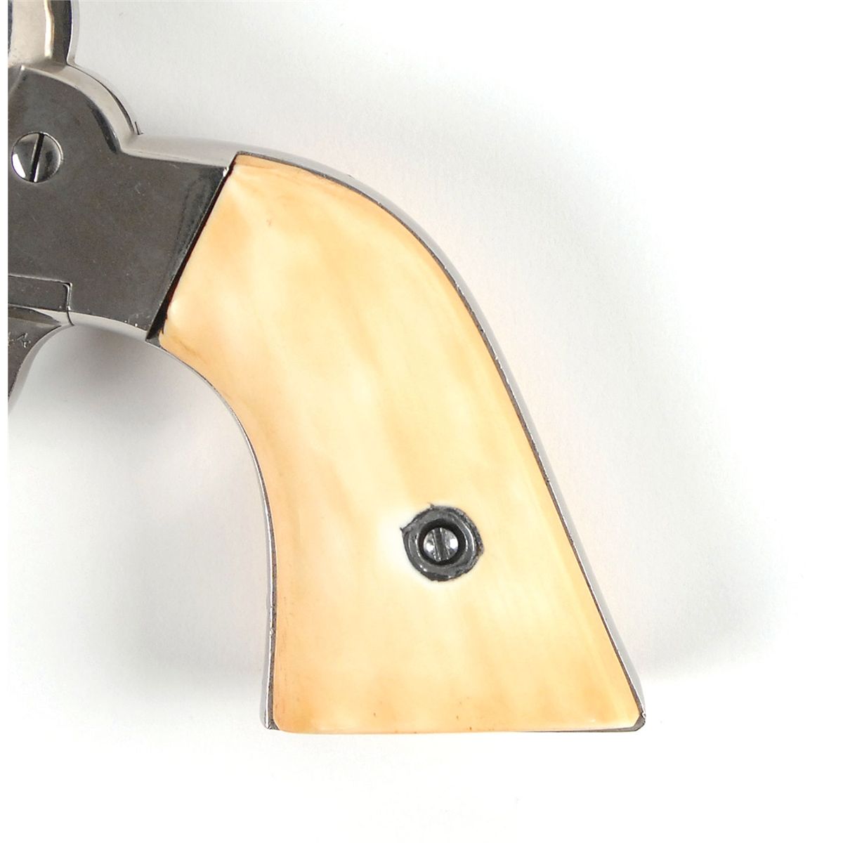 #779, cal. 44-40 W.C.F., 7.25? barrel (this was shortened .25? to clean up the muzzle), the bore is very good. The metal retains 99% of a good looking nickel-plated refinish with the factory markings in excellent condition. The ivory grips are old but not original to the gun, they are in fine condition and show attractive age toning—they need a slightly longer grip screw. The hammer safety notch has light wear, otherwise the mechanical function is fine.