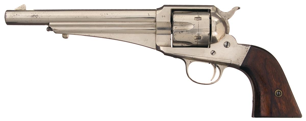 Approximately 25,000 Model 1875's were manufactured between 1875 and 1889. The Model 1875 was Remington's attempt to compete with the Colt Single Action Army revolver, but Remington lacked the advantage of Colt's early start in government sales. Marked "E. REMINGTON & SONS. ILION. N.Y. U.S.A" on top of the barrel reading muzzle to breech. The serial number is marked on the left side of the grip frame under the grip. The upper left side of the frame ahead of the cylinder is marked "44", the marking for 44-40 caliber. Modified blade front sight and notch rear sight. Fitted with smooth two piece walnut grips (numbered to the gun).