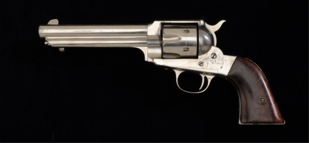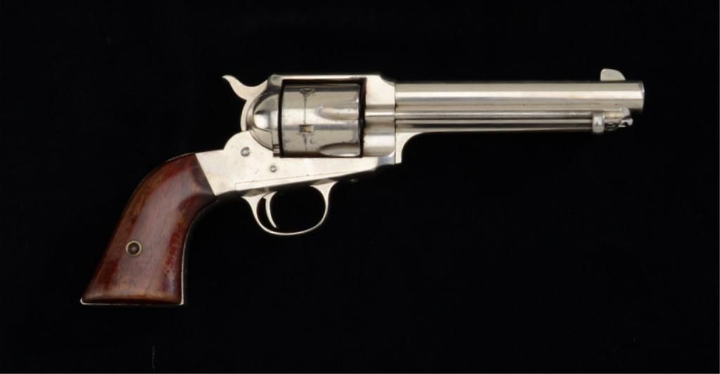 Remington Model 1890, 44-40 cal. single action revolver, nickel plated, factory 5-3/4" barrel wood grips Serial #234. The Remington shows left hand address which is centered 44 on rear of trigger guard at leftside and no lanyard in butt. The revolver shows 90-95% original nickel, some considerable scratches on left side of frame. Losses of finish around edges of frame, front of cylinder and firing areas. Thegrips are good to very good with some edge wear and about 20% finish. The front sight has been reduced slightly, the action is good , the bore is good the ejector-rod housing and pin are all original and this is anauthentic Model 90 in early production range. A solid 8 to 8.5 on 1- 10 scale. Est.; $3,000-$6,000.