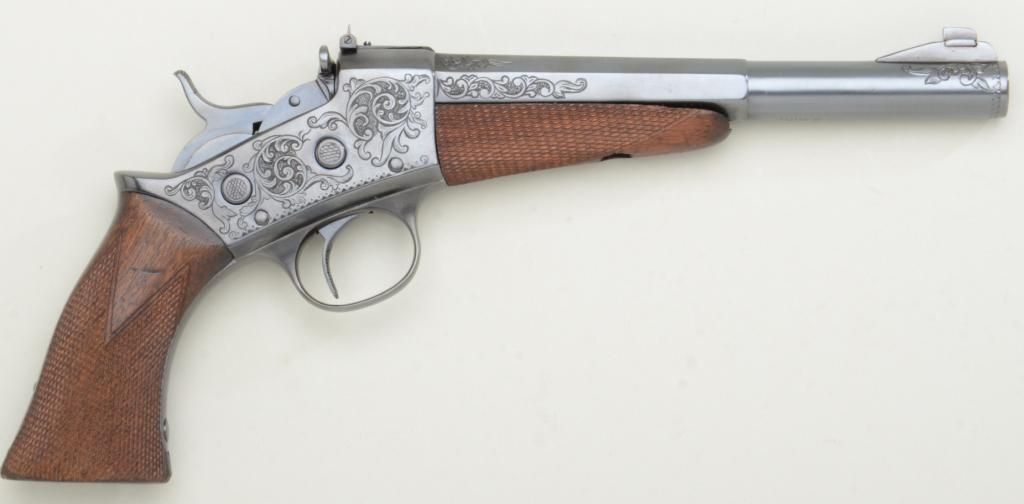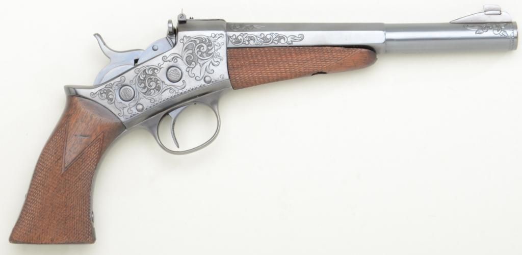 Remington Model 1891, .22 LR cal. single shot pistol, showing 8" half round/half octagon barrel, P and S marked frame indicating military overrun; old scroll engraving, re-blued finish, checkered wood stocks, later target front sight, standard Remington type breech sight. The bottom of the barrel shows Remington 22 LR marking but no Remington address on top. The action is good, the bore excellent, the barrel shows evidence ofbeing sleeved. An interesting old gunsmith's customization. Est.: $2,000-$4,000