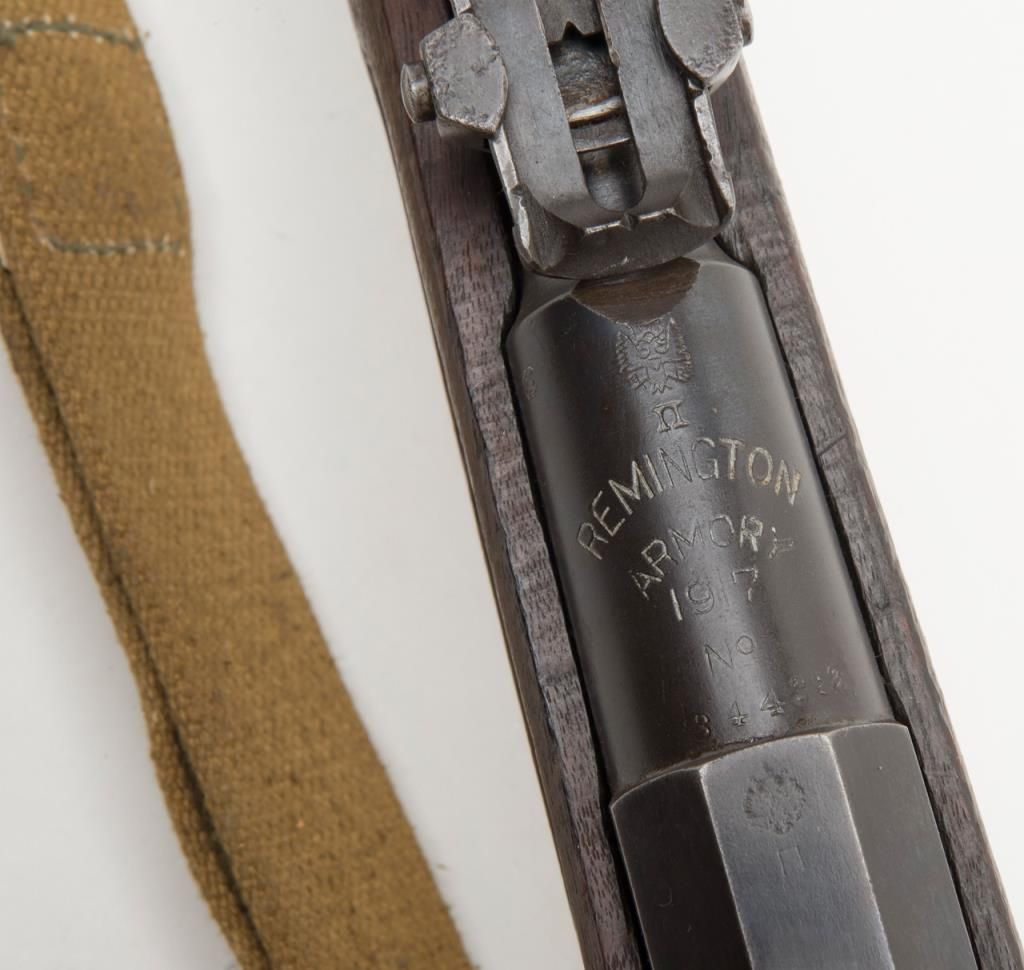 Remington Model 1917 Russian contract Mosin Nagant bolt action rifle, 7.62 X 54Rmm cal., 31-1/2” barrel, blue finish, full length wood stock, tan woven sling, #344352 in overall very good condition, considerable blue finish, remaining,bolt #11191, crisp action, good markings, very good bore, cleaning rod missing, good wood stock with scattered old mars and scratches from carry and storage, magazine floor plate #1319612; sling overall very good. (C&R/PPT). Est.:$175-$350.