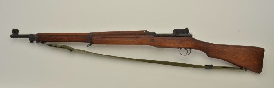 Remington Model 1917 bolt action military rifle, .30-06 cal., 26” Remington barrel dated 4-18, re-parkerized finish, wood stock, green woven sling, cleaning kit in butt trap, #294602 in overall good condition showing considerable military finish to metal surfaces with some areas of light surface rust, bore should clean to good, crisp action, good markings and very good wood stock with minor mars and scratches from carry and storage; accompanied by a tan woven soft carry case stamped “ENGLAND” in fair overall condition showing scattered rust spots and oil staining. Est.: $350-$700.