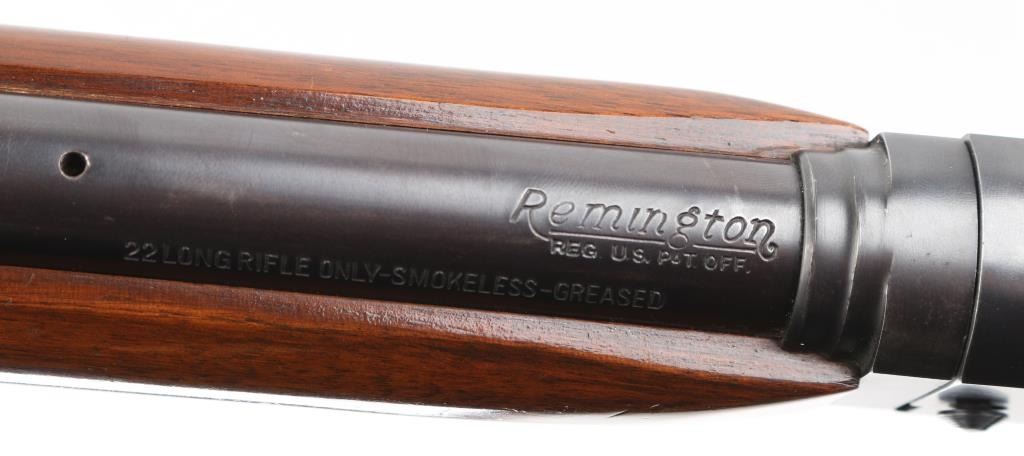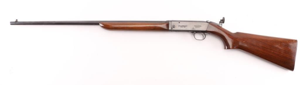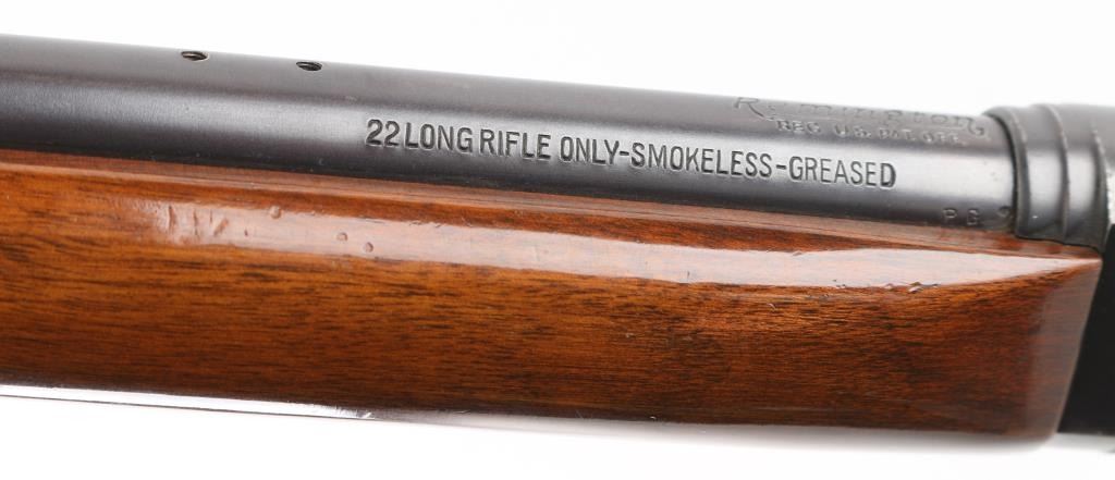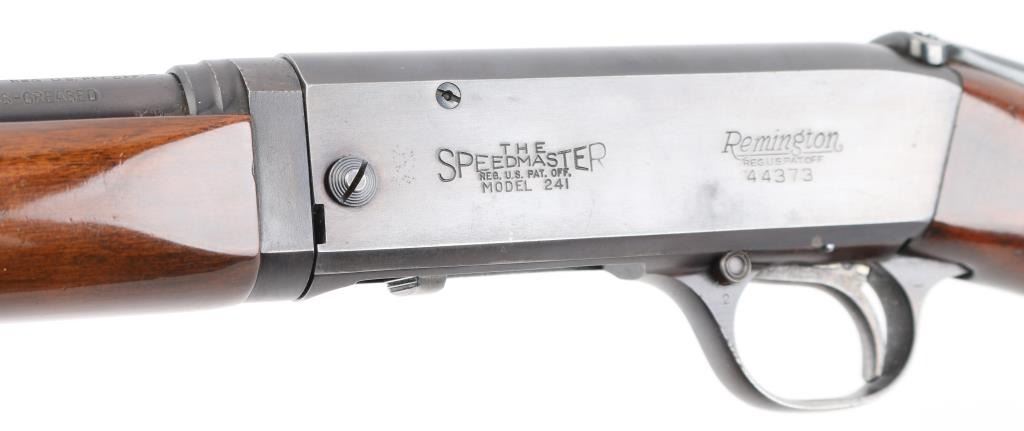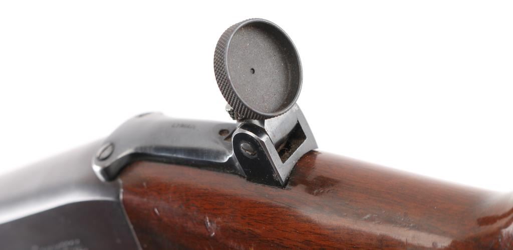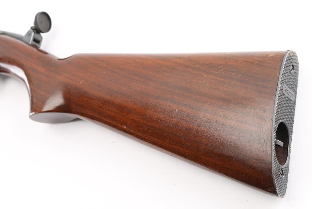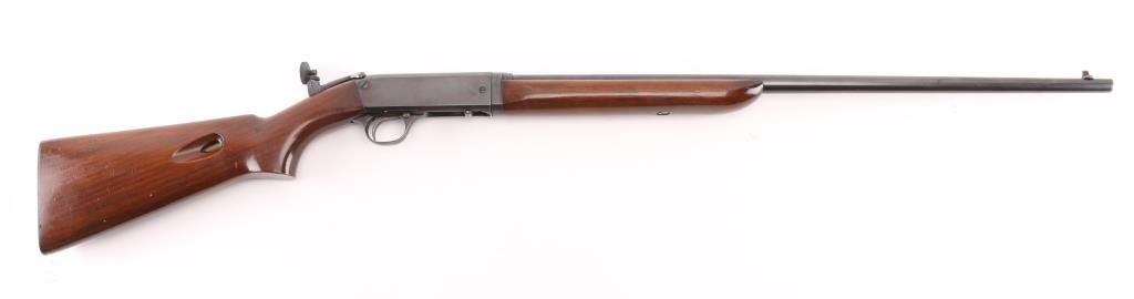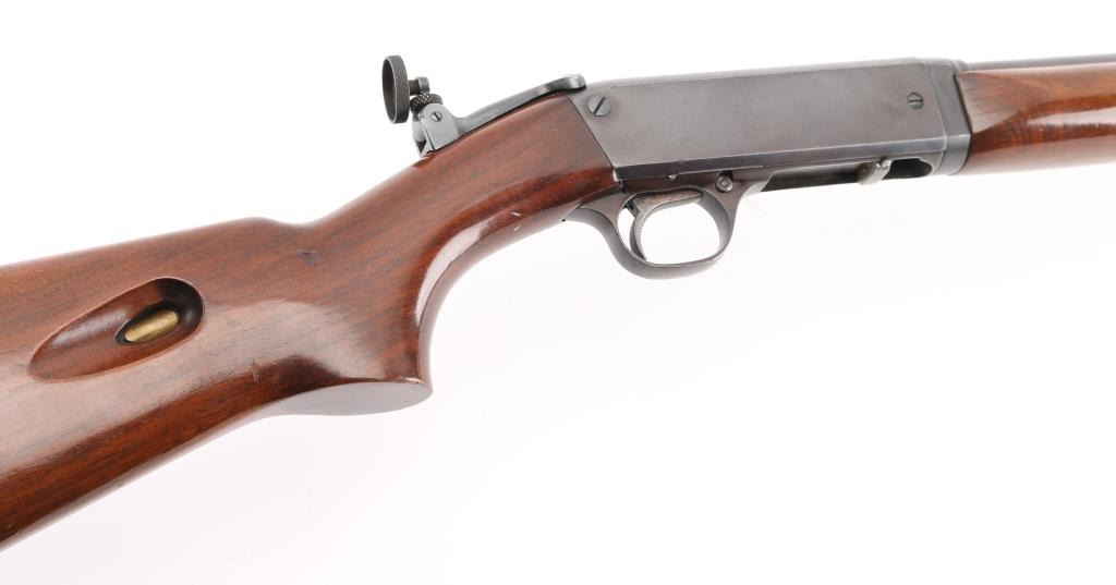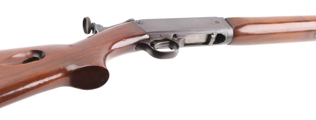 'The Speedmaster' Vintage tube-fed semi automatic sporting rifle chambered in .22 Long Rifle, circa 1938. Barrel marked "22 LONG RIFLE ONLY - SMOKELESS - GREASED". Blued finish, 24" take-down barrel, dovetailed blade/bead front sight, rear sight removed, no filler screws, vintage Lyman peep sight mounted on the rear of receiver, smooth case hardened trigger, push button safety, smooth walnut beavertail forend and pistol grip shoulder stock with loading port & knurled metal factory buttplate. Bore is excellent/bright. Retains about 95% of fading blue finish, some edge wear, rubs on barrel matching serial numbers on barrel, & receiver. Wood is very good, revarnished at some, some minor scratches/dings. Condition is NRA Very Good+ C&R Firearm.