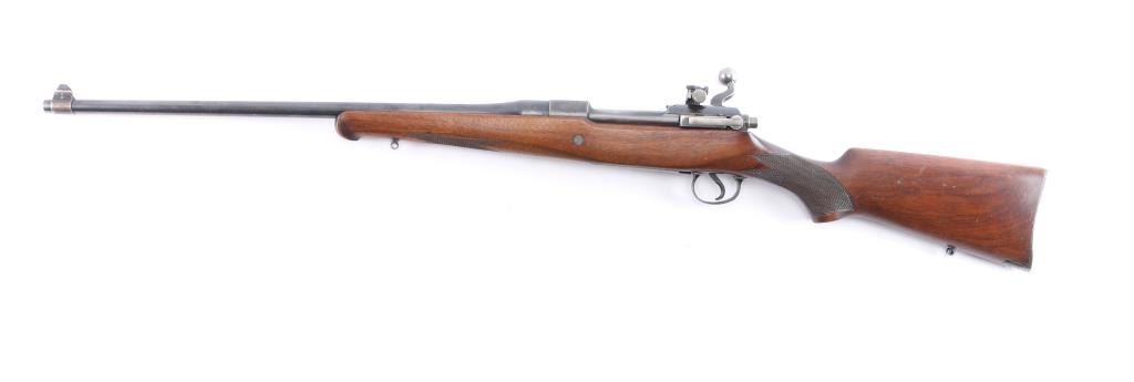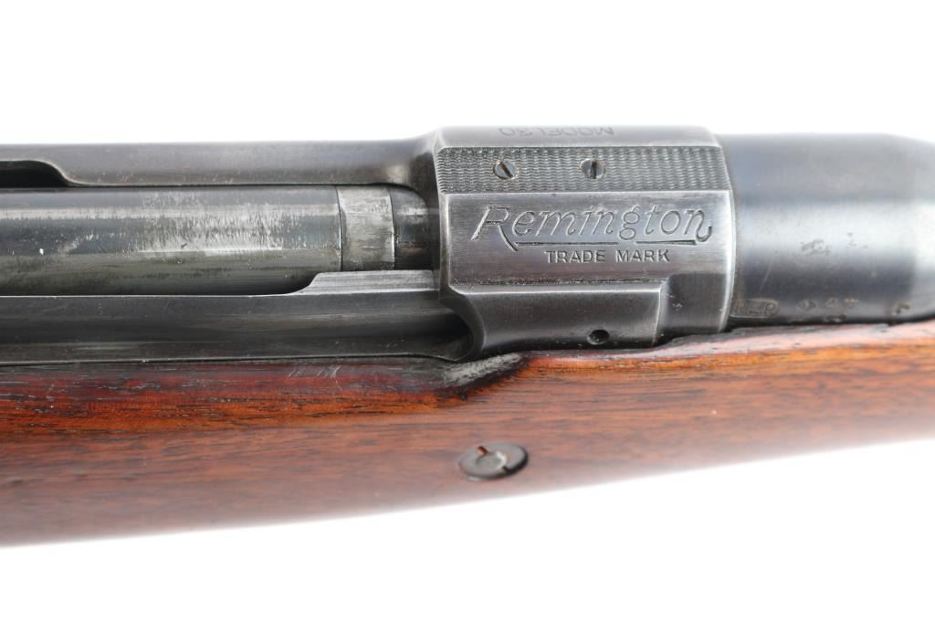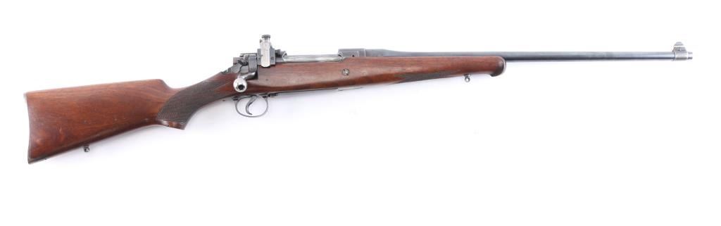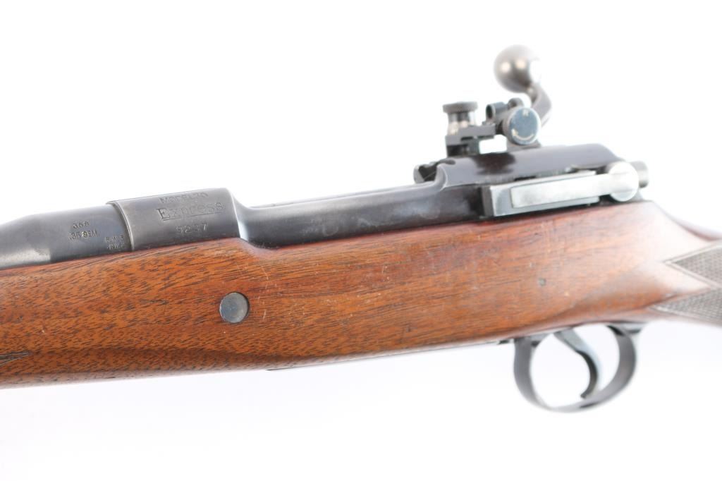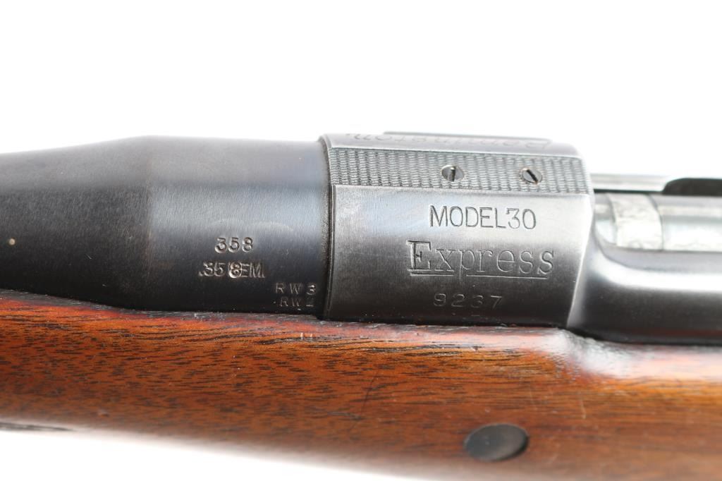'Express,' an early pre-WWII American made bolt-action centerfire sporting rifle chambered for .358 Winchester (originally marked '.35 REM.'), and manufactured in Ilion, NY. This rifle is based from the U.S. made Model 1917, and it was produced from 1927 until 1940. The barrel is marked with 'RW3' and 'RW2' on the left side of the barrel in front of the receiver. Rifle features a blued finish, a 22" barrel, pinned fixed blade front sight with a brass bead, Lyman 48S Springfield Newton adjustable rear sight, receiver drilled and tapped for optic mounting, serrated curved trigger, 'dog leg' style bolt handle, serrated receiver mounted manual safety, receiver mounted bolt release, and stripper clip guides cut into receiver. The hardwood furniture consists of a semi-pistol gripped shoulder stock with checkering at the wrist, a checkered schnabel forend, sling studs in the forend and shoulder stock, and a serrated metal buttplate. The original blued finish retained is approximately 90% with edge wear, light scratches and handling marks, and some general thinning on the front sight base and receiver. Metal displays some deformation in some of the screw slots, and the front sight base shows patina. The hardwood furniture is exceptionally good with sharp checkering, and only minor blemishes. Although, the stock was internally inletted by the front sling swivel, and it looks like something was mounted around the barrel. The action is smooth and crisp, and the bore is bright with strong rifling. The chamber has not been physically verified for the chambering of .358 Winchester.
