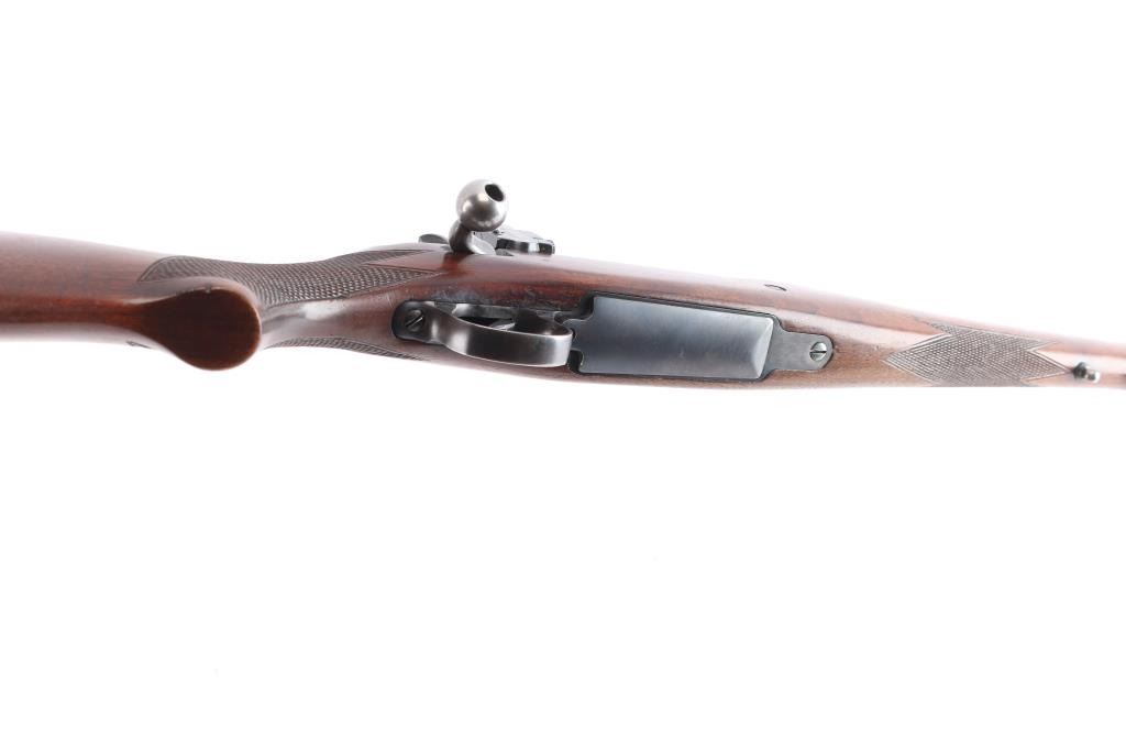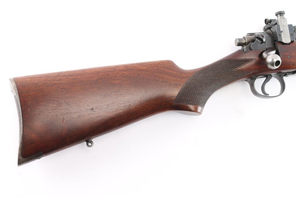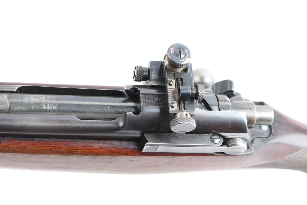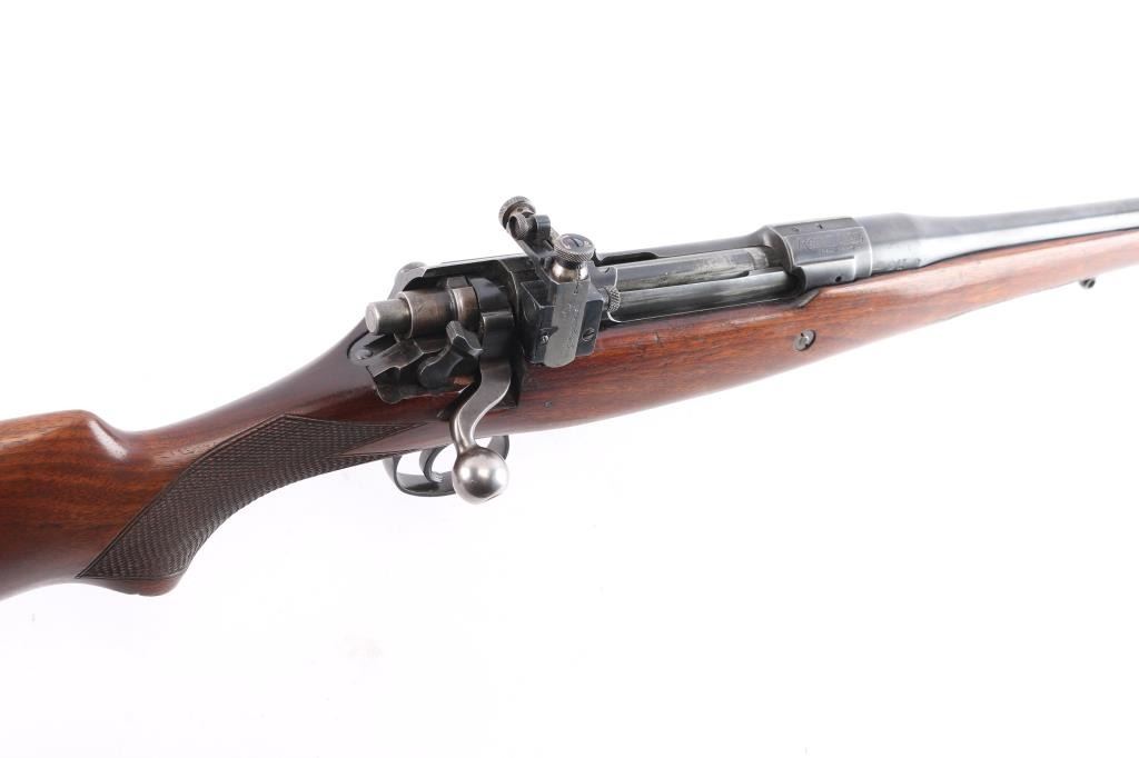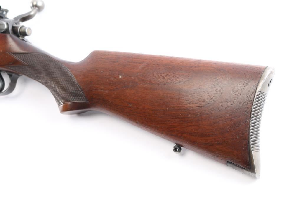 'Express,' an early pre-WWII American made bolt-action centerfire sporting rifle chambered for .358 Winchester (originally marked '.35 REM.'), and manufactured in Ilion, NY. This rifle is based from the U.S. made Model 1917, and it was produced from 1927 until 1940. The barrel is marked with 'RW3' and 'RW2' on the left side of the barrel in front of the receiver. Rifle features a blued finish, a 22" barrel, pinned fixed blade front sight with a brass bead, Lyman 48S Springfield Newton adjustable rear sight, receiver drilled and tapped for optic mounting, serrated curved trigger, 'dog leg' style bolt handle, serrated receiver mounted manual safety, receiver mounted bolt release, and stripper clip guides cut into receiver. The hardwood furniture consists of a semi-pistol gripped shoulder stock with checkering at the wrist, a checkered schnabel forend, sling studs in the forend and shoulder stock, and a serrated metal buttplate. The original blued finish retained is approximately 90% with edge wear, light scratches and handling marks, and some general thinning on the front sight base and receiver. Metal displays some deformation in some of the screw slots, and the front sight base shows patina. The hardwood furniture is exceptionally good with sharp checkering, and only minor blemishes. Although, the stock was internally inletted by the front sling swivel, and it looks like something was mounted around the barrel. The action is smooth and crisp, and the bore is bright with strong rifling. The chamber has not been physically verified for the chambering of .358 Winchester.