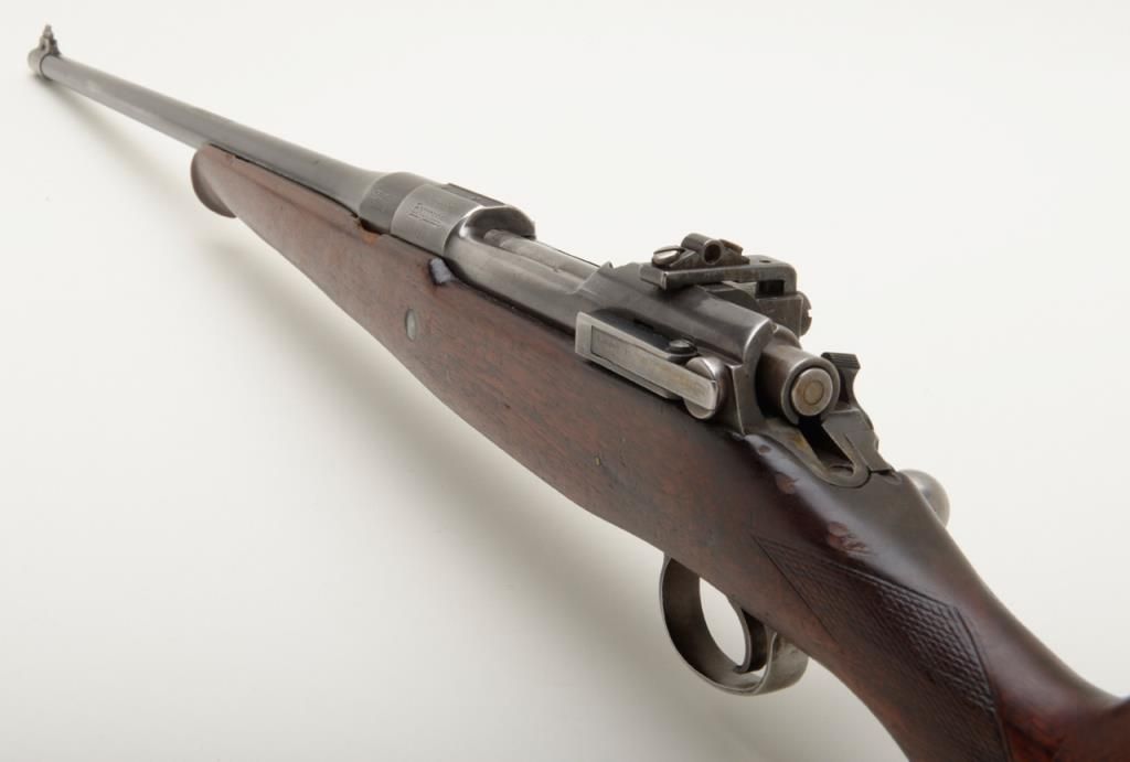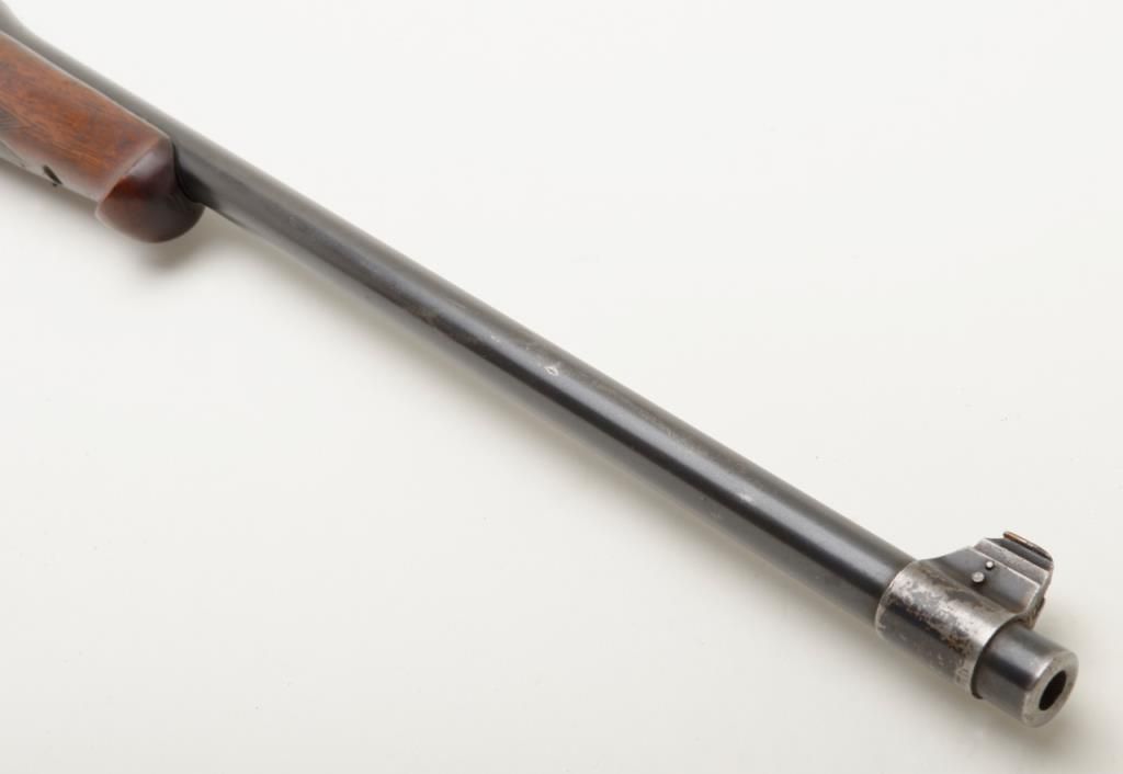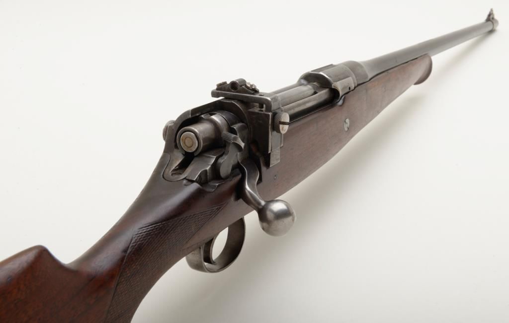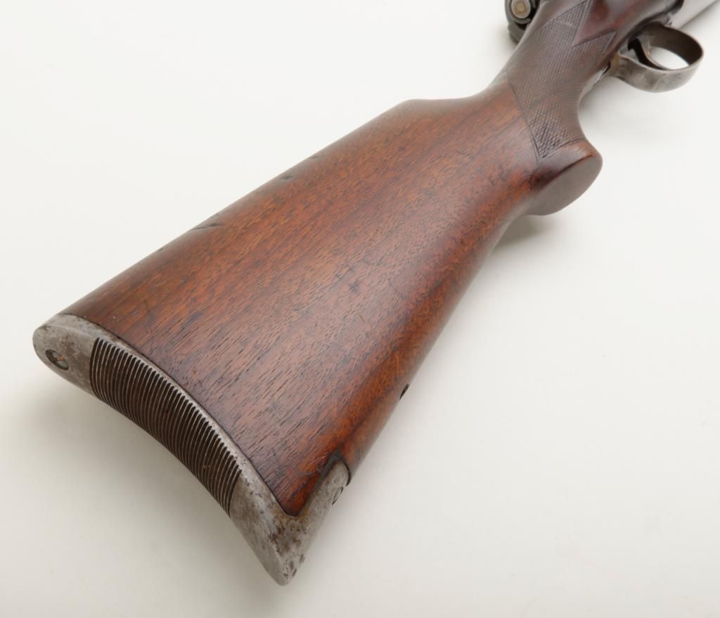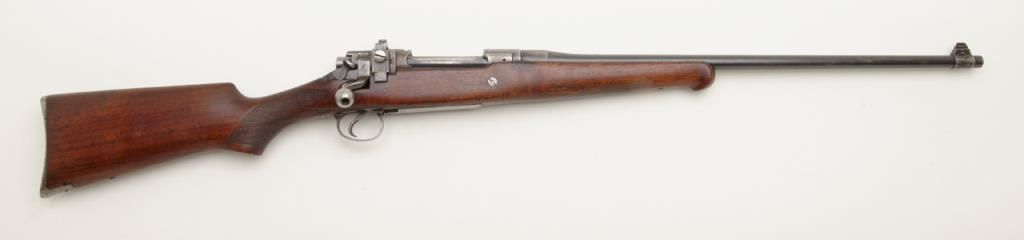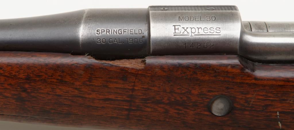 Remington Model 30 express sporting rifle in 30 government 1906 caliber, serial number 14232. The rifle shows 30% to 50% original blue evenly drifting and toning to a natural light gray patina. The stock shows wear and use and is fair to good with a couple of small losses, dings, mars and scratches and normal aging. The original butt plate is retained. The rear of the action is mounted with a Western marked receiver sight that is patent pending. The action is good, the bore is good to very good and may clean. These early sporting rifles by Remington utilized a 1917 Enfield style commercial action and current high-grade gunsmiths rate them highly for conversion to big-game sporting calibers. Est.: $250-$500