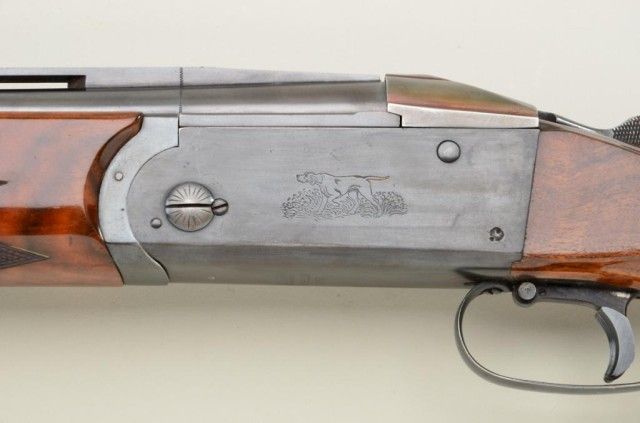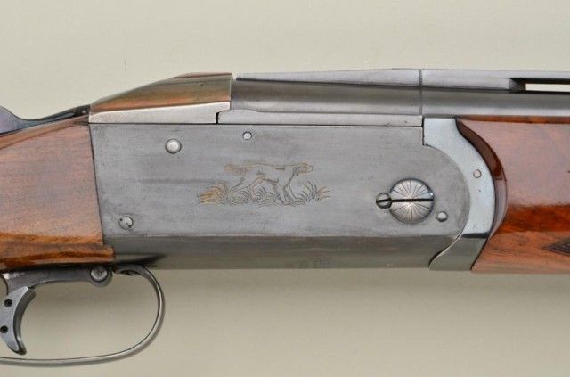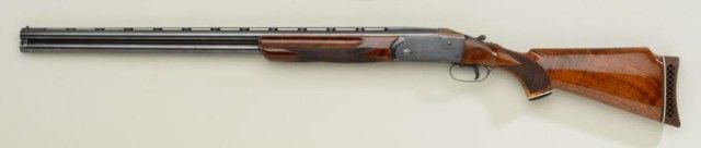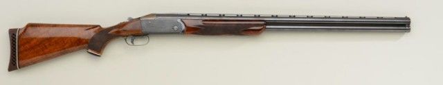Remington Model 32 Trap shot gun with Kreighoff marked barrels showing Ulm Germany address and bohler steel Model 32 Trap markings, serial #2896. The gun shows 30" barrels choked, improved modified overimproved modified and remains in very good plus condition. Approx. 80-90% thinning blue. The stocks have been repaired and refinished professionally and the color and grain on forend not a perfect match (possibly replaced when barrels added). The stock measures 13-1/2" to the end of the wood and 14-5/8" to the end of a thick recoil pad. The stock shows a high trap comb to the butt stock. Action tight, bore is very good plus, may clean to fine. Robert E. Petersen collection. Est.; $1,250-$2,500.
