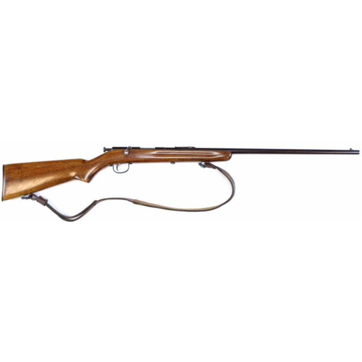 Remington Model 33 .22 NVSN single shot rifle with 2" round barrel and walnut stock. Barrel shows nice original blue drifting to plum, walnut stock nicely refinished with added leather sling. Good action with fair bore. FFL required.