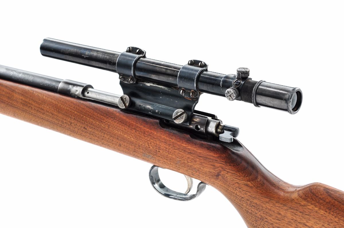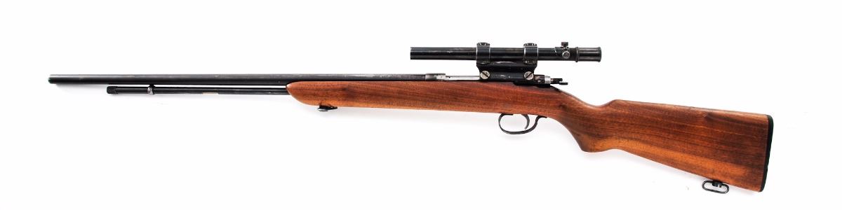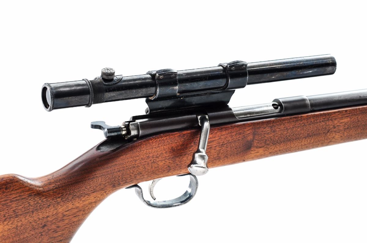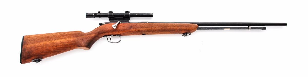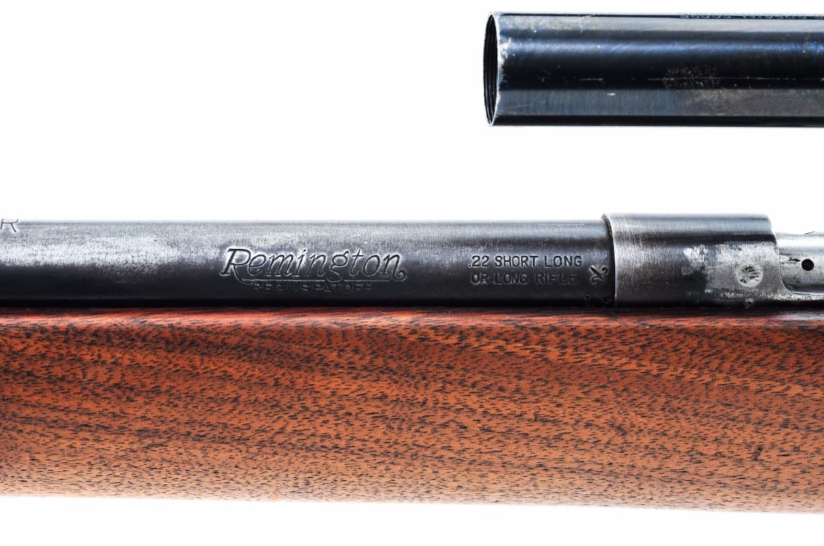 Remington Model 341-P Sportsmaster Bolt Action Rifle, NVSN, .22 S-L-LR cal., 24'' barrel, blue finish, pistol-grip walnut stock, Remington black plastic buttplate, sling swivels. Topped with a Weaver Model 29S scope. Condition is good retaining approx. 55%-60% thinning and toning blue. Stock with scratches and mars. Buttplate with flattening to the checkers, as well as one small loss to left hand side edge. End of barrel with two small threaded holes from the removal of front sight. Action is crisp, bore is fine, scope optics are slightly cloudy. Est.: $150-$250. (C&R)