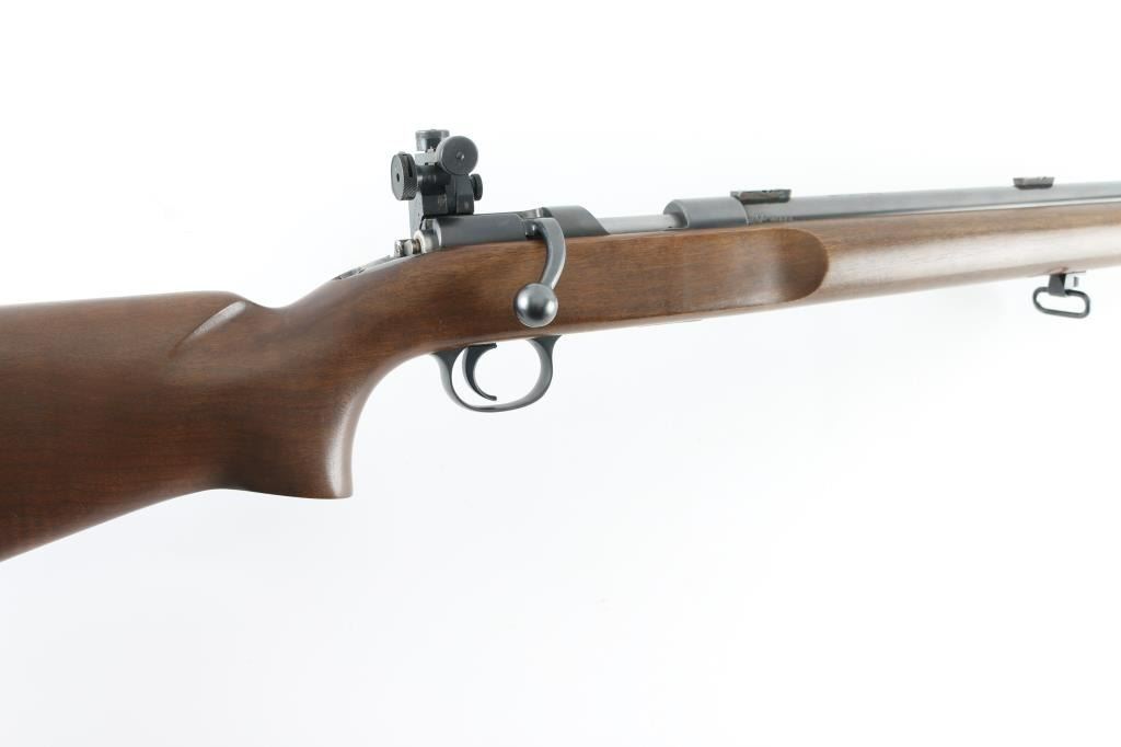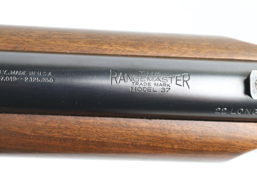 'The Rangemaster' rimfire bolt action target rifle. Features blued finish, walnut target stock, 28" heavy barrel, hooded globe front sight, adjustable diopter rear peep sight, dovetail blocks on barrel, manual safety, single shot cartridge shelf (can be replaced with a 5 round magazine), sling swivels, short section of accessory T-slot rail inset into bottom of forend, checkered steel buttplate. Bore is very good condition. Retains 90% finish with handling marks, edge wear. Wood is very good condition. Condition is near NRA Excellent *** Modern Firearm ***