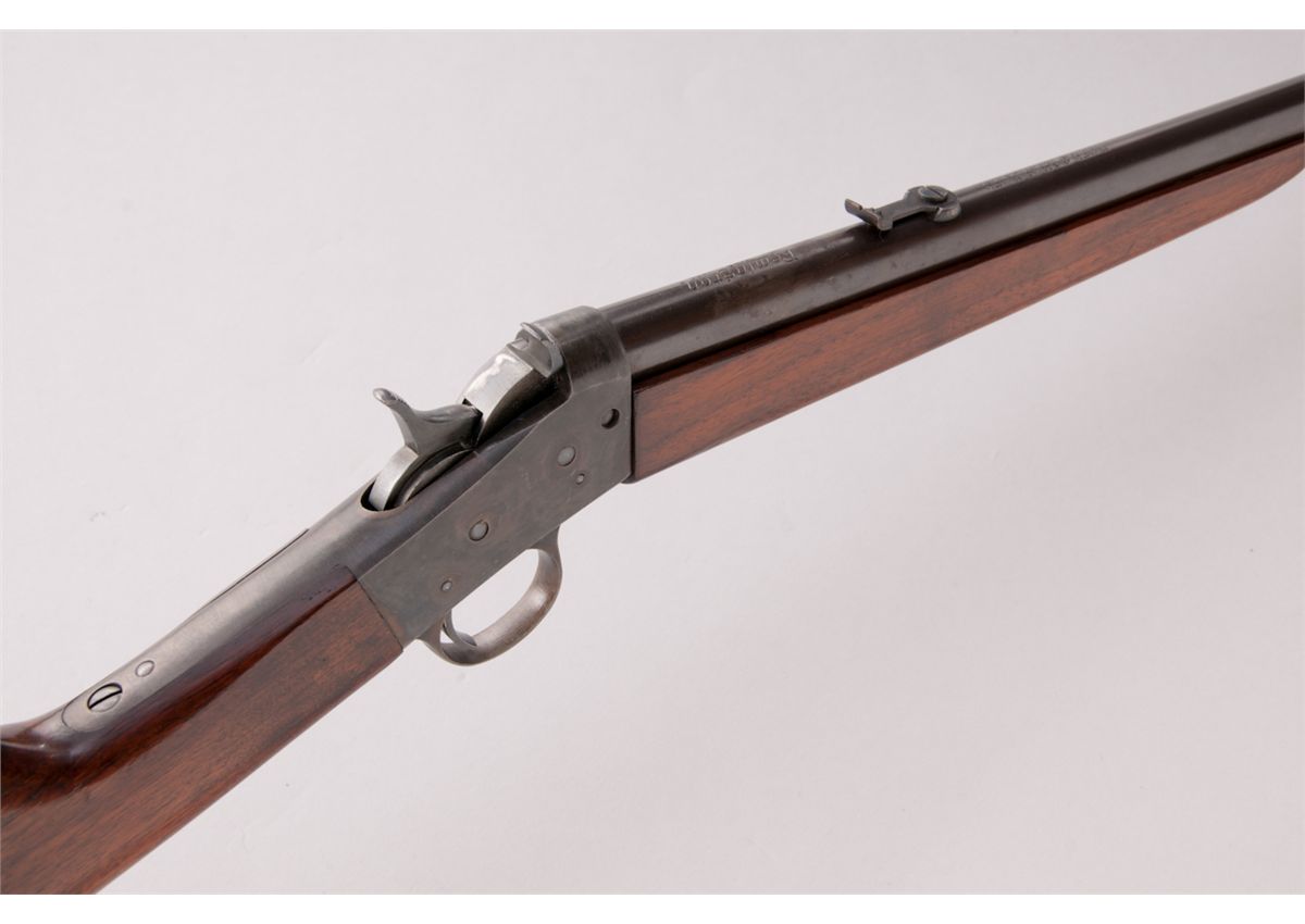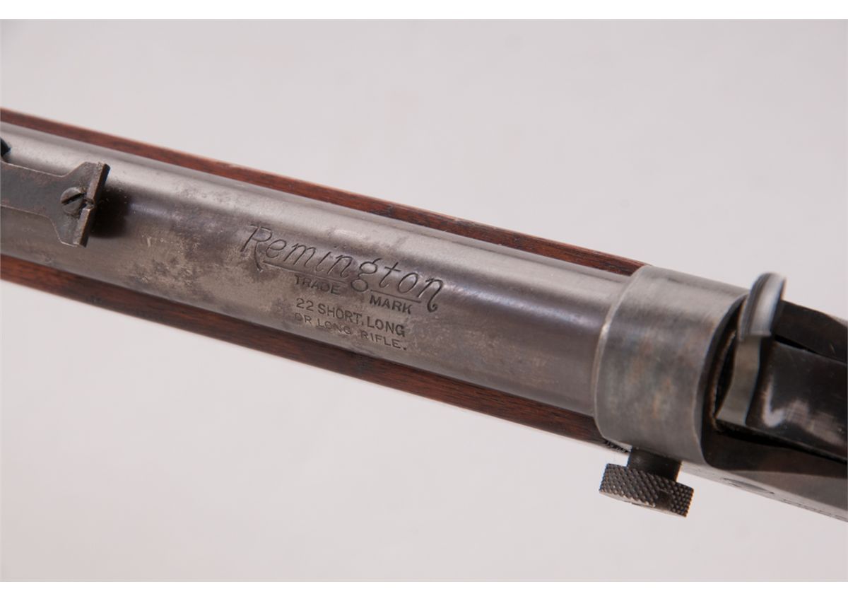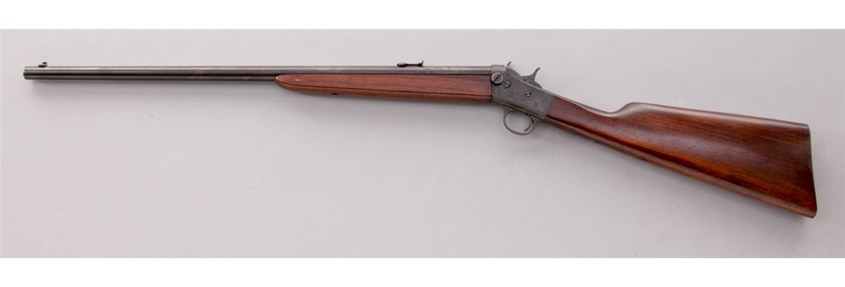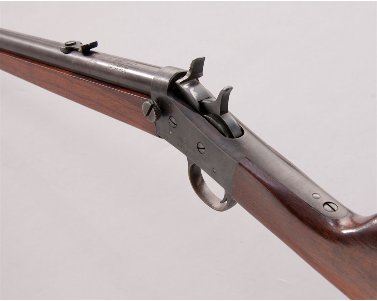Remington Model 4 Rolling Block Single Shot Rifle, #345814, .22 cal., 22'' round blue barrel, case hardened frame, walnut stock and forend, with Remington-UMC blue steel buttplate. Condition is near excellent retaining approx. 80% blue to barrel with small splotchy area near breech. Case hardened frame remains vivid showing at least 80%. Stocks with an additional coat of linseed oil and show very well. Action is crisp, bore is excellent. Est.: $400-$600. (C&R)