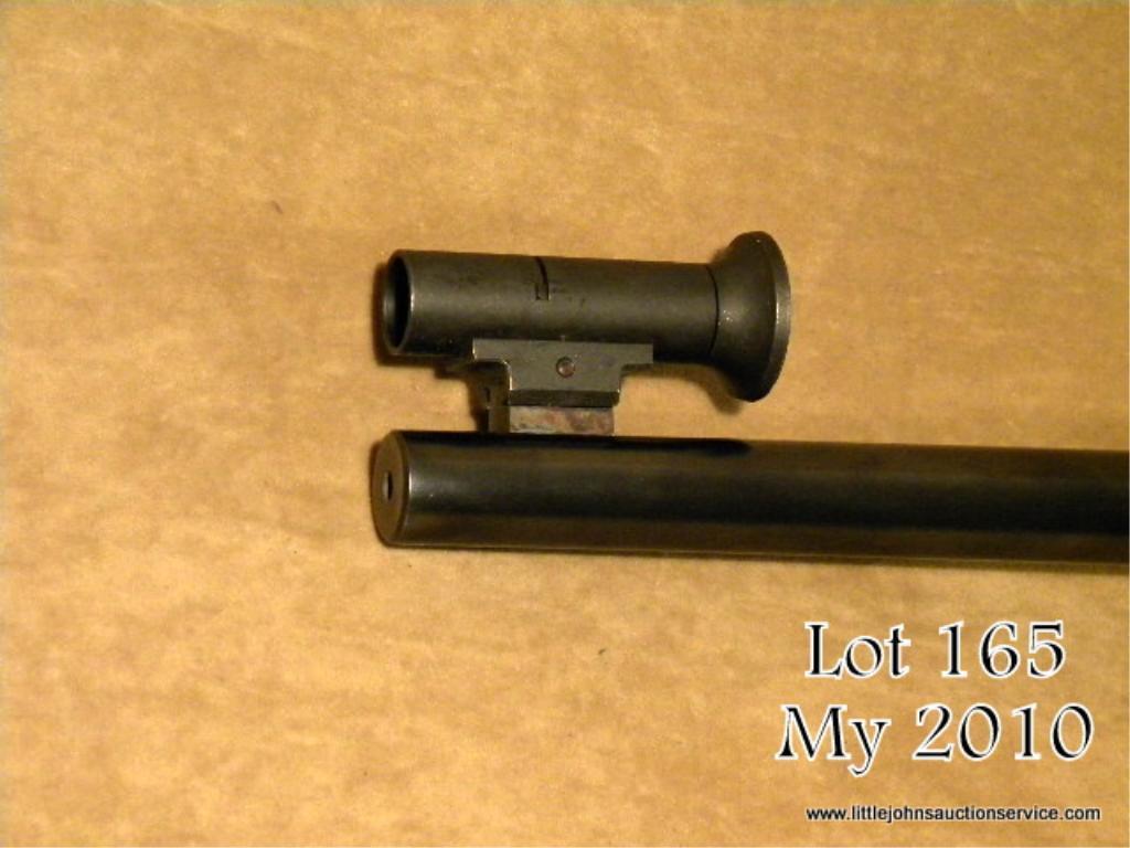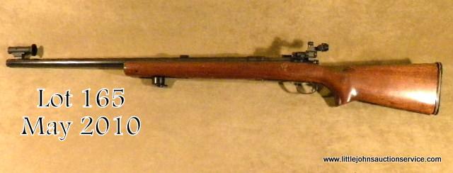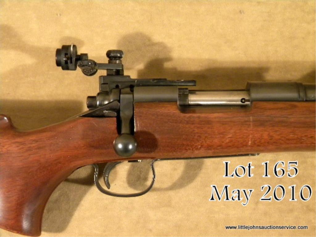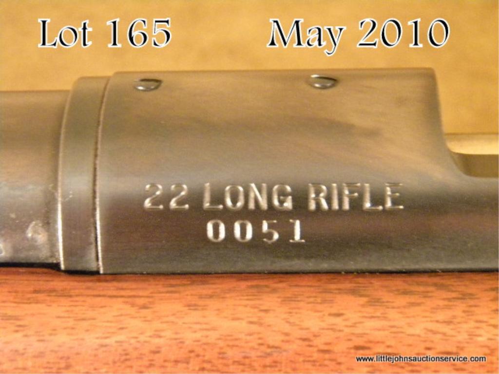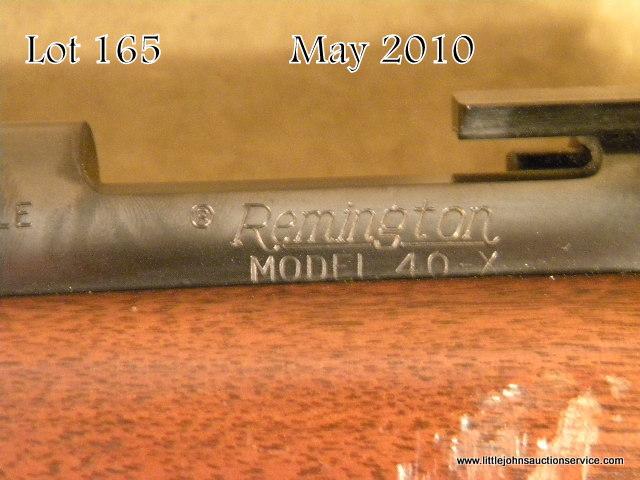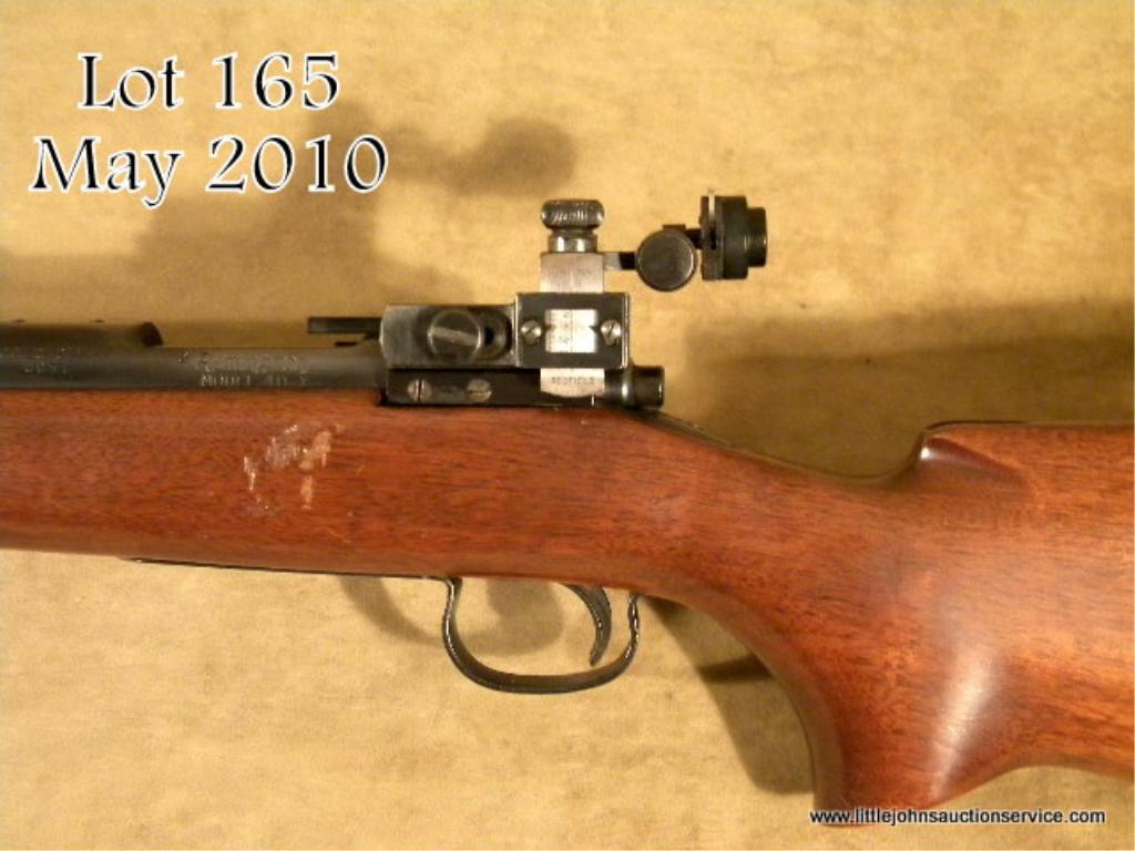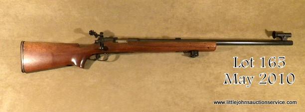 Remington Model 40X bolt-action target rifle, .22LR cal., 28” round bull barrel with scope mounts, blue finish, target wood stock, low serial #0051. This desirable target rifle is in overall excellent condition showing approx. 97% originalblue finish, excellent bore, crisp action, sharp markings and very good heavy wood stock with scattered nicks, scratches and mars from carry and storage; White Line hard rubber butt pad added; Redfield Olympic Model adjustable rear sight andmatching Redfield Olympic Model hooded adjustable front sight. Accompanying this rifle is a leather covered wood shooting case which contains an Argus Super Grade spotting scope and stand with carry case; a leather sling, shooting glove and restpad; seldom retained original instructions booklet for the Model 40X; tin full of additional inserts for the front sight; wood block for specially loaded target cartridges; Unertil long range adjustable scope with both end covers and verygood optics; driver’s license number lightly scratched on left side of barrel at breech. This rifle obviously was set up and used by a serious target shooter and would make a great addition to any present day target shooter’s inventory of fine