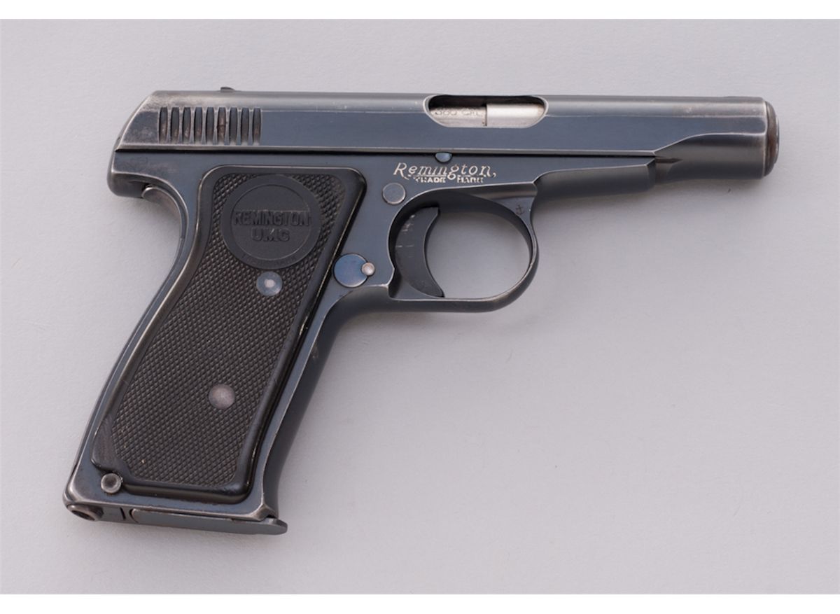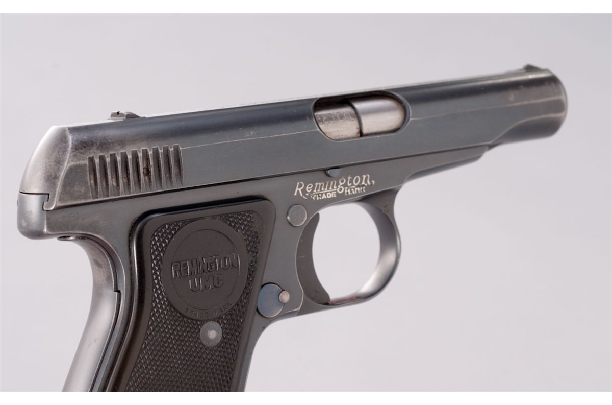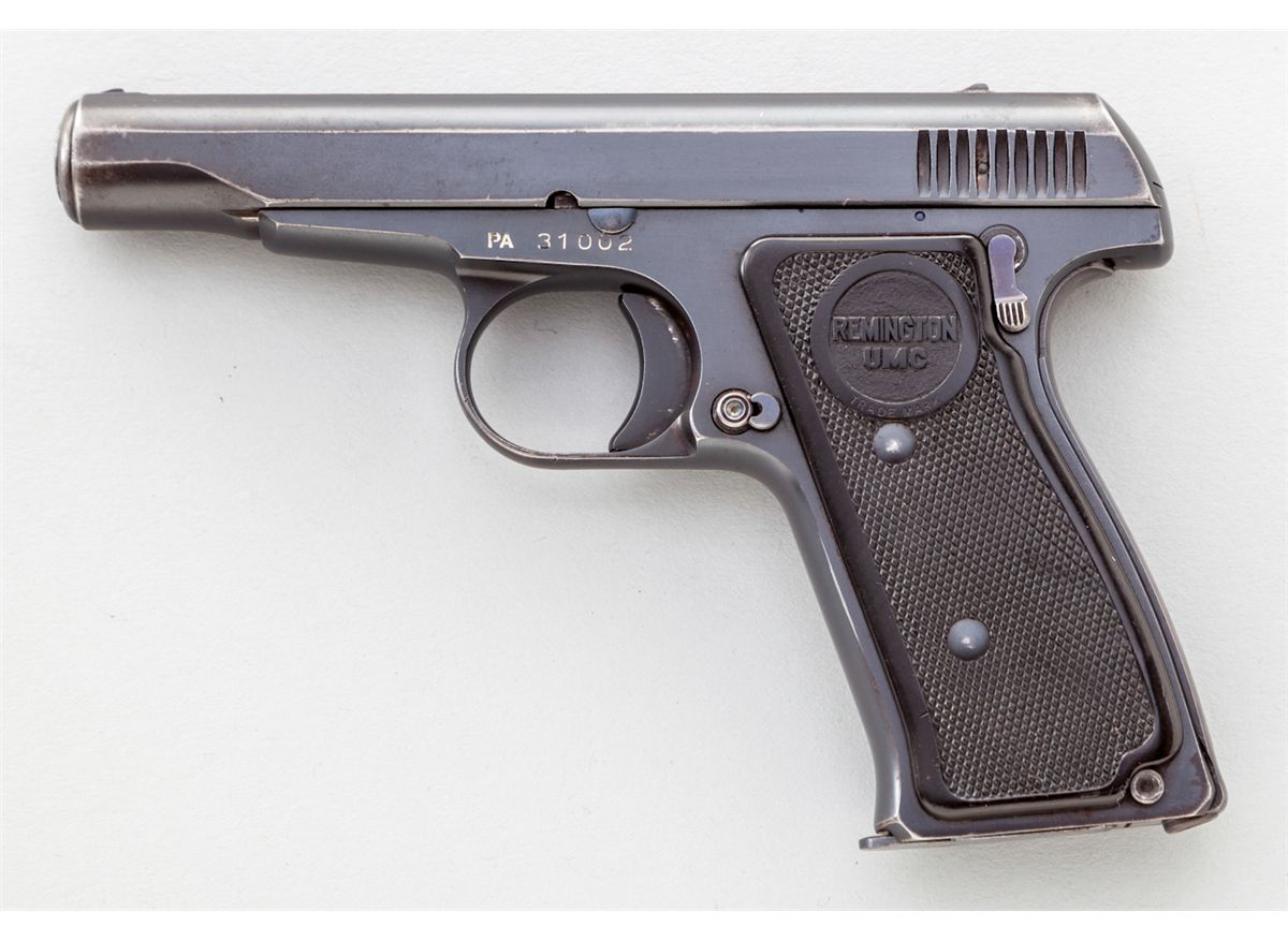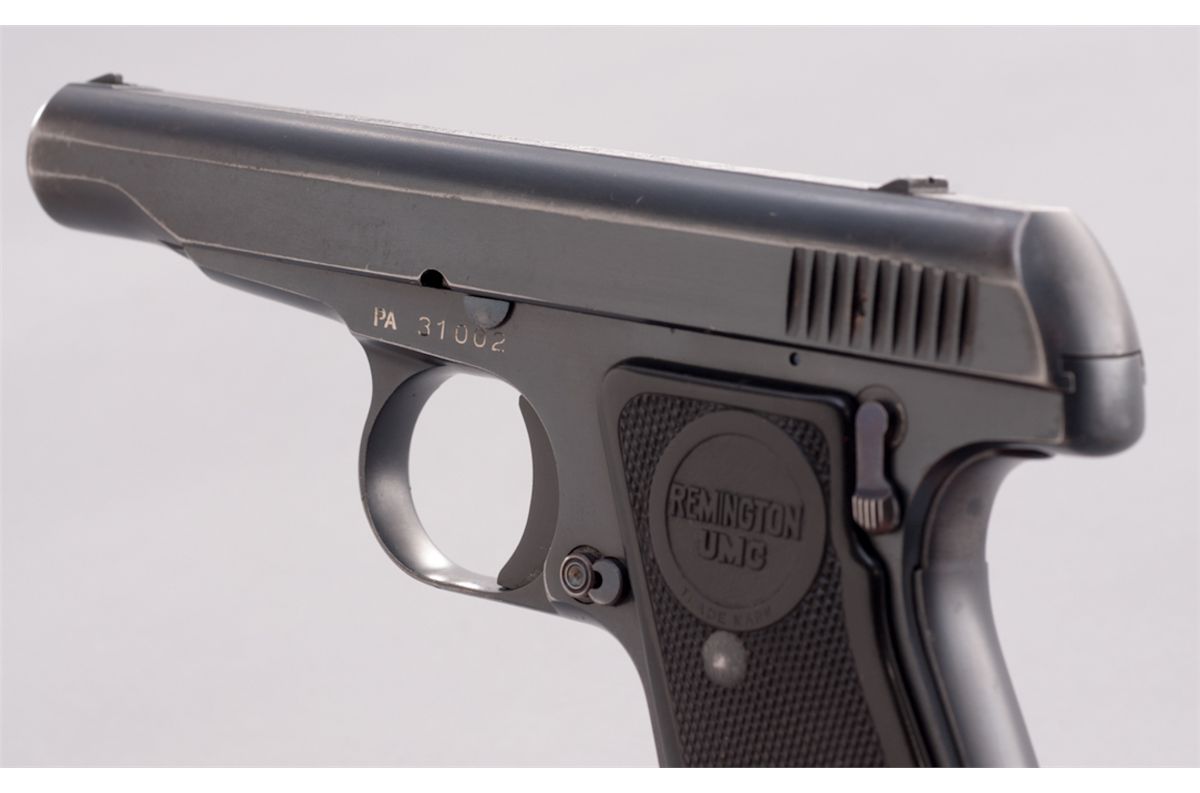 Remington Model 51 Semi-Automatic Pistol, #PA31002, .380 ACP cal., 3-1/2'' barrel, blue finish, factory checkered hard rubber grips, with one Remington magazine. Mfg'd 1918-1926. This version with early plunge milled slide serrations. Condition is near excellent retaining approx. 95% thinning and toning blue with most of the losses as light wear to muzzle and thinning near right side of slide at serrations. Grips show minor use. Action is crisp, bore is bright. Est.: $500-$750. (C&R)