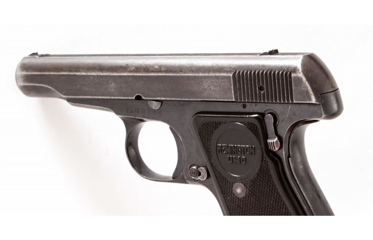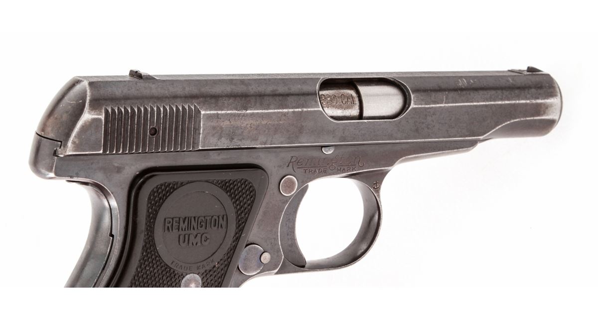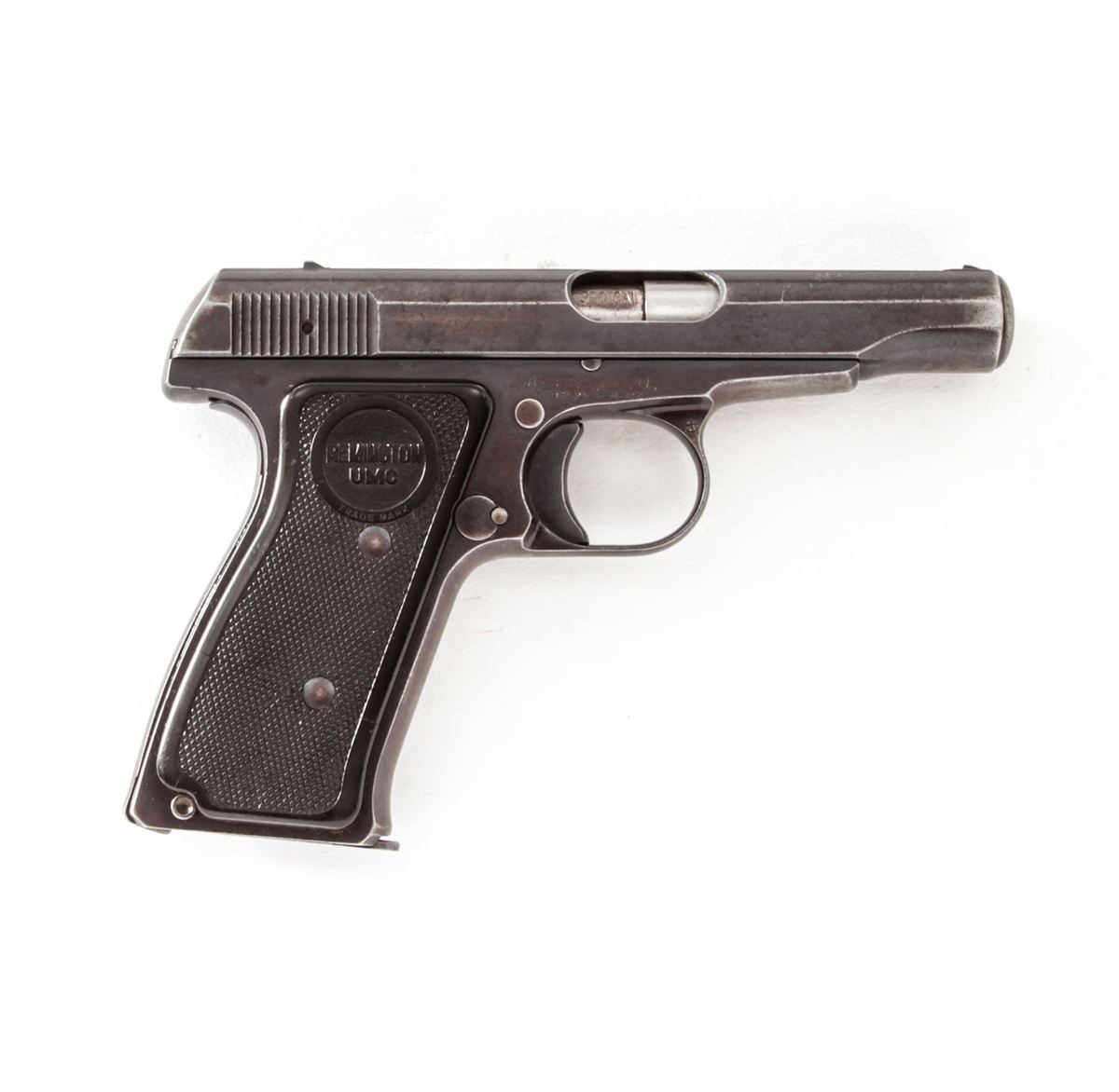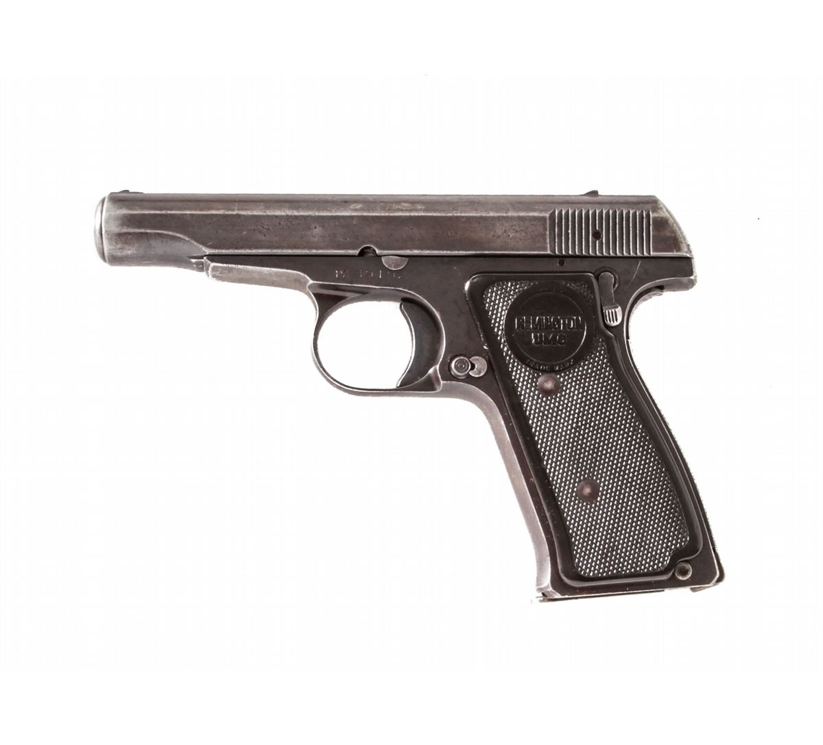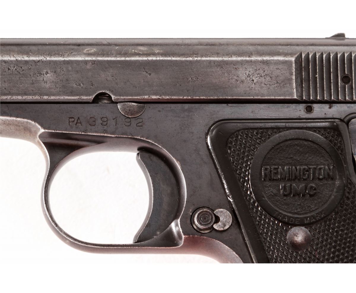 Remington Model 51 Semi-Automatic Pistol, #PA39192, .380 cal., 3-1/4'' barrel, blue finish, factory checkered Remington UMC grips, with one factory magazine. Condition is near fine retaining approx. 85% thinning blue. Grips with light handling marks. Good action and bore. Est.: $450-$600. (C&R/PPT)