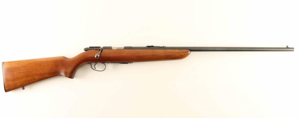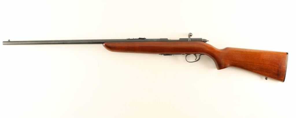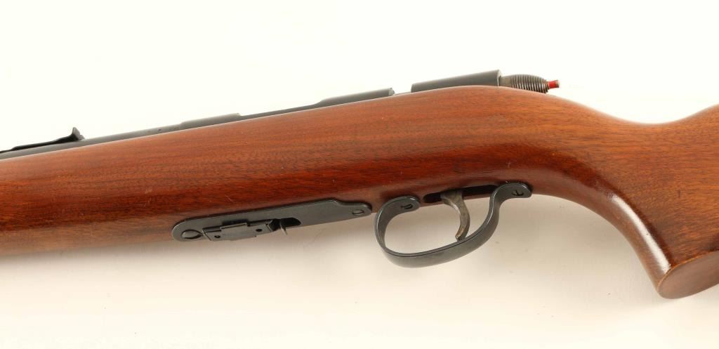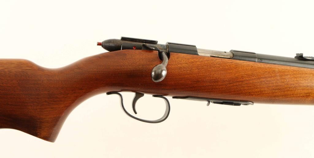 'Scoremaster' Vintage American made magazine fed bolt action sporting rifle chambered for .22 Short, Long or Long Rifle, manufactured pre-1968. Features a blued finish, 25" barrel, dovetailed blade front sight with bead top, elevation adjustable rear sporting sight, scope rail cuts in the receiver, serrated trigger, metal trigger guard, manual safety on the right side of the receiver, cocked indicator, detachable 6 round factory magazine, and smooth walnut pistol grip shoulder stock with factory buttplate. Rifle exhibits approximately 99%+ of it's original blued finish showing a small amount of handling wear and strong case colors on the bolt handle, safety & trigger. Action is smooth, the bore is excellent, and the wood stock is near fine with minor finish loss & blemishes. Condition is NRA Excellent. ***C&R Firearm***