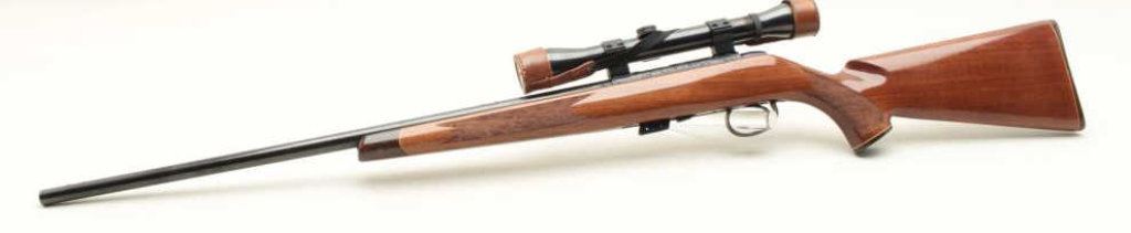 or LR caliber, 24” barrel, custom engraved, blued finish, checkered wood stock, S/N 1127465, mounted with a Weaver K4 scope displaying sharp optics; gun is in overall fine condition. (Modern). Est.: $400-$800.