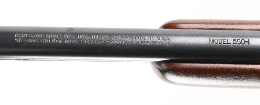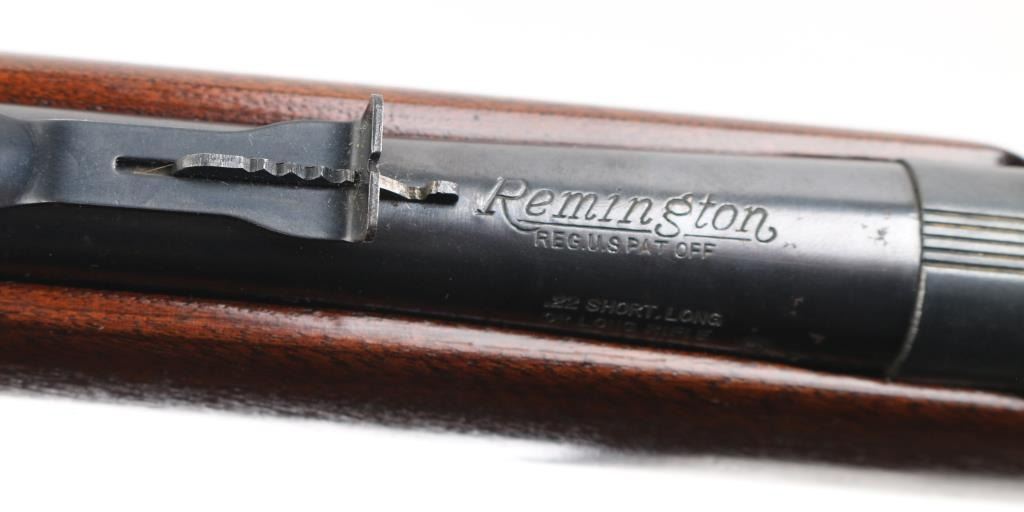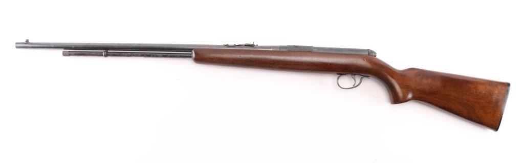 Vintage American made tube-fed semi-automatic sporting rifle chambered in .22 Short, Long or Long Rifle. Features a blued finish, 24" barrel, 4/5 length magazine tube dovetailed blade/bead front sight, adjustable rear sporting sight, case hardened serrated trigger, manual safety, baton shaped charging handle . downward shell deflector installed on receiver,and one-piece smooth wood pistol grip shoulder stock with factory hard rubber buttplate. Rifle exhibits approximately 90% of it's original blued finish showing scattered handling wear/scratches & some light surface rust. Action performs well, bore appears very good and wood stock is good with numerous small blemishes. NRA Condition-Good+. C&R Firearm.