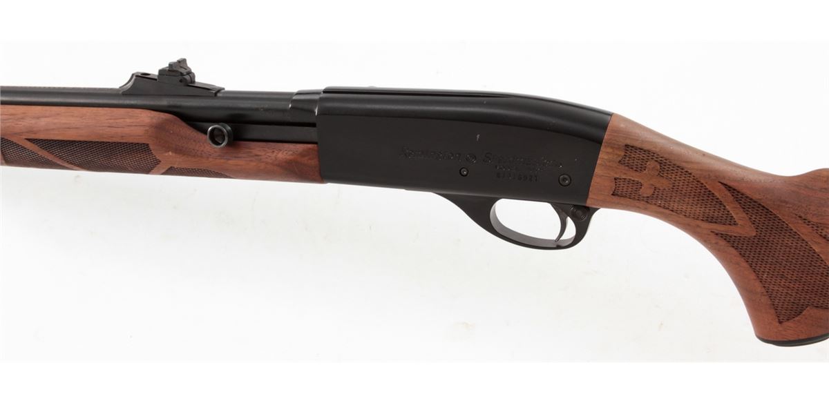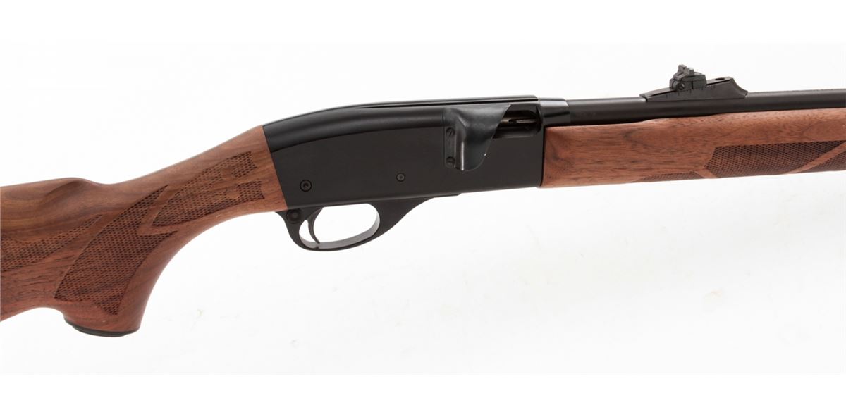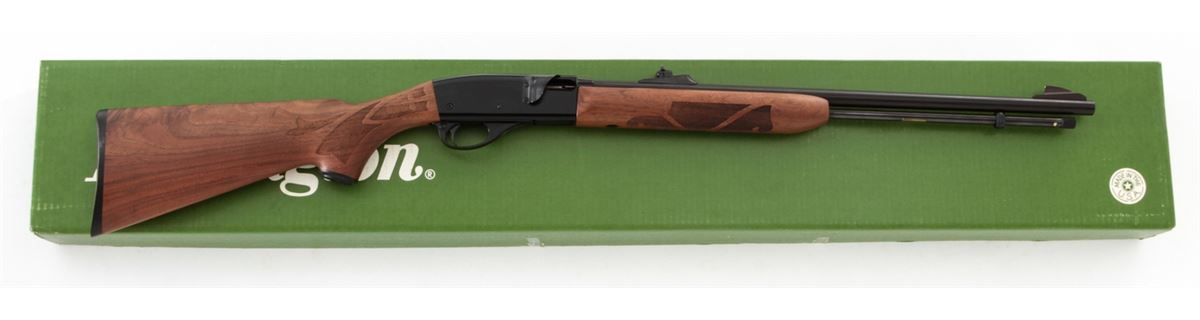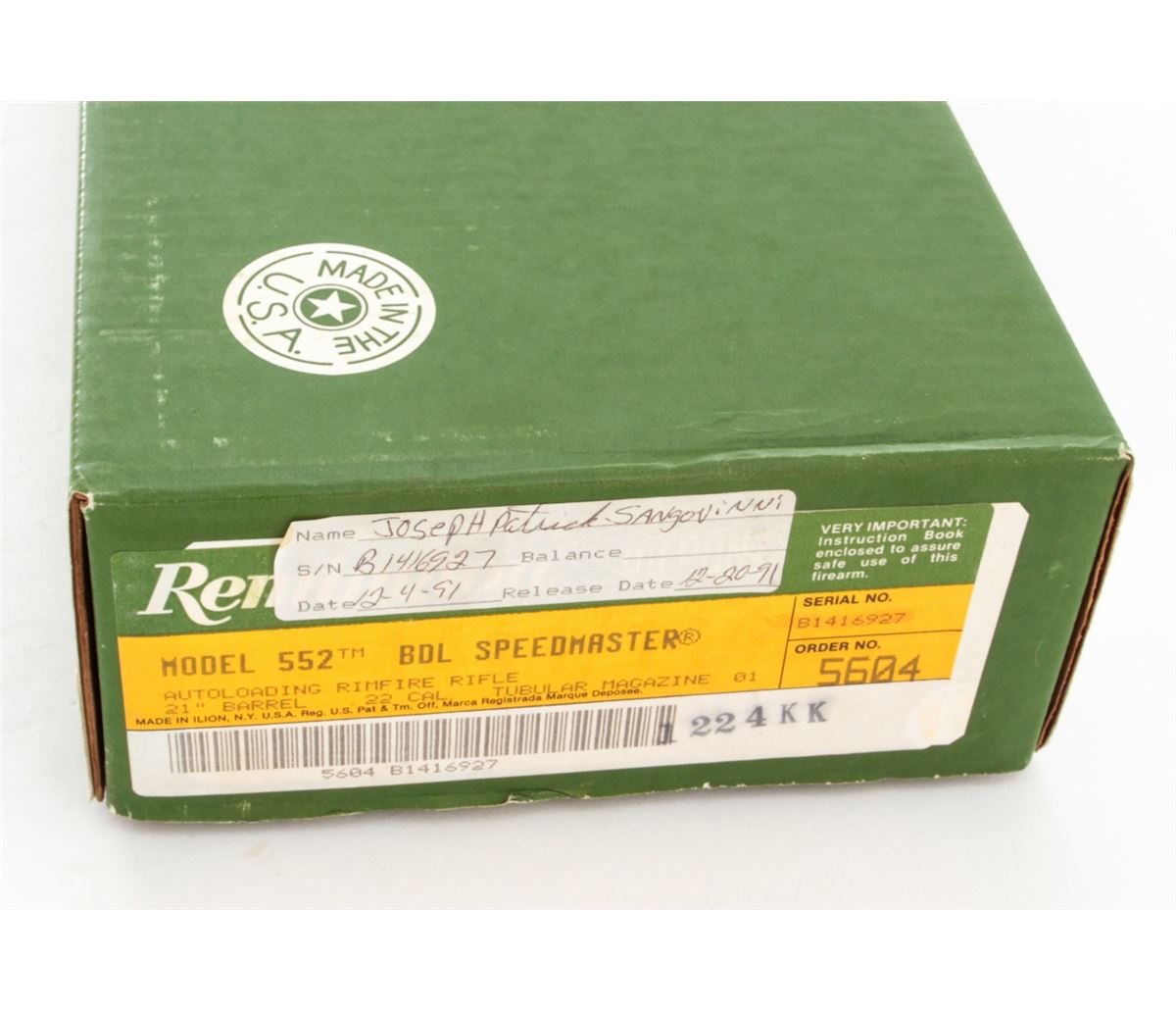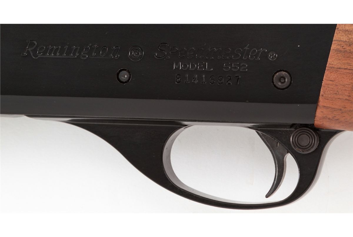 Remington Model 552 BDL Speedmaster Semi-Automatic Rifle, #B1416927, .22 SL/LR cal., 21'' barrel, black finish receiver, blued barrel, checkered pistol-grip walnut stock and forend, Remington buttplate, in original box with matching end label. Condition is excellent overall showing light marks from handling with an additional few small losses to black finish on receiver. Action is crisp, bore is bright. Est.: $300-$500. (Modern)