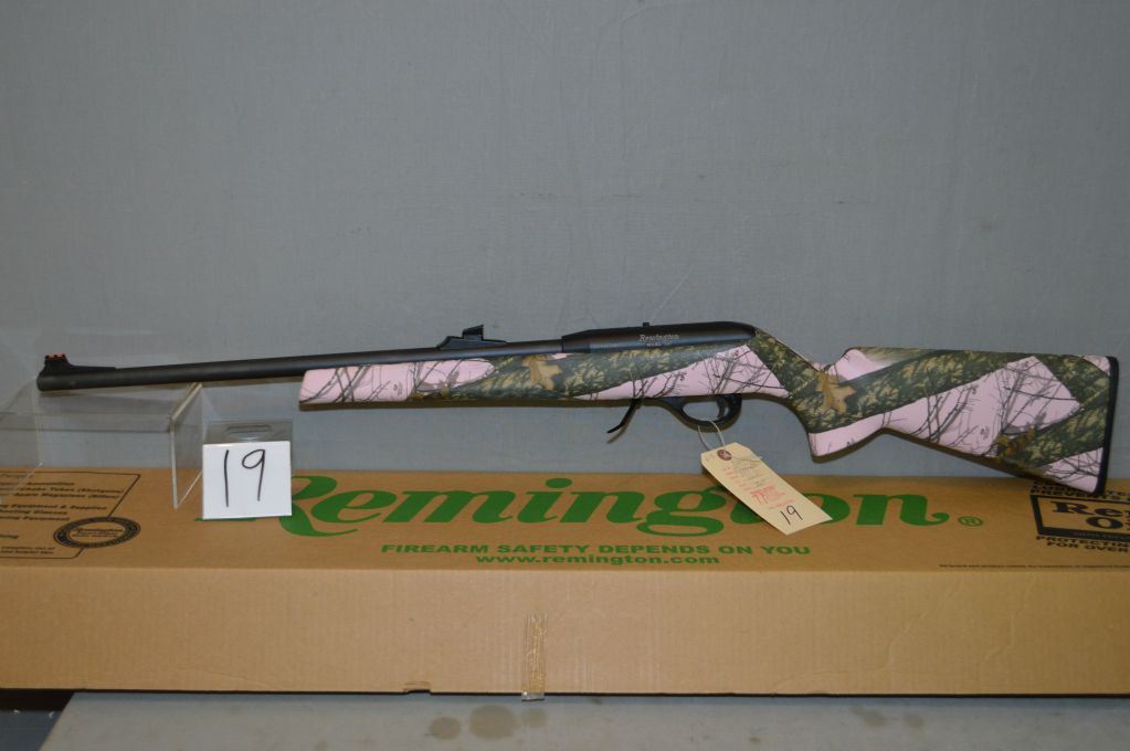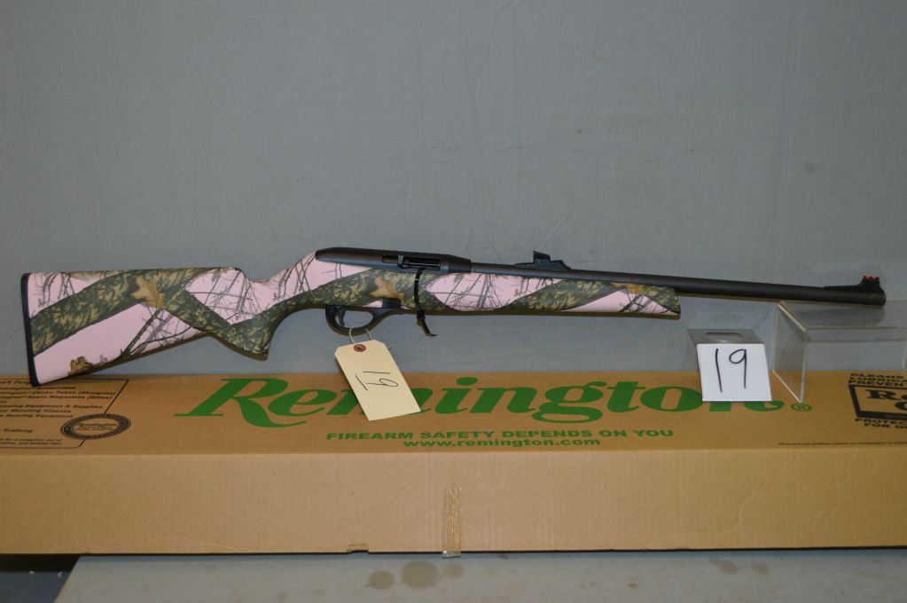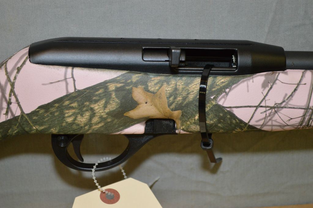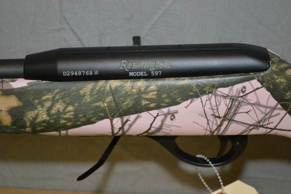 Remington Model 597 .22 LR cal Mag Fed Semi Auto Rifle w/ 20" bbl [ N.I.Box w/booklet, blue finish, barrel sights, w/ Mossy Oak Pink Blaze Camo stock, c/w lock ] Ser # D2948768