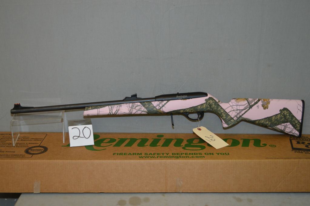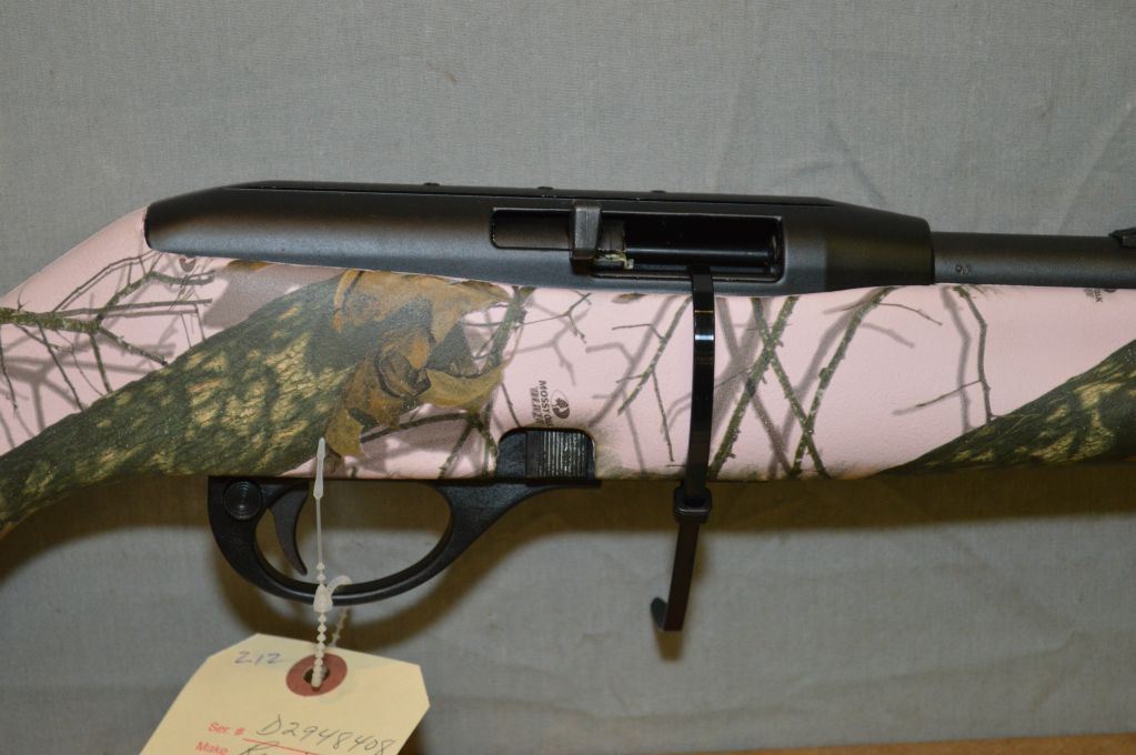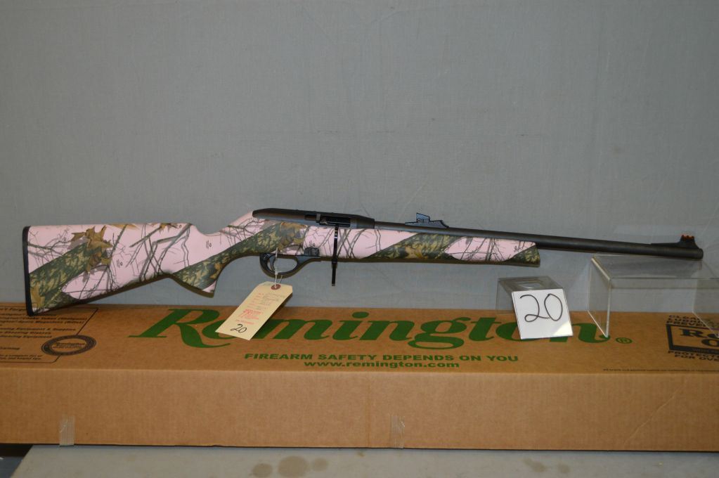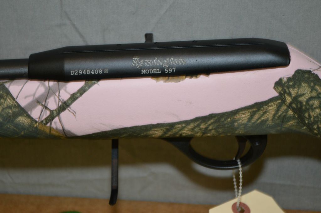 Remington Model 597 .22 LR cal Mag Fed Semi Auto Rifle w/ 20" bbl [ N.In Box w/booklet, blue finish, barrel sights,w/ Mossy Oak Pink Blaze Camo stock c/w lock ] Ser # D2948408