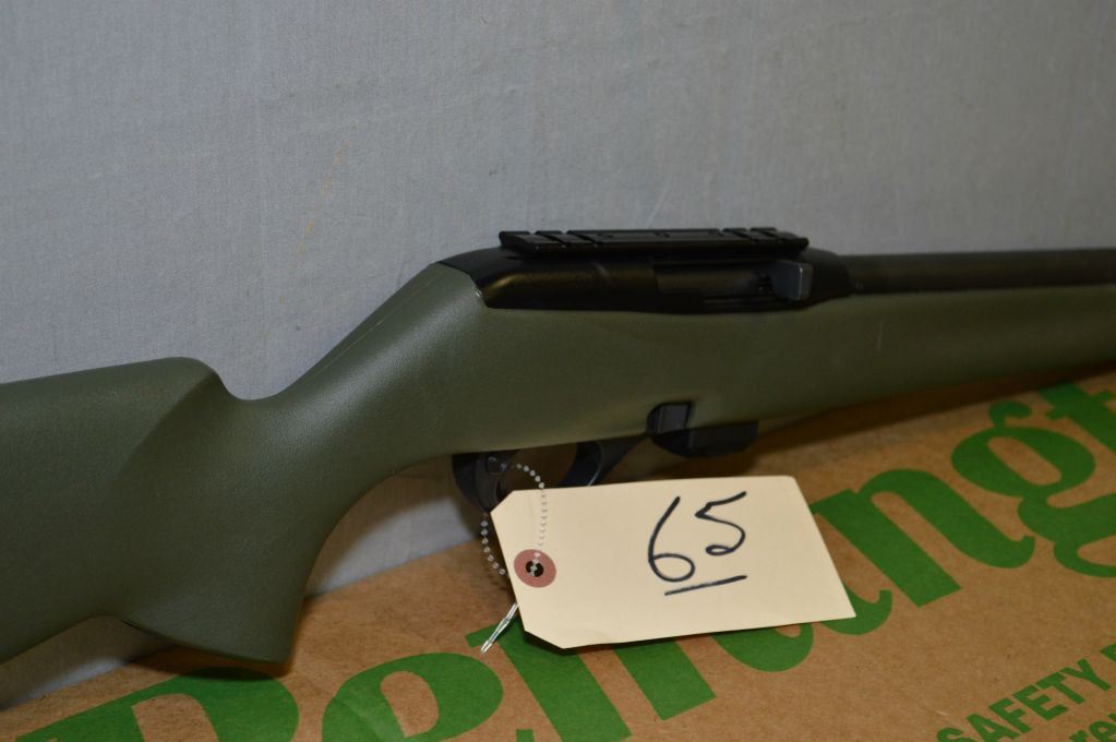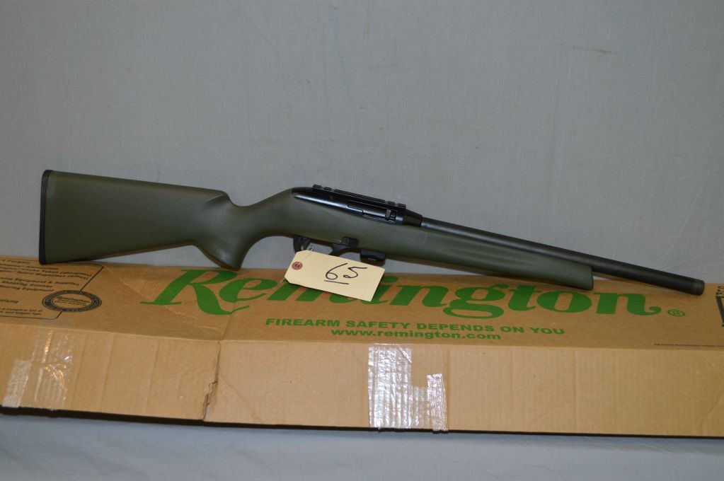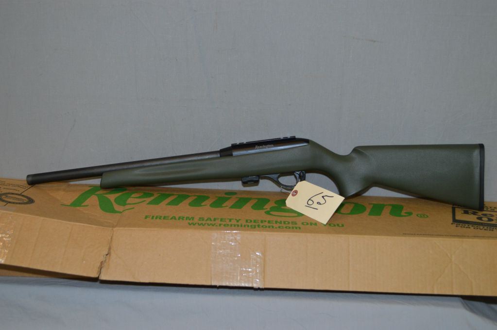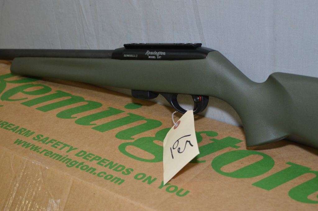 Remington Model 597 LR HB ..22 LR Cal Mag Fed Semi Auto Rifle w/ 16 1/2" heavy bbl [ appears as new, unfired, in original box w/booklet & cable lock, blued finish, no sights but has scope base, green synthetic pistol grip stock, w/ Remington butt plate ] Ser # D2985511