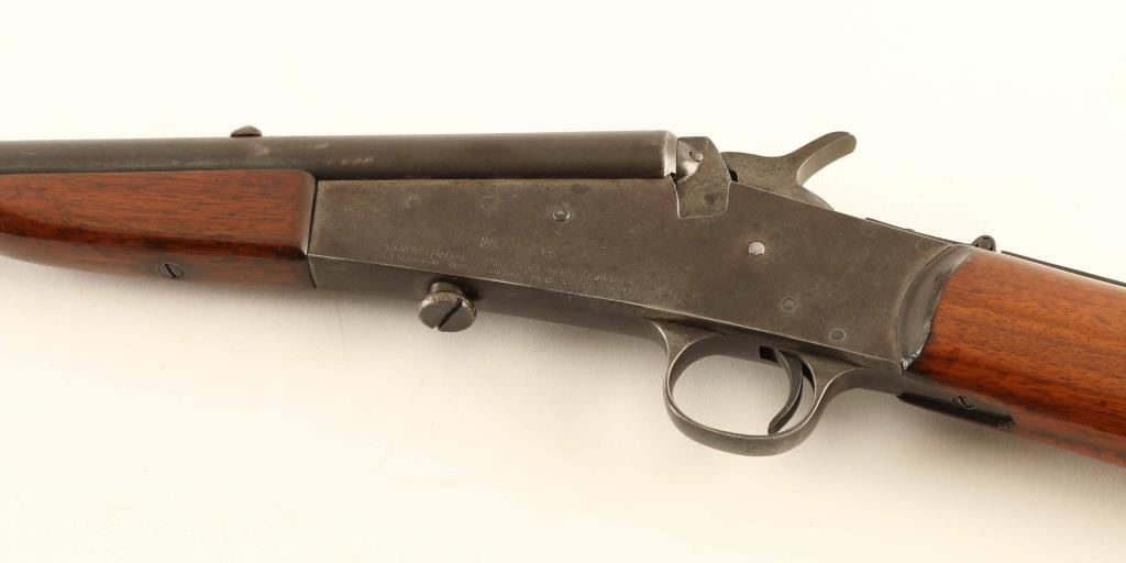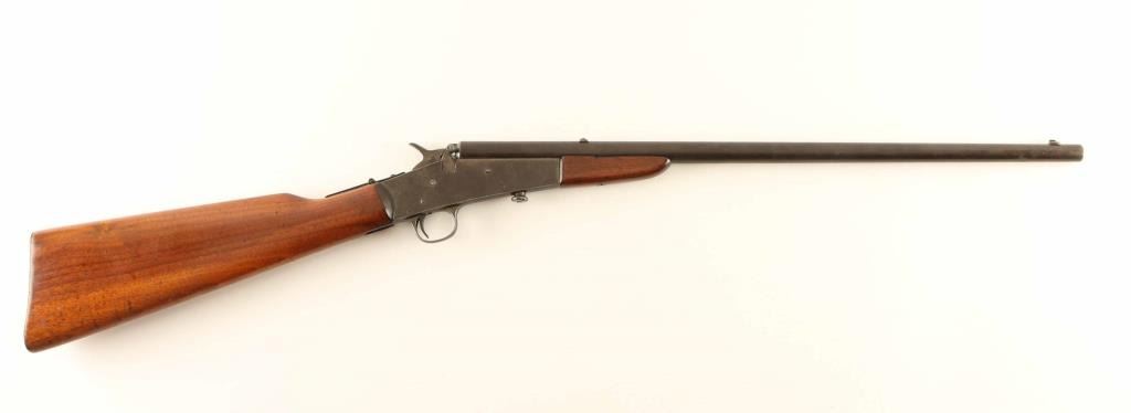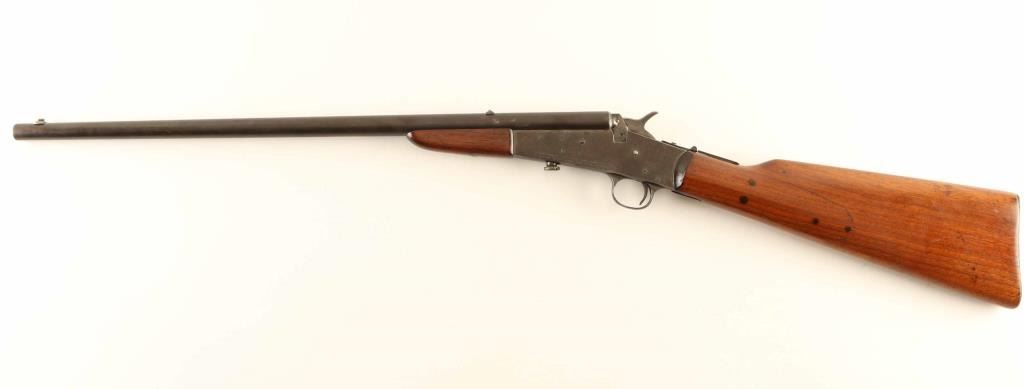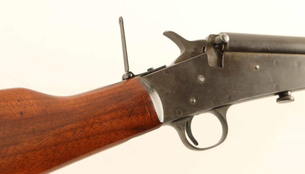 Rifle, Single-shot. Falling block action. Take-down. Made from 1901-1933. This rifle was made before 1921 (No letter code on barrel) Blued finish, wood stock, and forearm. Smooth steel, Remington marked butt plate. 20" round barrel, with open sights. This was has the folding sheet metal tang sight. Manufactured foe the boys market. Bore is pitted. Finish is about 40%, blue/gray patina. Wood is decent, and has been re-finished. Also there is old repair on the right side of stock behind the receiver. Matching ser# is slightly visible on the stock behind the triggerguard. NRA condition-Near very good. Modern Firearm.