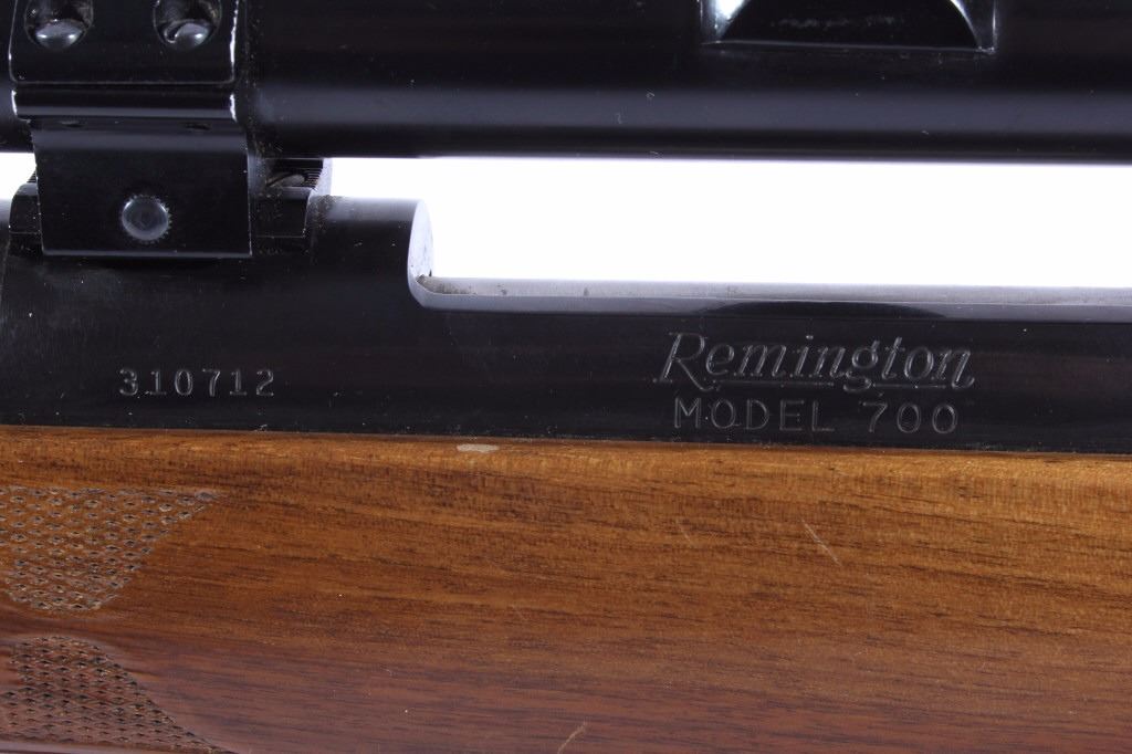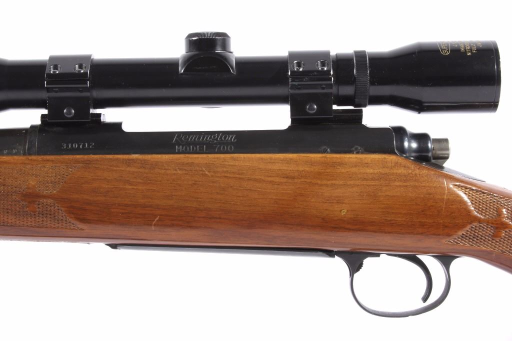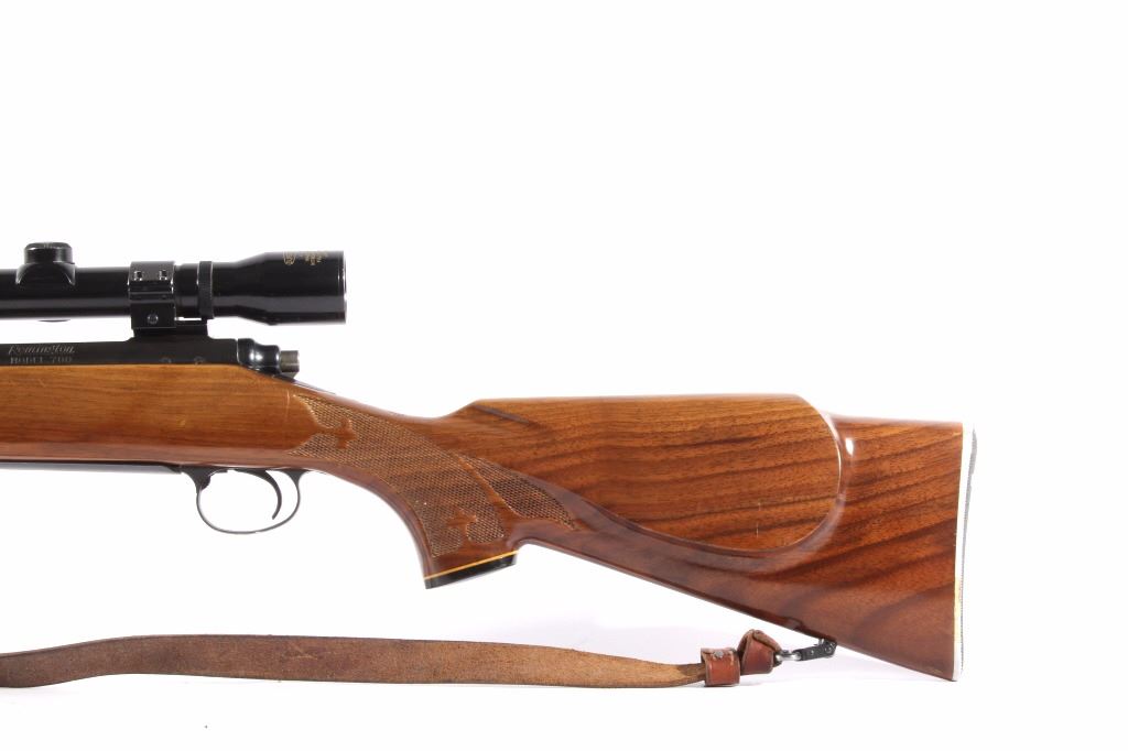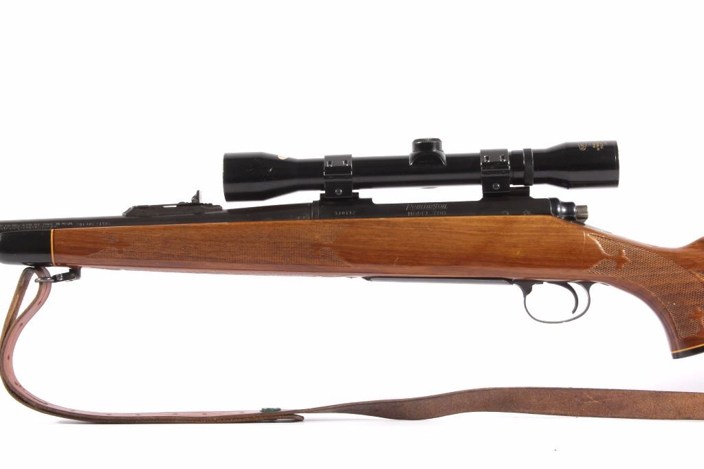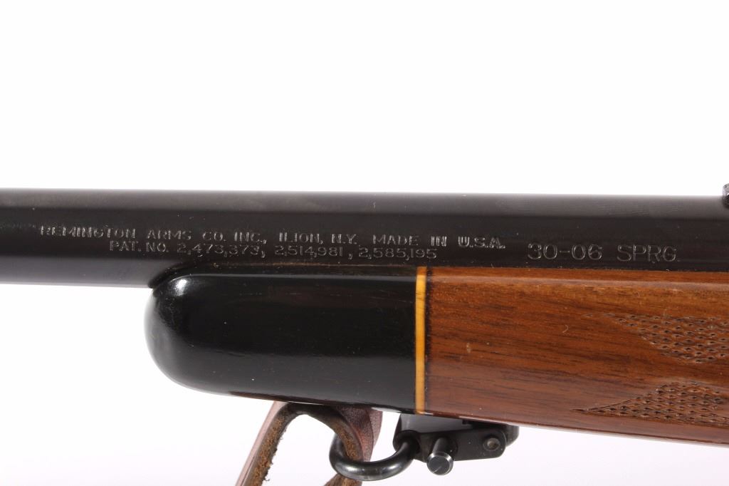 Offered for sale is a Remington Model 700 30-06 Bolt Action Rifle. The rifle features a 22" barrel, 4x32 scope, checkered monte carlo walnut stock, iron sights, and sling. The Remington Model 700 is a series of bolt-action rifles manufactured by Remington Arms since 1962. The rifle can also be ordered with a detachable box magazine. The Model 700 is available in many different stock, barrel and caliber configurations. It is a development of the Remington 721 and 722 series of rifles, which were introduced in 1948. The Remington model 700 is considered to be the number one bolt action of all time. More model 700 have been sold than any other bolt action before or since. The rifle is in good condition, showing 85% bluing and little wear to the stock. The rifle was manufactured in 1967. It is a modern rifle and requires a FFL transfer or NICS background check. The serial number is 310712. The overall length is 42 1/4"