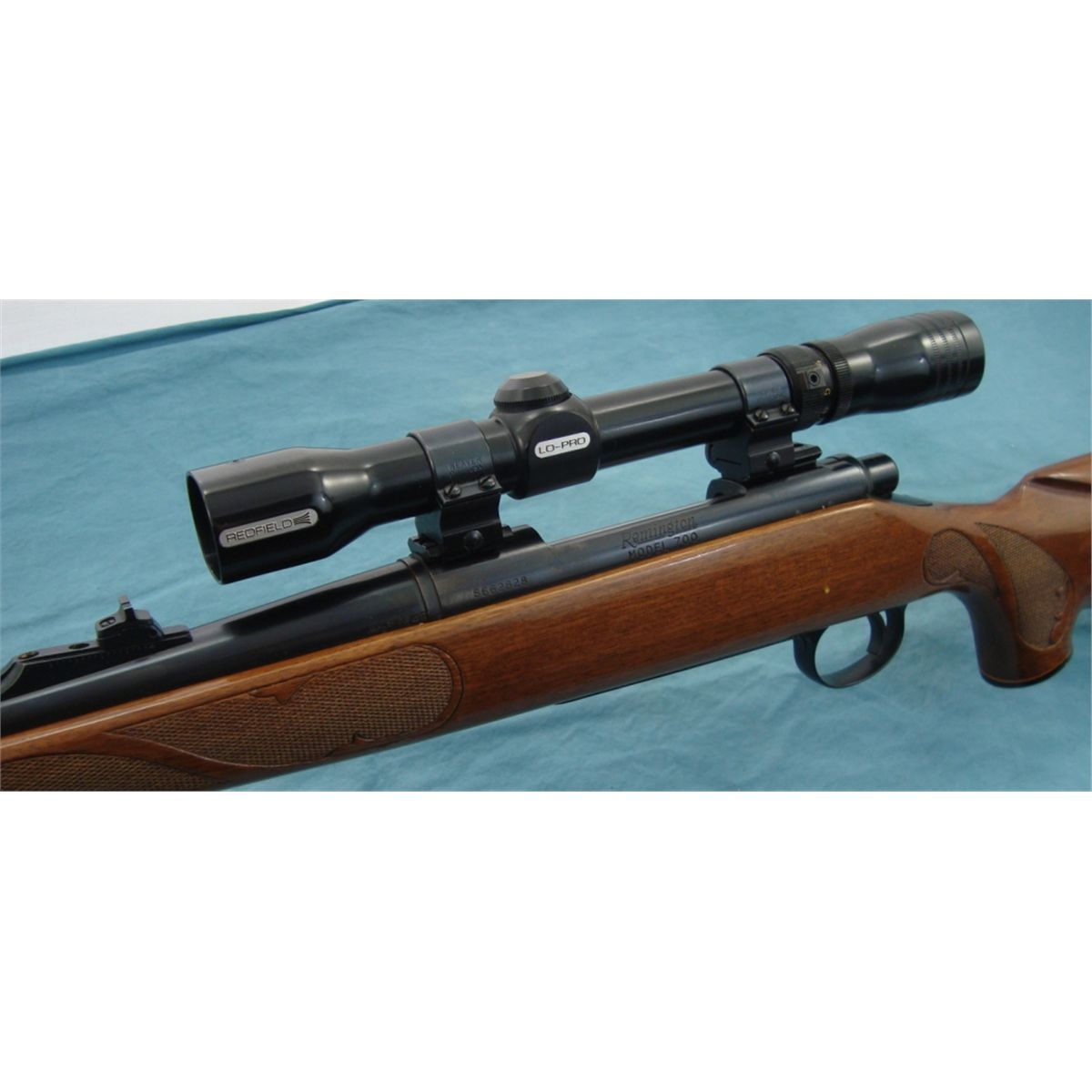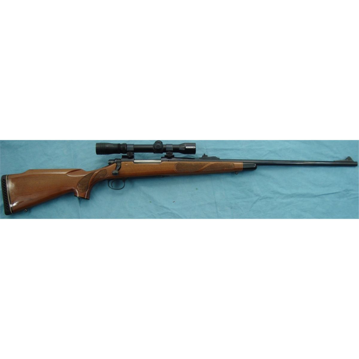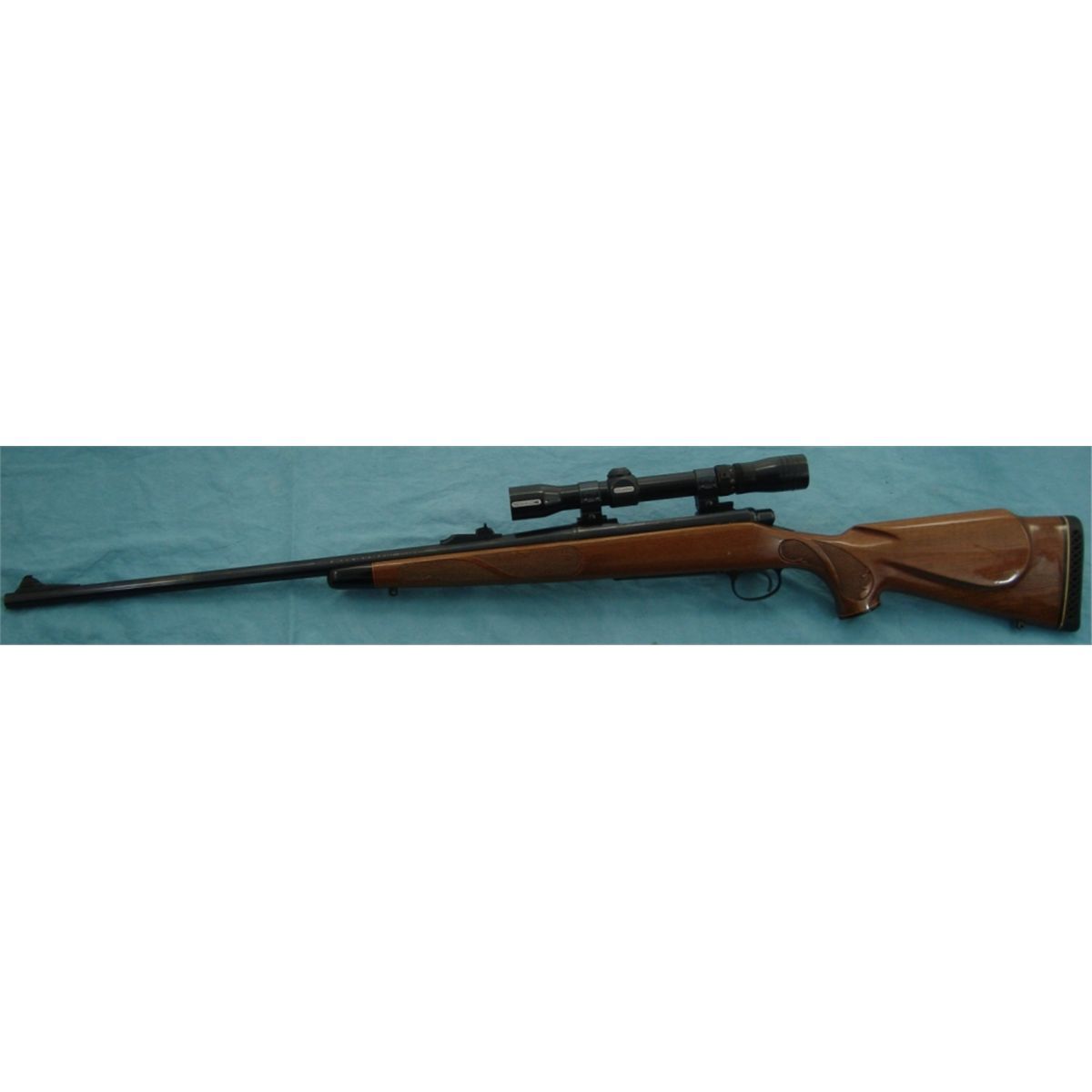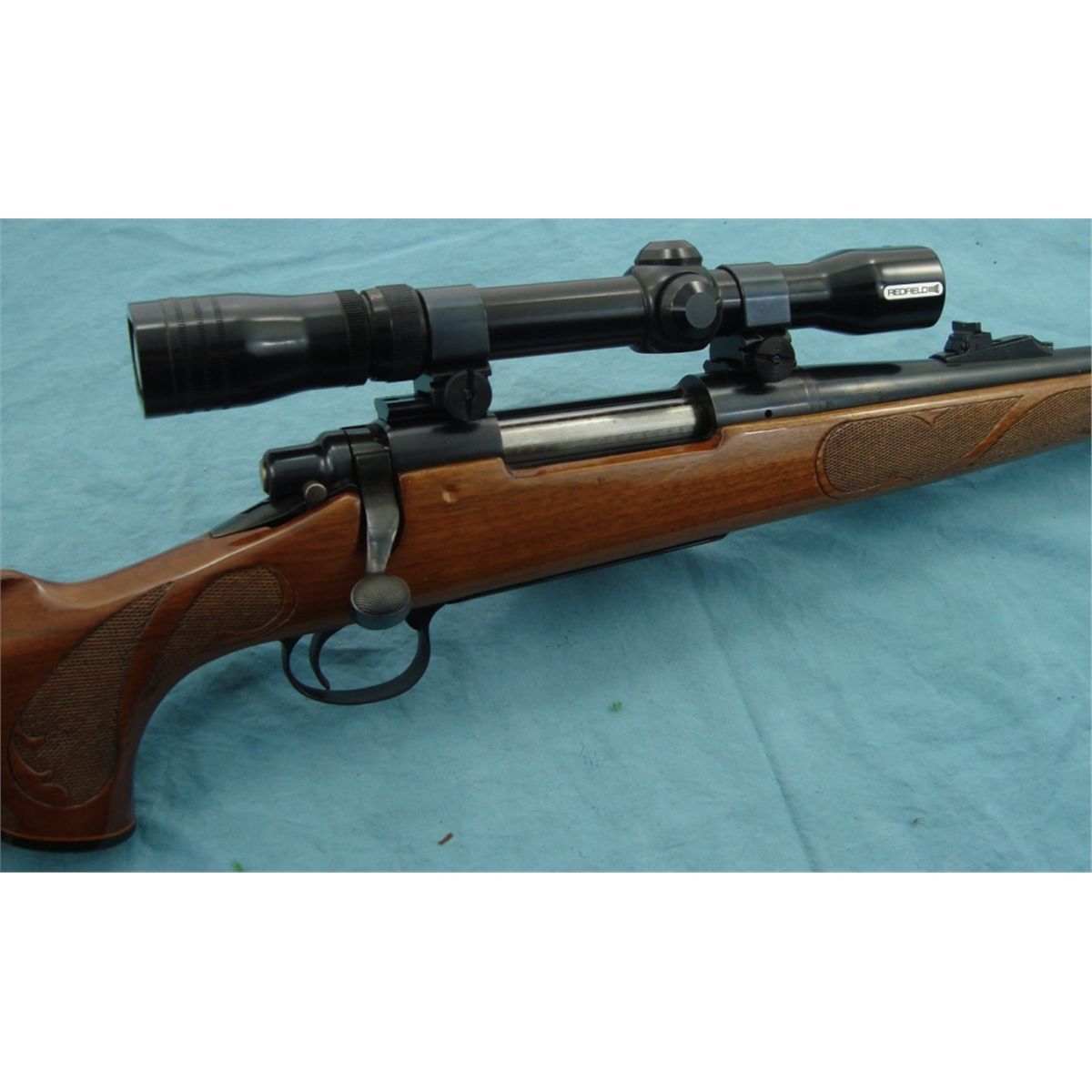 #6662828; 300 Win Mag. w/24" bbl. & blued finish. Iron sights & fitted Redfield 2x7 power wide view scope. High gloss wood stock in good condition w/some marks dents from light use.