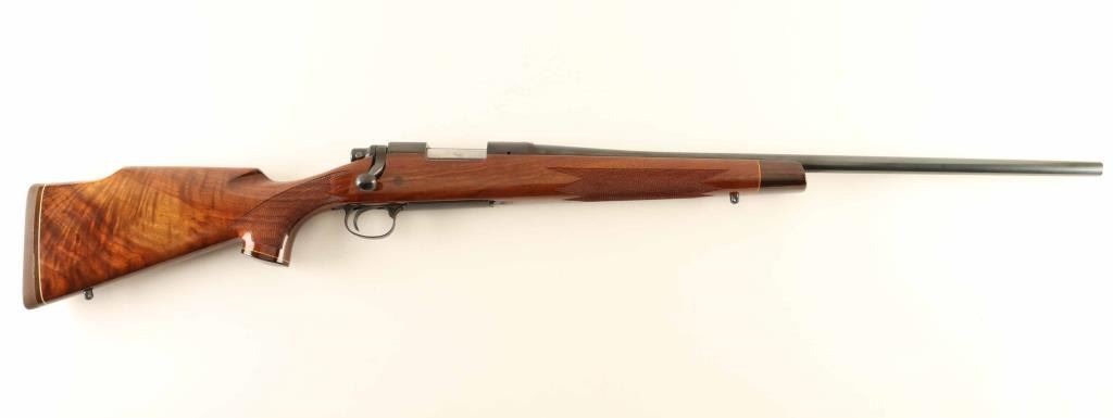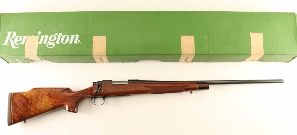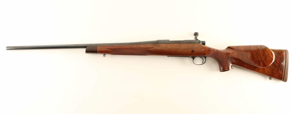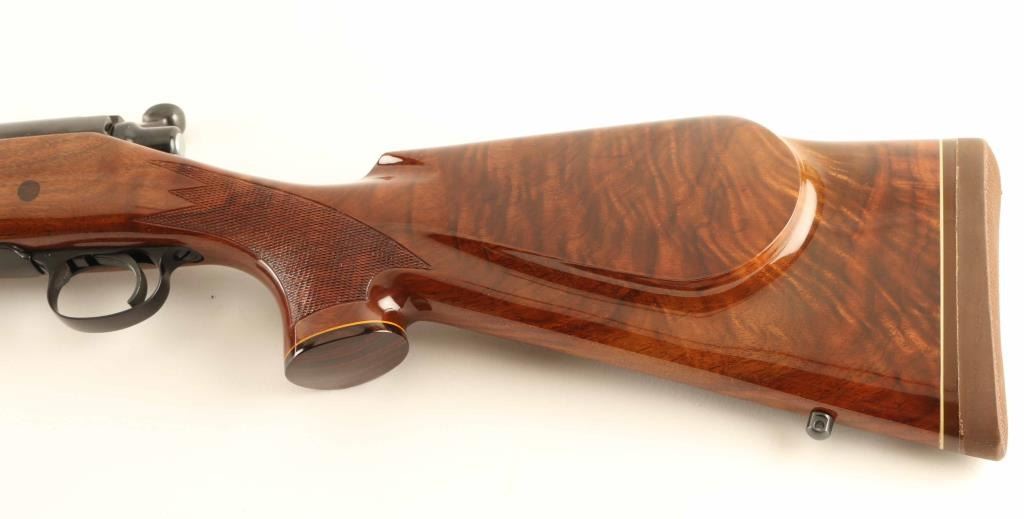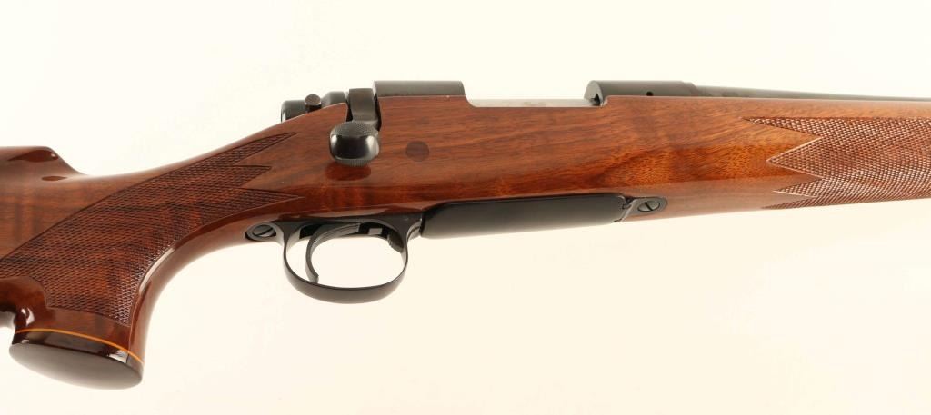 'Custom' High quality American made bolt action sporting rifle chambered in .308 Winchester, manufactured circa 1975. Features a blued finish, 24" tapered barrel without provisions for sights, factory drilled & tapped receiver, adjustable wide serrated trigger, jeweled bolt with knurled knob, two-position safety on the right side of the receiver, internal box magazine with hinged floorplate, and hand checkered figured walnut Monte Carlo stock with high gloss finish, right handed cheek rest, swivel studs, forend/grip caps & factory recoil pad. The barrel is stamped simply with the caliber and barrel codes only. Includes the original factory cardboard box with manual, sling swivels and "ARMY-NAVY STORE" hang tag with a $473.95 price. Rifle exhibits approximately 99%+ of it's original blued finish showing little to no visible wear. Action is smooth, the bore is pristine and the wood stock is fine. Condition is like NRA Perfect in box. ***Modern Firearm***