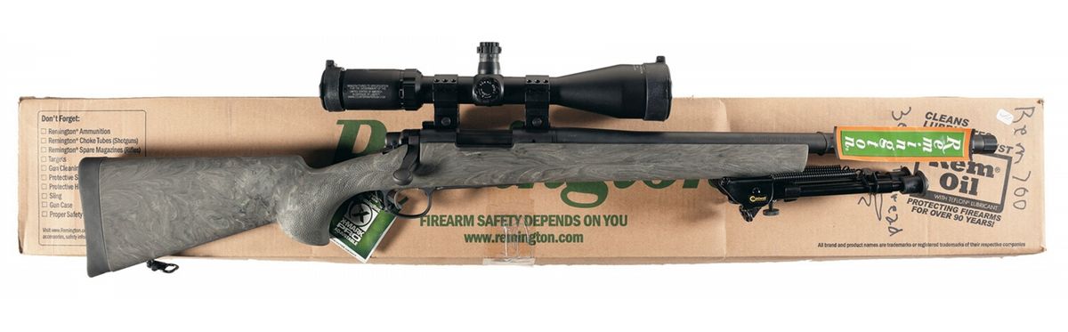 Manufactured with the barrel threaded for a suppressor with a screw on cover, 1 in 10 inch twist rifling, adjustable trigger and drilled and tapped for scope mounts. Attached to the receiver are scope mounts and rings with a Countersniper 3-12x50mm illuminated scope with flip up lens covers. Mounted on a "Ghillie" green Hogue overmolded stock with sling studs, Caldwell bipod and a factory recoil pad. With box numbered to gun.