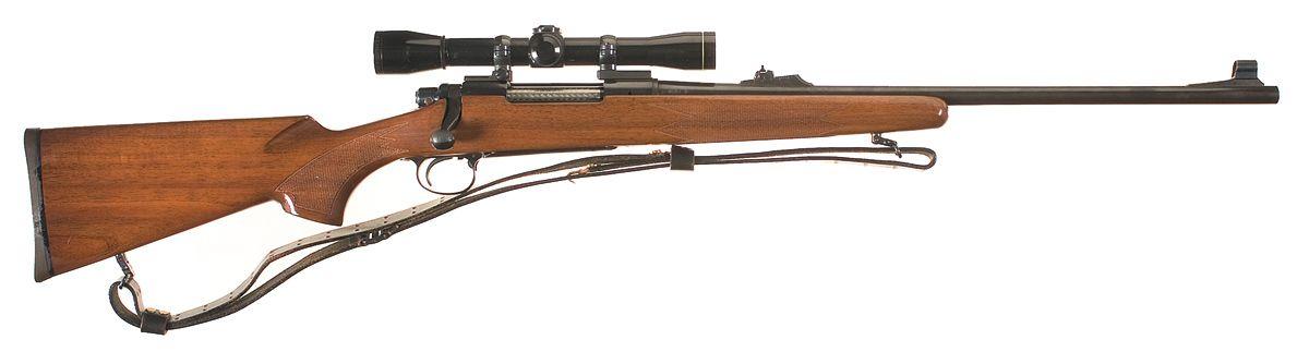Standard markings, hooded ramp front sight, adjustable rear ramped sight, Leupold M8-4X scope and mounted with a checkered pistol grip stock with a Remington recoil pad and black leather military style sling.