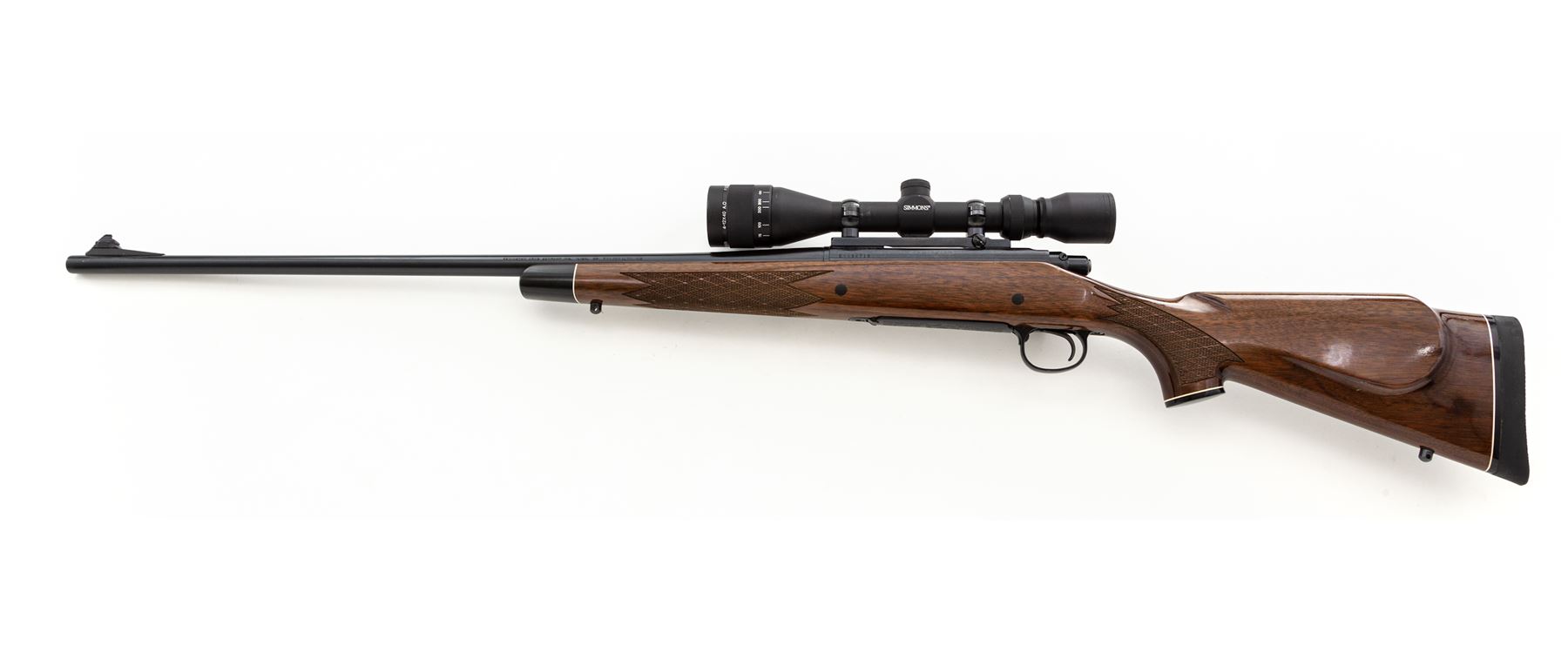 Factory Engraved Remington Model 700 BDL Custom Deluxe Bolt Action Rifle, with Simmons scope, #E6692719, 7mm Rem. Ultra Mag. cal., 26'' barrel; one-piece gloss finished Monte Carlo stock made of American walnut, with cheekpiece, skipline checkering at the wrist and forend, ebony forend and grip cap, sling swivel studs, with 13.25'' LOP over black rubber Remington recoil pad. Receiver with fine line scroll engraving; floorplate is also scroll engraved with a Bighorn sheep in the center. Blade front sight is dovetailed into a fixed base, rear sight has been removed and is missing the factory screws. Topped with a Simmons 4-12x40 A.O. scope on Leupold rings; scope with duplex reticle, matte black finish, and original lens covers. Rifle is in excellent overall condition with approx. 99% remaining original finish; triggerguard with a few spots of slight edgewear. Stock shows a few shallow impressions and small handling mark, most noticeable on the left side below the back of the receiver; checkering is sharp and unmarred. Engraving and factory lettering is clear. Smooth action, bright bore with crisp defined rifling. Scope exterior with a few scattered slight handling marks and surface scuffs; optics are bright and clear. Est.: $700-$1,000. (Modern)