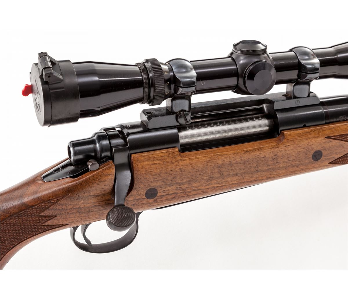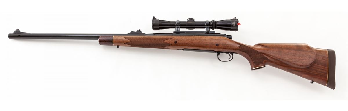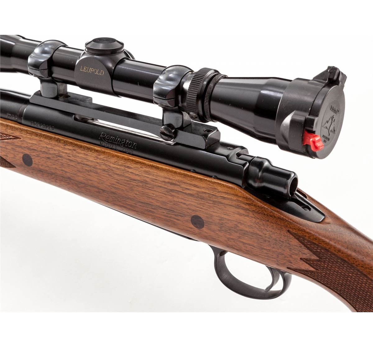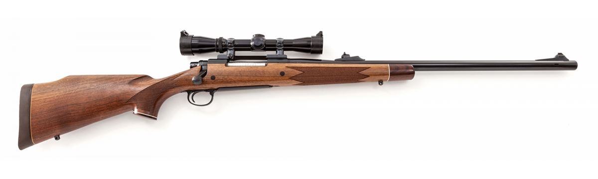 Remington Model 700 Magnum Bolt Action Rifle, #B6243423, .375 H&H mag. cal., 24'' magna-ported barrel, blue finish, factory checkered walnut stock with rosewood forend and pistol-grip cap, as well as crossbolt plugs. Factory Remington brown rubber butt pad is retained. Topped with a Leupold 2-7x28 scope on Redfield rings and mounts. Factory iron signts are retained. Condition is excellent showing light scuffs to stock, mostly likely from handling. Action is crisp, bore is bright, scope optics are clear. Est.: $750-$1,000. (Modern)
