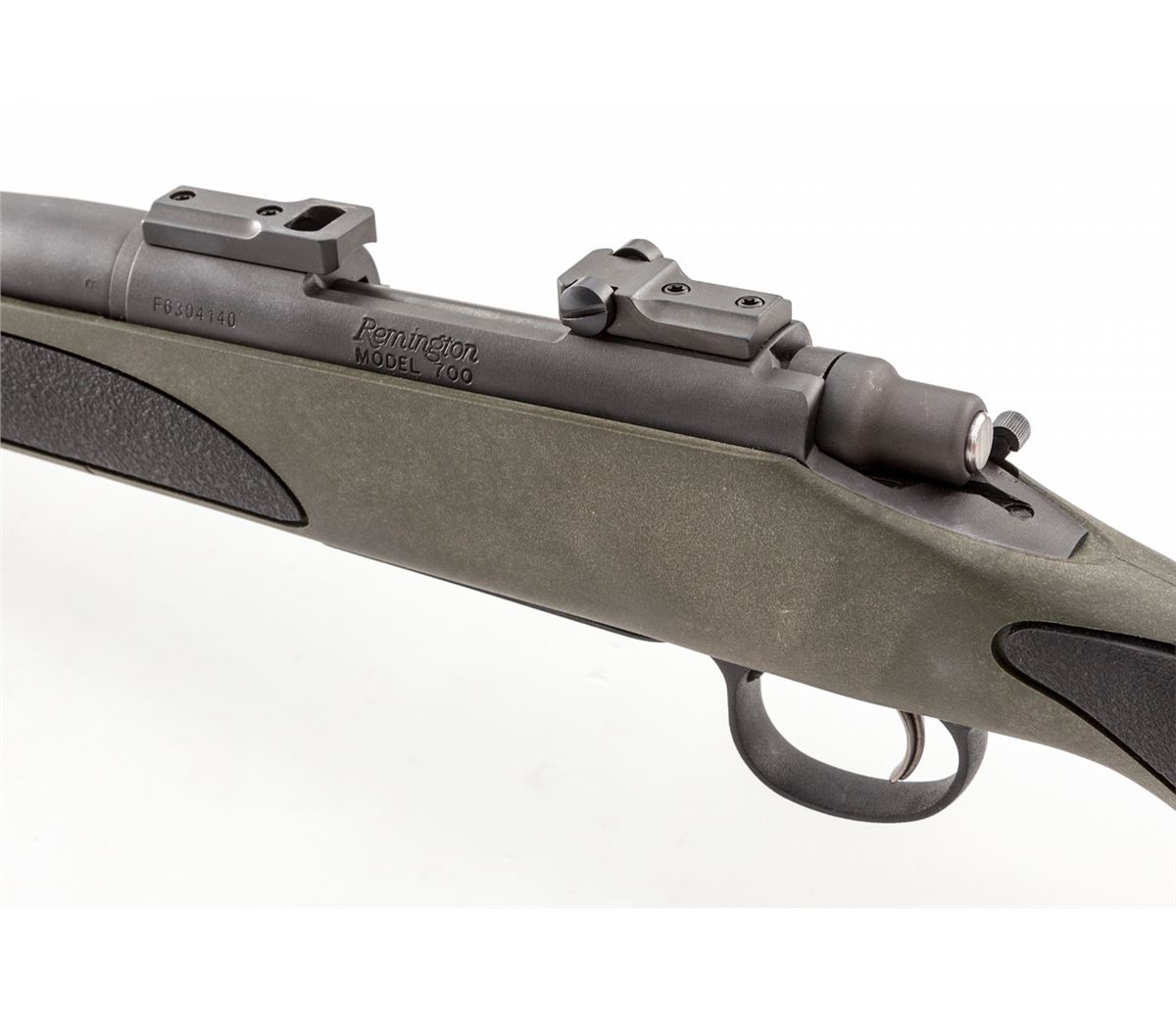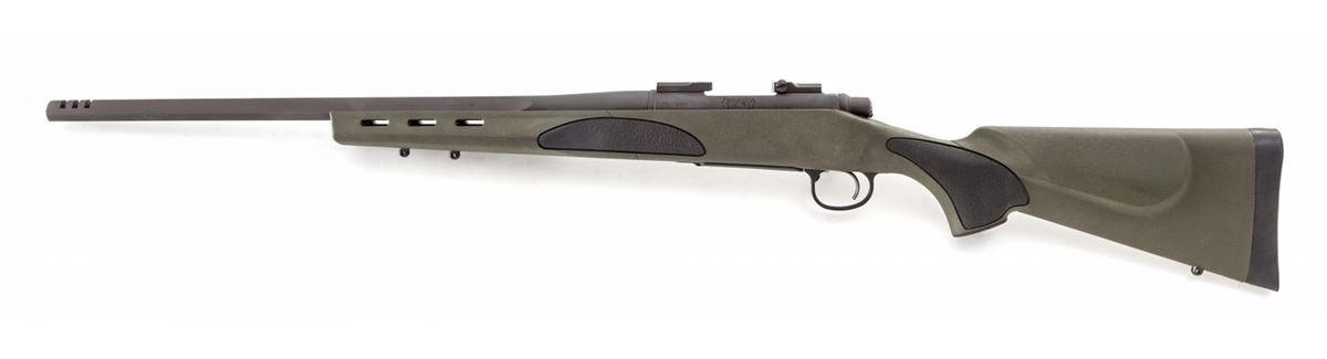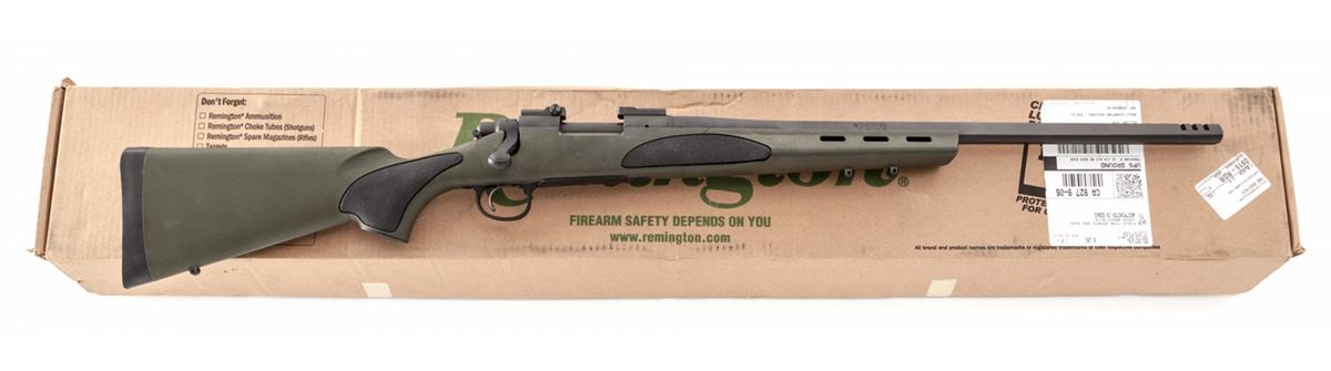 Remington Model 700 VTR Bolt Action Rifle, #F6304140, 22-250 Rem. cal., 22'' barrel with muzzle brake, matte finish, OD green with black accent pistol grip synthetic stock, adjustable trigger, Remington hard rubber recoil pad, scope bases and non-original Remington box. The condition is excellent, appearing near new. The action is crisp, bore is bright. Matte finish with light marks from handling. Est.: $500-$750. (Modern) (Field Time)