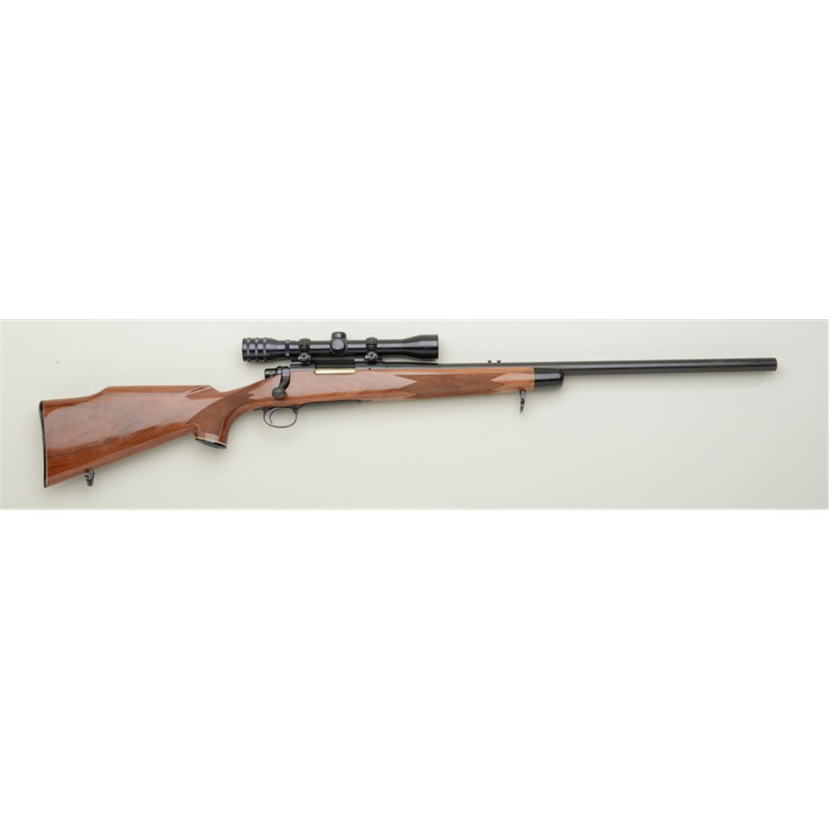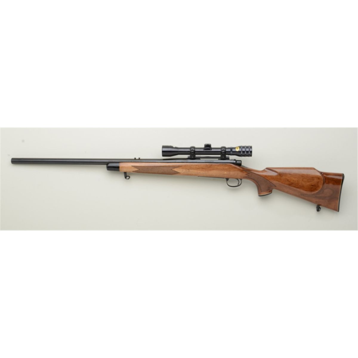 Remington Model 700 bolt-action rifle, .233 Rem. cal., 24-1/2” heavy round barrel, blue finish, checkered wood stocks, sling swivels, #A6235197; mounted with a Tasco 4X32 scope. This gun is in overall fine condition showing the majority of its original finish, jeweled bolt, crisp action, fine bore and wood stock; optics in scope are fine. Est.: $400-$800.