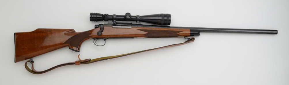 Remington Model 700 bolt action rifle, .25-06 Rem. cal., 24” round bull barrel, blue finish, checkered wood stock, leather sling, #6686841, mounted with a Redfield 4X-12X scope with good optics. This rifle is in fine condition with the majority of its original finish remaining, fine bore, crisp action and markings, fine wood with a couple minor mars and scratches from carry and storage. Est.: $350-$700.