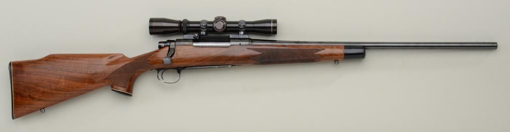 Remington Model 700 bolt-action rifle, .30-06 cal., 22” barrel, re-blued finish, checkered wood stock, #A6415609; mounted with a Leupold 2 X 7 Vari X II scope with fine optics. This gun is in overall very goodcondition as restored with a very good bore, smooth action, very good wood stock with some scattered mars from storage. Est.: $250-$500.