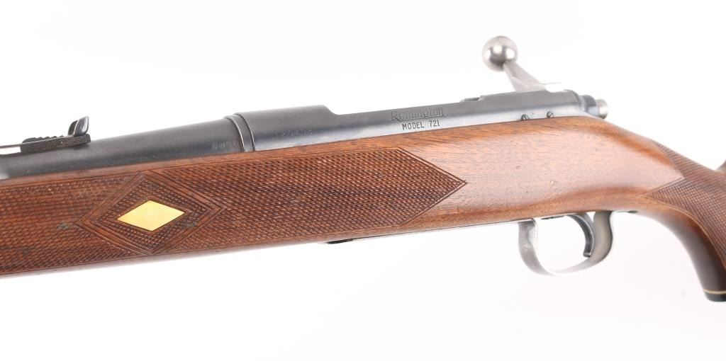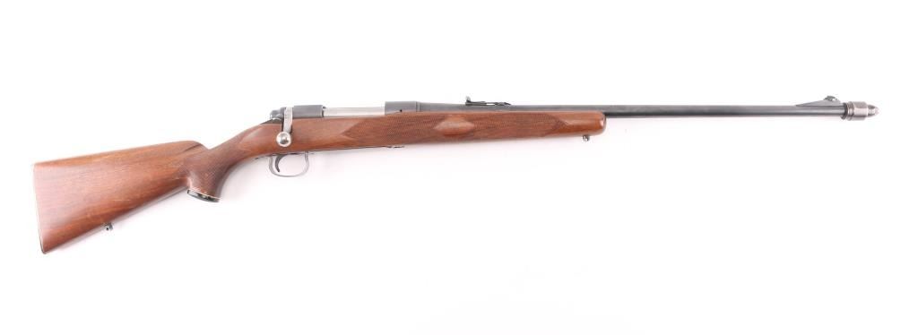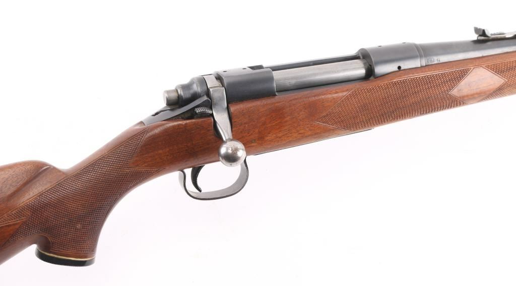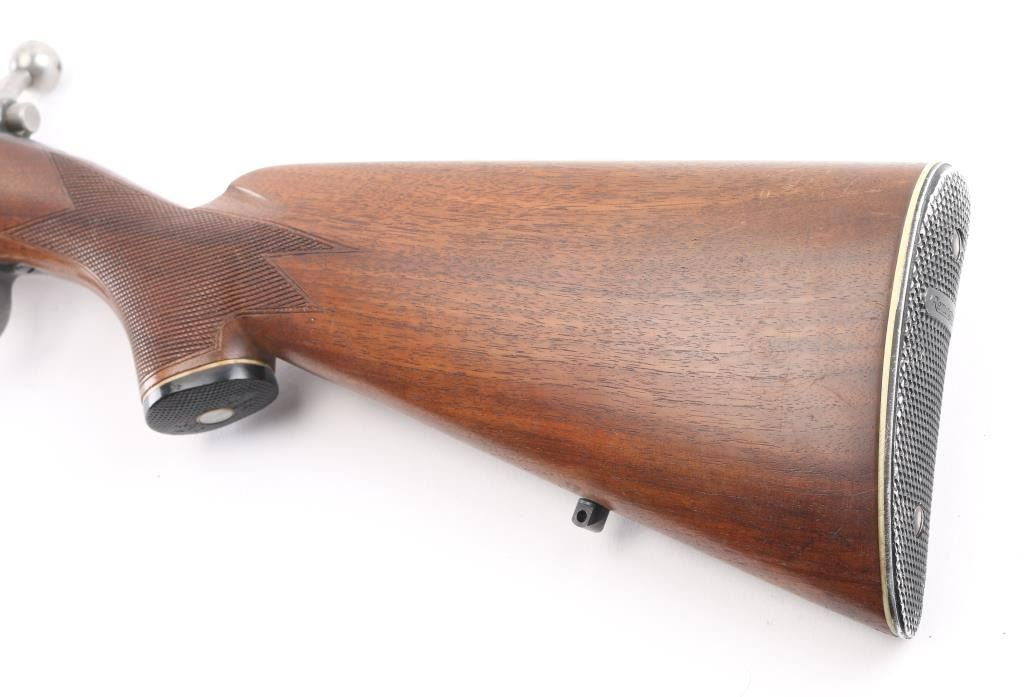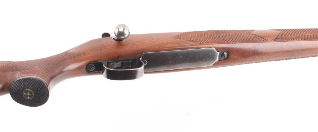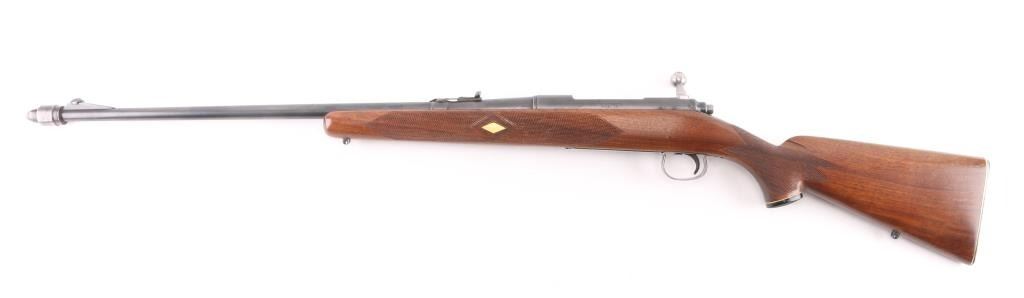 Vintage bolt action rifle circa 1950. Features blued finish, bright metal bolt, checkered wood stock, no cheekpiece, knurled aluminum Remington buttplate, sling studs, 24" barrel, Herter's muzzle brake, ramped base front sight with blade insert, sporting rear sight, drilled & tapped on receiver top, manual safety, checkered plastic grip cap with compass in center. Bore is very good. Retains 85% blue, thinning or fading a bit, edge losses, scratches & scuffs several places. Wood is very good condition with scratches and scuffs. Condition is NRA Very Good++ *** C&R Firearm ***