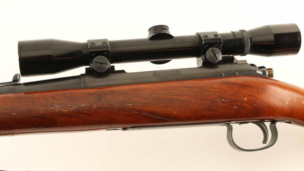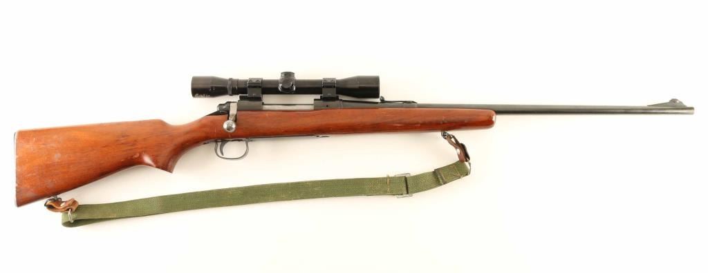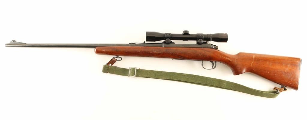 Rifle, bolt-action. Blued finish. Wood, pistol-grip stock. Chrome bolt. 23' barrel. bore appears good, but dirty. Action is smooth/tight. 5-rd magazine. Blued finish is about 95%, with some minor scratches. Wood has numerous scrapes/scratches. Mounted with a United 4x32 scope. Clear optics. Green web SKS sling attached. Needs some TLC. NRA Condition-Very good. Modern firearm.