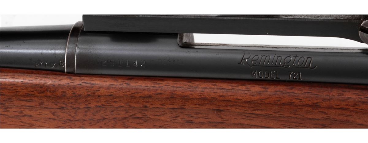 Remington Model 721 Bolt Action Rifle, #251142, .270 cal., 24'' barrel, blue finish, pistol-grip walnut stock with factory aluminum buttplate and commercial leather sling. Topped with a Hunter 4x32 scope on Redfield rings and mounts. Condition is fine retaining approx. 95% original thinning blue. Stock with light scuffs. Japanese scope with crosshair reticle shows crisp optics. Action is good, bore is fine. Est.: $350-$500. (C&R)