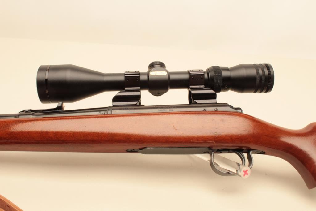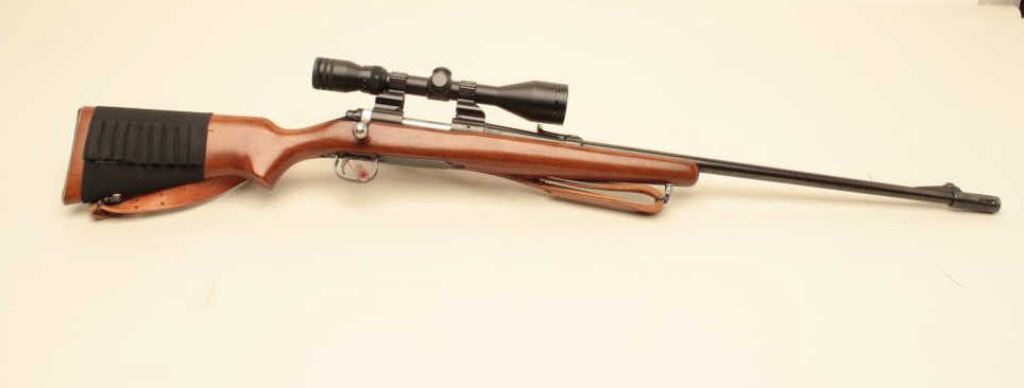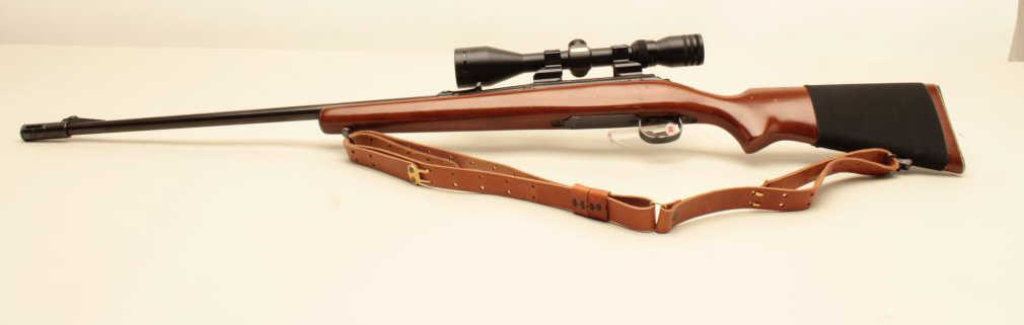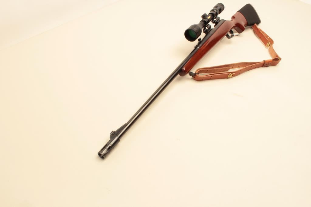 break, blued finish, wood stock, leather sling, S/N 389063, in overall very good to fine condition, with a near fine bore, crisp action, sharp markings and very good stock; mounted with a Simmons 3-10x44 scope displaying crisp optics. (Modern). Est.: $150-$300.