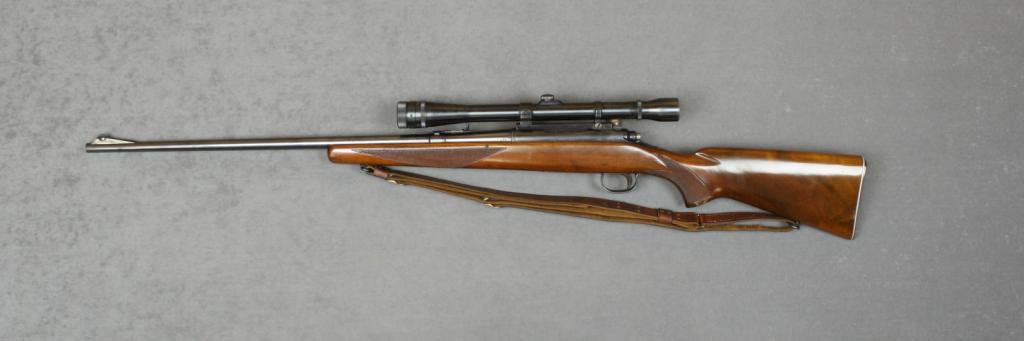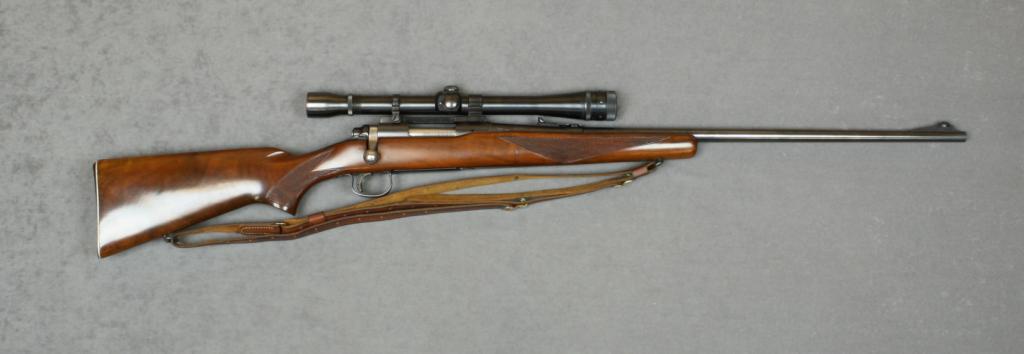 Remington Model 722B bolt-action rifle, .222  Rem. cal., 26” round barrel, blue finish,  checkered wood stock, leather sling, Weaver  K10 scope with Redfield scope mount, #274759.  This rifle is in overall fine conditionshowing the majority of its original finish,  fine bore, action, markings and wood stock;  very good optics.  Est.:  $300-$600.