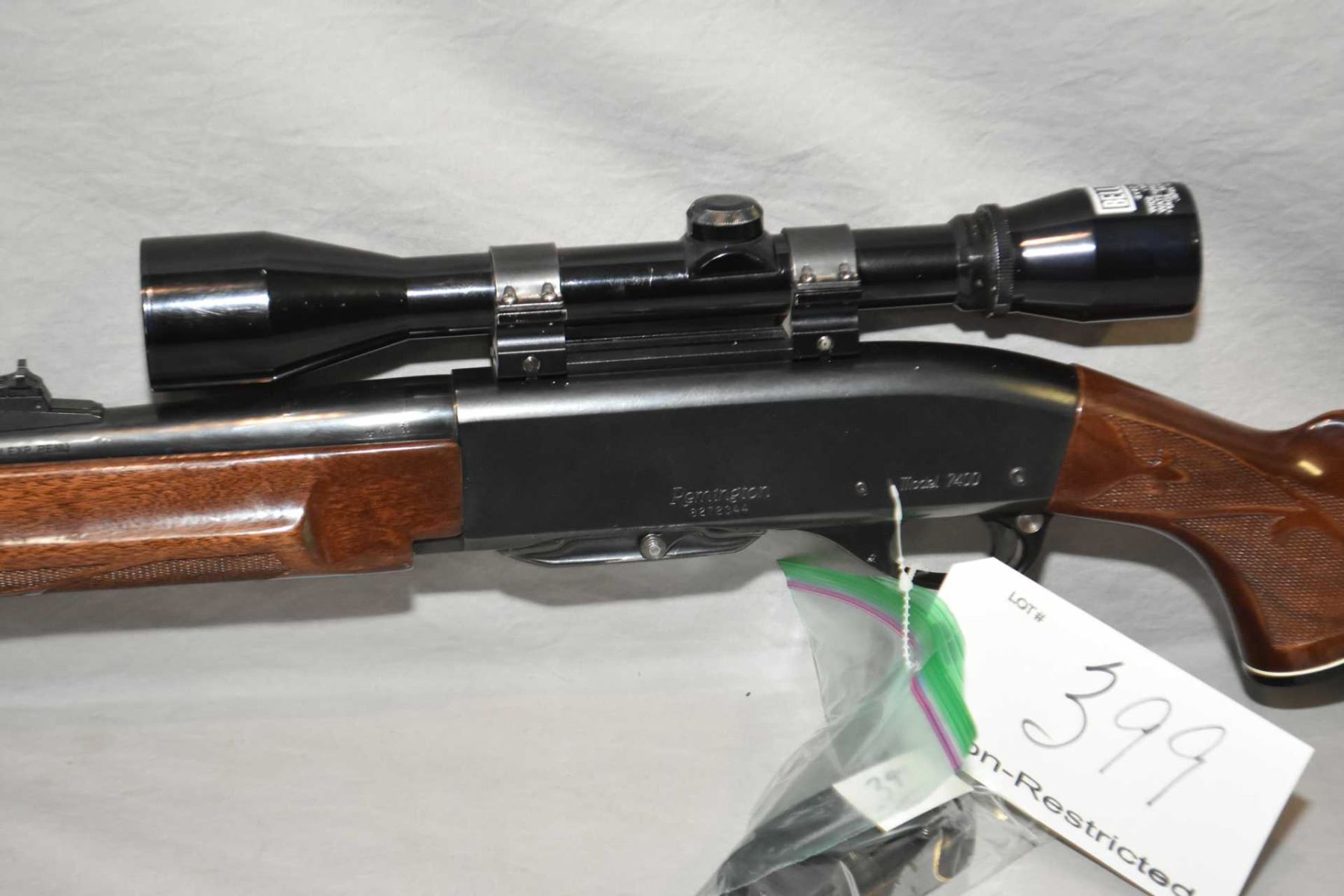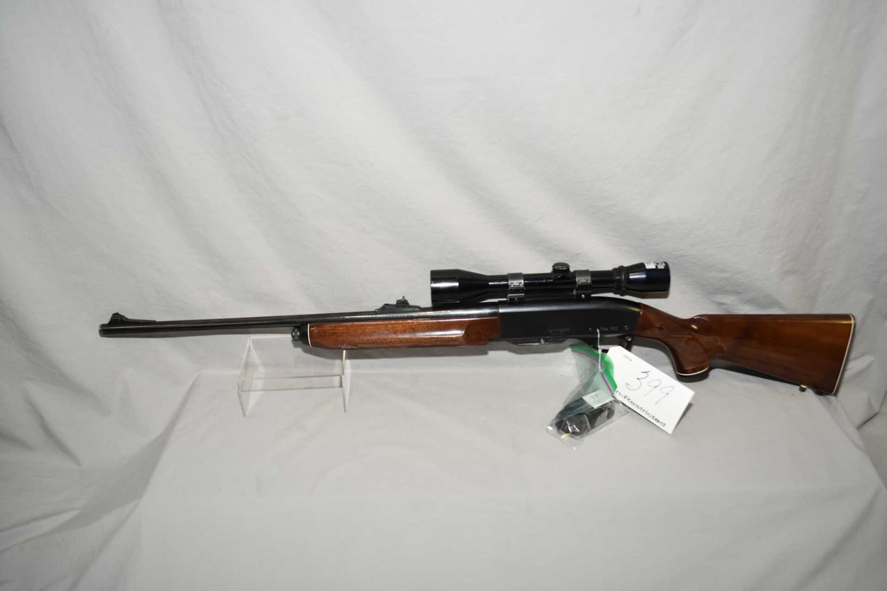 Remington Model 7400 .280 Rem / .7 MM EXP. REM. Cal Mag Fed Semi Auto Rifle w/ 22" bbl [ blued finish, barrel sights, also fitted w/ Bell 4 x 40 Wide Angel scope, in Weaver rings with base, high gloss finish, few slight marks, pressed checkered Flur de Les pistol grip stock & forend with black caps, sling studs, and extra mag ] Ser # 8272344